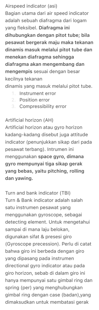 Airspeed indicator (asi) Bagian utama dari air speed indicator adalah sebuah diafragma dari logam yang fleksibel. Diafragma ini dihubungkan dengan pitot tube; bila pesawat bergerak maju maka tekanan dinamis masuk melalui pitot tube dan menekan diafragma sehingga diafragma akan mengembang dan mengempis sesuai dengan besar kecilnya tekanan dinamis yang masuk melalui pitot tube. . Instrument error . Position error . Compressibility error Artificial horizon (AH) Artificial horizon atau gyro horizon kadang-kadang disebut juga attitude indicator (penunjukkan sikap dari pada pesawat terbang). Intrumen ini menggunakan space gyro, dimana gyro mempunyai tiga sikap gerak yang bebas, yaitu pitching, rolling dan yawing. Turn and bank indicator (TBI) Turn & Bank indicator adalah salah 2 3 satu instrumen pesawat yang 1 menggunakan gyroscope, sebagai detecting element. Untuk mengetahui sampai di mana laju belokan, digunakan sifat & presesi giro (Gyroscope precession). Perlu di catat bahwa giro ini berbeda dengan giro yang dipasang pada instrumen directional gyro indicator atau pada giro horizon, sebab di dalam giro ini hanya mempunyai satu gimbal ring dan spring (per) yang menghubungkan gimbal ring dengan case (badan),yang dimaksudkan untuk membatasi gerak pada sumbunya. Altimeter Menunjukan ketinggian pesawat terhadap permukaan air laut. Penunjukan altimeter diperoleh dengan mengukur perbedaan tekanan antara kapsul aneroid didalam altimeter dengan tekanan luar yang didapat dari port static Directional gyro indicator (DGI) Giro disanggah oleh gabungan dua buah kopling universal dan mekanisme yang diletakkan pada case (tempat) yang kedap udara dan vakum yang diisap oleh pompa isap (vacuum pompa) yang dipasang pada mesin pesawat atau tabung venturi (ventury tube) yang dipasang di bagian luar pesawat terbang. Udara masuk rumah instrumen (instrument case) melalui saringan udara (air filter), saluran dan jet nozzle yang digunakan untuk memutar giro rotor, dial (plat penunjuk) yang terdapat pada direktional Giro Indicator adalah suatu plat logam yang digambarkan sesuai kompas magnet yang mempunyai derajat 3600. Pilot dapat melihat dial (pembagian kartu) yang terpasang secara tegak lurus sebagai tanda (angka) pembacaan, dan garis penuntun (lubber line) sebagai pedoman pembacaan dalam penggunaan directional gyro indicator, seperti halnya pada magnet kompas. Jika pitot tertutup altimeter, air speed indicator dan vertical speed indicator(VSI) akan mati C OF A C OF R RADIO PERMIT POH WEIGHT AND BALANCE ARROW TAKE OFF RUNWAY AVAILABLE (TORA) TORA is defined as length of runway suitable for normal operations. It need not always equal to LDA (landing distance available). TORA doesn’t include Stopway or Clearway. TAKE OFF DISTANCE AVAILABLE (TODA) TODA is the length of runway plus any clearway if available. In case no clearway exists, TODA is same as TORA. TODA includes ground as well as air segments. ACCELERATE STOP DISTANCE AVAILABLE (ASDA) ASDA is used for calculation of V1. It is defined as sum of LDA/TORA (as applicable) and Stopway. In case take off is aborted the aircraft can be brought to a stop either on the runway or on Stopway. ASDA must not be used as TORA. LANDING DISTANCE AVAILABLE (LDA) LDA is the runway length declared available and suitable for landing an airplane. Clearway is the area beyond the runway not less than 152m wide centrally located about the extended centerline of the runway and under the control of airport authorities. Clearway is expressed as a plane extending from the end of runway with up slop not exceeding 1.25% above which no object or terrain protrudes with exception of threshold lights. Stopway is the area at the end of takeoff runway no less wide than the runway and centered upon extended centerline of runway and able to support the aeroplane during an aborted take-off without causing structural damage to the aeroplane. Runway End Safety Areas (RESA) are a formal means to limit the consequences when aeroplanes overrun the end of a runway during a landing or a rejected take off, or undershoot the intended landing runway. Minimum sector altitude (MSA) Minimum descent altitude (MDA) Minimum off route altitude (MORA) Batas keluar track pesawat 10nm kekanan maupun kekiri Minimum obstacles cleareance altitude (MOCA) (22nm of the vor) Minimum enroute altitude (MEA) Density and temperature to performance Automatic terminal information service (ATIS) Meteorologi aerodrome report (METAR) Laporan cuaca yang dibuat 1/2 sampai 1 jam sekali Terminal aerodrome forecast (TAF) Perkiraan cuaca di sekitar bandara yang dibuat 6jam sekali Route forecast (ROFOR) TEMPO Temporary fluctuation in some of the elements lasting for periods of 30 minutes or more but not longer than one hour CAVOK Ceilings and visibility ok – – Visibility more than 10km No clouds below 5000ft Runway visibility range (RVR) – – – – fog (FG) Rain (RA) Thunderstorm (TS) Mist (BR) Amounts of cloud – – – – FEW 1/8 - 2/8 SCT SCATTERED 3/8 - 4/8 BKN (BROKEN) 5/8 - 7/8 OVC OVERCAST 8/8 WINDSHEAR Perubahan arah dan kecepatan angin secara tiba - tiba Gusty Udara yang bergerak tidak beraturan dalam jangka waktu yang pendek Micorburst downdraft yang sangat kuat Clear air turbulence (CAT) INTERNATIONAL STANDARD ATMOSPHERE (ISA) 29.92 / 1013 15 derajat celcius Air density decrease = performance decrease Temperature decrease = performance increase More altitude less density Dew point adalah titik embun udara artinya suhu di mana udara mulai mengembun menimbulkan titik-titik air The 4 Forces of Flight. In level flight, lift equals weight and thrust equals drag when the plane flies at constant velocity. Maintaining a steady flight requires a balance, often described as an equilibrium of all the forces acting upon an airplane. Weight, lift, thrust and drag are the acting forces on an airplane. L = Lift (Gaya Angkat) ρ = Air Density (Kerapatan Udara) CL = Coefficient of Lift S = Luas Penampang Sayap V = Velocity (Kecepatan)