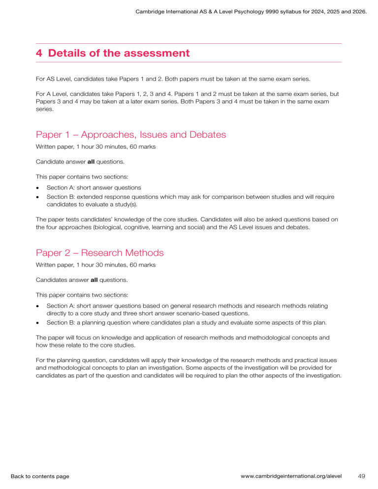Cambridge International AS & A Level Psychology 9990 syllabus for 2024, 2025 and 2026. 4 Details of the assessment For AS Level, candidates take Papers 1 and 2. Both papers must be taken at the same exam series. For A Level, candidates take Papers 1, 2, 3 and 4. Papers 1 and 2 must be taken at the same exam series, but Papers 3 and 4 may be taken at a later exam series. Both Papers 3 and 4 must be taken in the same exam series. Paper 1 – Approaches, Issues and Debates Written paper, 1 hour 30 minutes, 60 marks Candidate answer all questions. This paper contains two sections: • Section A: short answer questions • Section B: extended response questions which may ask for comparison between studies and will require candidates to evaluate a study(s). The paper tests candidates’ knowledge of the core studies. Candidates will also be asked questions based on the four approaches (biological, cognitive, learning and social) and the AS Level issues and debates. Paper 2 – Research Methods Written paper, 1 hour 30 minutes, 60 marks Candidates answer all questions. This paper contains two sections: • Section A: short answer questions based on general research methods and research methods relating directly to a core study and three short answer scenario-based questions. • Section B: a planning question where candidates plan a study and evaluate some aspects of this plan. The paper will focus on knowledge and application of research methods and methodological concepts and how these relate to the core studies. For the planning question, candidates will apply their knowledge of the research methods and practical issues and methodological concepts to plan an investigation. Some aspects of the investigation will be provided for candidates as part of the question and candidates will be required to plan the other aspects of the investigation. Back to contents page www.cambridgeinternational.org/alevel 49 Cambridge International AS & A Level Psychology 9990 syllabus for 2024, 2025 and 2026. Details of the assessment Planning studies for Paper 2 Candidates should be able to: plan studies to include general features: procedure of the study how the plan makes the study valid how the plan makes the study reliable types of data plan studies using specific research methods to include required features: experiments additionally for field experiments: self-reports additionally, for questionnaires: additionally, for interviews: independent variable dependent variable controls / standardisation choice of experimental design location question format (open and closed questions) examples of questions question scoring / interpretation technique (paper and pencil, online) format (structured, unstructured, semi-structured) technique (face-to-face, telephone) case studies details about the participant / unit content of information collected two or more techniques for data collection analysis / interpretation / triangulation observational studies overt / covert participant / non-participant naturalistic / controlled structured (behavioural categories) / unstructured correlational studies two co-variables measure of variable 1 measure of variable 2 nature of the relationship / scatter graph longitudinal studies including experiments with a longitudinal design tests / tasks scoring frequency / interval re-contacting of participants (for repeated testing) controls / standardisation evaluate the planned study in terms of: practical / methodological issues validity reliability Candidates will not be expected to include aims or hypotheses in their plan. Candidates will not be expected to evaluate issues relating to the sample/generalisability or ethics of their plan. Back to contents page www.cambridgeinternational.org/alevel 50