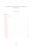 Test of Mathematics for University Admission, 2020 Paper 1 Worked Solutions Version 1.0, April 2021 Contents Introduction for students . . . . . . . . . . . . . . . . . . . . . . . . . . . . . . . . . . 2 Question 1 . . . . . . . . . . . . . . . . . . . . . . . . . . . . . . . . . . . . . . . . . . 3 Question 2 . . . . . . . . . . . . . . . . . . . . . . . . . . . . . . . . . . . . . . . . . . 4 Question 3 . . . . . . . . . . . . . . . . . . . . . . . . . . . . . . . . . . . . . . . . . . 5 Question 4 . . . . . . . . . . . . . . . . . . . . . . . . . . . . . . . . . . . . . . . . . . 6 Question 5 . . . . . . . . . . . . . . . . . . . . . . . . . . . . . . . . . . . . . . . . . . 7 Question 6 . . . . . . . . . . . . . . . . . . . . . . . . . . . . . . . . . . . . . . . . . . 8 Question 7 . . . . . . . . . . . . . . . . . . . . . . . . . . . . . . . . . . . . . . . . . . 9 Question 8 . . . . . . . . . . . . . . . . . . . . . . . . . . . . . . . . . . . . . . . . . . 10 Question 9 . . . . . . . . . . . . . . . . . . . . . . . . . . . . . . . . . . . . . . . . . . 11 Question 10 . . . . . . . . . . . . . . . . . . . . . . . . . . . . . . . . . . . . . . . . . . 12 Question 11 . . . . . . . . . . . . . . . . . . . . . . . . . . . . . . . . . . . . . . . . . . 13 Question 12 . . . . . . . . . . . . . . . . . . . . . . . . . . . . . . . . . . . . . . . . . . 14 Question 13 . . . . . . . . . . . . . . . . . . . . . . . . . . . . . . . . . . . . . . . . . . 15 Question 14 . . . . . . . . . . . . . . . . . . . . . . . . . . . . . . . . . . . . . . . . . . 16 Question 15 . . . . . . . . . . . . . . . . . . . . . . . . . . . . . . . . . . . . . . . . . . 17 Question 16 . . . . . . . . . . . . . . . . . . . . . . . . . . . . . . . . . . . . . . . . . . 18 Question 17 . . . . . . . . . . . . . . . . . . . . . . . . . . . . . . . . . . . . . . . . . . 19 Question 18 . . . . . . . . . . . . . . . . . . . . . . . . . . . . . . . . . . . . . . . . . . 20 Question 19 . . . . . . . . . . . . . . . . . . . . . . . . . . . . . . . . . . . . . . . . . . 21 Question 20 . . . . . . . . . . . . . . . . . . . . . . . . . . . . . . . . . . . . . . . . . . 22 © UCLES 2021 Test of Mathematics for University Admission, 2020 Paper 1 Solutions Introduction for students These solutions are designed to support you as you prepare to take the Test of Mathematics for University Admission. They are intended to help you understand how to answer the questions, and therefore you are strongly encouraged to attempt the questions first before looking at these worked solutions. For this reason, each solution starts on a new page, so that you can avoid looking ahead. The solutions contain much more detail and explanation than you would need to write in the test itself – after all, the test is multiple choice, so no written solutions are needed, and you may be very fluent at some of the steps spelled out here. Nevertheless, doing too much in your head might lead to making unnecessary mistakes, so a healthy balance is a good target! There may be alternative ways to correctly answer these questions; these are not meant to be ‘definitive’ solutions. The questions themselves are available on the ‘Preparing for the test’ section on the Admissions Testing website. Version 1.0, April 2021 Page 2 © UCLES 2021 Test of Mathematics for University Admission, 2020 Paper 1 Solutions Question 1 We start by writing the expression as a sum of powers of x: 3 1 3 1 x 2 − 5x 2 x3 − 5x2 x3 − 5x2 √ = = = 12 x 2 − 52 x 2 3 2 2x x 2x 2 We can now differentiate this expression to get 1 5 3 12 1 − 12 2 × 2x − 2 × 2x We now need to convert this into the form given in the options, so we write it as √ 5 √ 3 x 3x 5 3x − 5 5 3 4 √ = − √ = √ − √ = √ 4 x− 4 x 4 x 4 x 4 x 4 x which is option C. Version 1.0, April 2021 Page 3 © UCLES 2021 Test of Mathematics for University Admission, 2020 Paper 1 Solutions Question 2 We can use the factor theorem here. If we write f(x) = 2x3 + px2 + q, then the question tells us that f(− 21 ) = 0 and f(2) = 0. Substituting these in gives − 14 + 41 p + q = 0 16 + 4p + q = 0 We can subtract the first equation from the second to cancel the qs, giving 65 15 4 + 4 p=0 13 48 52 4 so p = − 65 15 = − 3 . Therefore q = −16 − 4p = − 3 + 3 = 3 . 4 22 It follows that 2p + q = − 26 3 + 3 = − 3 , which is option C. Version 1.0, April 2021 Page 4 © UCLES 2021 Test of Mathematics for University Admission, 2020 Paper 1 Solutions Question 3 We first work on each inequality separately. Each one is a product of factors, so we consider when each factor is positive or negative. For the first inequality, (x + 4)(x + 3)(1 − x) > 0, we have the following table: x < −4 −4 < x < −3 −3 < x < 1 x>1 (x + 4) − + + + (x + 3) − − + + (1 − x) + + + − product + − + − Thus the first inequality holds when x < −4 and when −3 < x < 1. Likewise for the second inequality, (x + 2)(x − 2) < 0: x < −2 −2 < x < 2 x>2 (x + 2) − + + (x − 2) − − + product + − + Therefore the second inequality holds when −2 < x < 2. We can combine these by illustrating them on a number line: −5 −4 −3 −2 −1 0 1 2 3 4 x Combining these two conditions, they both hold when −2 < x < 1, which is option B. Version 1.0, April 2021 Page 5 © UCLES 2021 Test of Mathematics for University Admission, 2020 Paper 1 Solutions Question 4 Let the arithmetic progression have first term a and common difference d. Let the geometric progression have first term a (as the first term of the geometric progression is the same as the first term of the arithmetic progression) and common ratio r. Then the first three terms of the geometric progression are a, ar and ar2 , while the 1st, 4th and 6th terms of the arithmetic progression are a, a + 3d and a + 5d. Therefore ar = a + 3d and ar2 = a + 5d. The next piece of information we are given is that the sum to infinity of the geometric progression a is 12