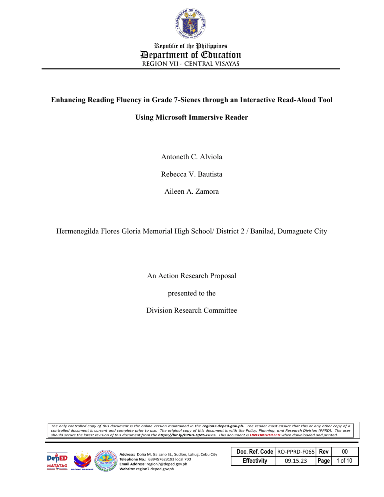 Enhancing Reading Fluency in Grade 7-Sienes through an Interactive Read-Aloud Tool Using Microsoft Immersive Reader Antoneth C. Alviola Rebecca V. Bautista Aileen A. Zamora Hermenegilda Flores Gloria Memorial High School/ District 2 / Banilad, Dumaguete City An Action Research Proposal presented to the Division Research Committee The only controlled copy of this document is the online version maintained in the region7.deped.gov.ph. The reader must ensure that this or any other copy of a controlled document is current and complete prior to use. The original copy of this document is with the Policy, Planning, and Research Division (PPRD). The user should secure the latest revision of this document from the https://bit.ly/PPRD-QMS-FILES. This document is UNCONTROLLED when downloaded and printed. Doc. Ref. Code RO-PPRD-F065 Rev Effectivity 09.15.23 Page 00 1 of 10 TABLE OF CONTENTS Title page i Table of Contents ii Chapter 1: Chapter 2: INTRODUCTION Context and Rationale iii Action Research Question iv Proposed Strategy v ACTION RESEARCH METHODS Research Design vi Participants vii Data Gathering Procedure viii Data Analysis Plan ix Ethical Considerations x REFERENCES APPENDICES Action Research Questionnaire/ Tool xi Work Plans and Timelines for Research Implementation xii Cost Estimates for Action Research Implementation xiii Plans for Dissemination, Utilization, and Advocacy xiv Transmittal Letter for Research Implementation xv Application Form and Endorsement of Immediate Supervisor(s) of the Proponent(s) Declaration of Anti-Plagiarism xvi Declaration of Absence of Conflict of Interest xviii Research Proponents’ Profile xix Criteria Guide for Appraising Action Research Proposal xx xvii The only controlled copy of this document is the online version maintained in the region7.deped.gov.ph. The reader must ensure that this or any other copy of a controlled document is current and complete prior to use. The original copy of this document is with the Policy, Planning, and Research Division (PPRD). The user should secure the latest revision of this document from the https://bit.ly/PPRD-QMS-FILES. This document is UNCONTROLLED when downloaded and printed. Doc. Ref. Code RO-PPRD-F065 Rev Effectivity 09.15.23 Page 00 2 of 10 Chapter 1 INTRODUCTION Context and Rationale Reading fluency is a cornerstone skills essential for academic success, critical thinking, and lifelong learning. Struggling readers often face barriers that hinder their ability to grasp key concepts, engage in discussions, and perform well across various subjects. These challenges can lead to decreased self-confidence, limited participation, and overall disengagement from the learning process. Research indicates that early intervention is crucial in addressing reading difficulties to prevent long-term academic challenges (Fujita, 2024). During a Learning Action Cell (LAC) session, the proponents identified significant challenges in English classes, particularly in the administration of the Philippine Informal Reading Inventory (Phil-IRI). Based on the results, of the 28 Grade 7-Sienes students assessed, 10 were classified under the frustration level in reading. This alarming finding highlights the urgent need for intervention to support struggling readers in improving their fluency. Studies have shown that students at the frustration level require targeted support to enhance their reading skills effectively. To address these challenges, this action research introduces the Microsoft Immersive Reader, an offline, interactive read-aloud tool designed to help students improve their reading fluency. The tool highlights the text word-by-word as it is read aloud, which allows students to visually track and connect sounds with written words. This process not only supports the The only controlled copy of this document is the online version maintained in the region7.deped.gov.ph. The reader must ensure that this or any other copy of a controlled document is current and complete prior to use. The original copy of this document is with the Policy, Planning, and Research Division (PPRD). The user should secure the latest revision of this document from the https://bit.ly/PPRD-QMS-FILES. This document is UNCONTROLLED when downloaded and printed. Doc. Ref. Code RO-PPRD-F065 Rev Effectivity 09.15.23 Page 00 3 of 10 development of reading fluency but also enhances comprehension and engagement by integrating auditory and visual learning experiences. According to Johnson (2023), the Microsoft Immersive Reader facilitates students’ ability to follow along with text, improving their comprehension and overall fluency. The interactive features of the tool have been shown to be particularly beneficial for struggling readers, as it accommodates both auditory and visual learning preferences, fostering a deeper understanding of the material. Furthermore, a study by Smith and Taylor (2022) demonstrated that students who utilized the Microsoft Immersive Reader experienced significant improvements in reading fluency compared to those who did not use the tool. This research suggests that the integration of such interactive tools not only boosts students’ reading skills but also enhances their engagement and motivation—critical factors in overcoming reading difficulties. By incorporating the Microsoft Immersive Reader into classroom instruction, this study aims to provide Grade 7-Sienes students with an accessible, effective, and engaging tool to enhance their reading abilities and overall academic performance. Action Research Question Is the use of Microsoft Immersive Reader as an interactive read-aloud tool reduce the number of struggling readers in Grade 7-Sienes? The only controlled copy of this document is the online version maintained in the region7.deped.gov.ph. The reader must ensure that this or any other copy of a controlled document is current and complete prior to use. The original copy of this document is with the Policy, Planning, and Researc