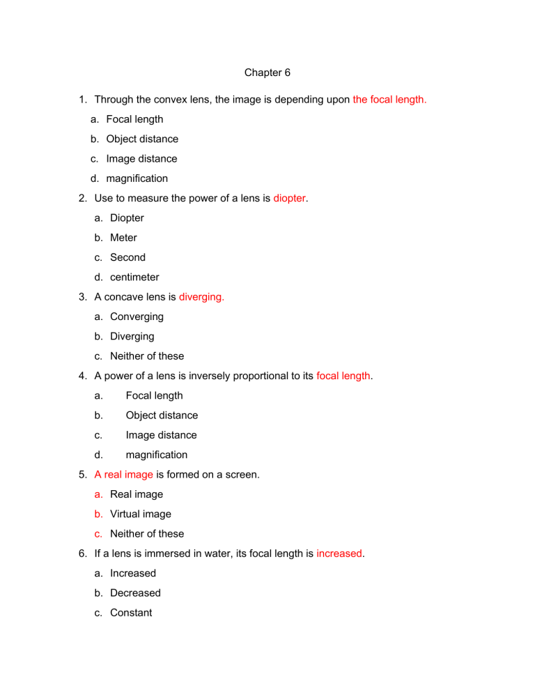 Chapter 6 1. Through the convex lens, the image is depending upon the focal length. a. Focal length b. Object distance c. Image distance d. magnification 2. Use to measure the power of a lens is diopter. a. Diopter b. Meter c. Second d. centimeter 3. A concave lens is diverging. a. Converging b. Diverging c. Neither of these 4. A power of a lens is inversely proportional to its focal length. a. Focal length b. Object distance c. Image distance d. magnification 5. A real image is formed on a screen. a. Real image b. Virtual image c. Neither of these 6. If a lens is immersed in water, its focal length is increased. a. Increased b. Decreased c. Constant d. zero 7. Diffraction and interference of light base on Huygens’ wave theory of light. a. Huygens’ b. Newton’s c. Snell’s 8. The focal length of the lens does not depend on the objective distance. a. Focal length b. Object distance c. Image distance d. magnification 9. The mirror is one focal points, whereas a lens has two. a. One b. Two c. Three d. four 10. Concave and convex lens may have considered as a made up of large number of thin prisms. a. Thick prism b. Thin prism c. Thin glass slab 11. When an object is at 2F of a convex lens the magnification is -1. a. +2 b. -1 c. -1/2 d. 0 12. A convex lens can be used as a magnifying glass. a. Convex lens b. Concave lens c. Plane mirror d. Thin glass slab 13. The magnification of concave lens is between 0 and +1. a. 0 and +1 b. 0 and -1 c. +1 and 10 d. -1 and +1 14. The focus of a convex lens is real. a. Real b. Virtual c. Neither of these 15. The power of a lens of focal length -0.2 m is -5D. a. – 5 D b. +5D c. -2D d. +10 D 16. If an object is placed at F of a concave lens the image is between P and F. a. At infinity b. Beyond 2F c. Between P and F d. At 2F 17. The virtual image formed by a convex lens is larger than the object. a. Larger than the object b. Smaller than the object c. Same size as the object 18. A converging lens of focal length F can be used as magnifying glass is the distance of the object from the lens less than F. a. Less than F b. Equal to F c. Between F and 2F 19. Convex lens is used in camera. a. Camera b. Periscope c. Light pipe 20. The lens has at least two curve surfaces. a. one b. two c. three d. four 21. A biconvex lens features _____. a. b. c. d. two concave sides two convex sides one concave and one convex side neither concave nor convex side 22. When parallel light rays pass through a convex lens, the refracted rays converge at a point known as the _____. a. b. c. d. focal length focal point focus principal focus 23. A prime lens has _____. a. b. c. d. varying focal lengths fixed focal length both fixed and varying focal lengths neither fixed nor varying focal lengths 24. State true or false: Convex lens diverges the beam of light. a. TRUE b. FALSE 25. Which lens is thinner at the center? a. Concave lens b. Convex lens c. A mirror d. Planar lens 26. The lens in the human eye is _____? a. b. c. d. Concave lens Convex lens A mirror Planar lens 27. A convex lens is an optical lens with a convex and flat surface is-----a. Plano- convex b. biconvex c. converging meniscus 28. Which type of lens is used in a magnifying glass? a. b. c. d. Concave lens Convex lens A mirror Planar lens