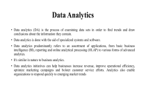 Data Analytics • Data analytics (DA) is the process of examining data sets in order to find trends and draw conclusions about the information they contain. • Data analytics is done with the aid of specialized systems and software. • Data analytics predominantly refers to an assortment of applications, from basic business intelligence (BI), reporting and online analytical processing (OLAP) to various forms of advanced analytics. • It's similar in nature to business analytics. • Data analytics initiatives can help businesses increase revenue, improve operational efficiency, optimize marketing campaigns and bolster customer service efforts. Analytics also enable organizations to respond quickly to emerging market trends Why Data Analytics? Data Analytics Tools Data Collection • In the process of big data analysis, “Data collection” is the initial step before starting to analyze the patterns or useful information in data. • The data which is to be analyzed must be collected from different valid sources. • The data which is collected is known as raw data which is not useful as it is but on cleaning and utilizing that data for analysis further forms information, the information obtained is known as “knowledge”. • The main goal of data collection is to collect information-rich data. Data could be… 1. RDBMS: A relational database is a collection of tables, each of which is assigned a unique name. Each table consists of a set of attributes (columns or fields) and usually stores a large set of tuples (records or rows). Each tuple in a relational table represents an object identified by a unique key and described by a set of attribute values. Data could be… 2. Data Warehouses: A data warehouse is a repository of information collected from multiple sources, stored under a unified schema, and that usually resides at a single site. Data warehouses are constructed via a process of data cleaning, data integration, data transformation, data loading, and periodic data refreshing. Data could be… 3. Transactional Databases: In general, a transactional database consists of a file where each record represents a transaction. A transaction typically includes a unique transaction identity number (trans ID) and a list of the items making up the transaction (such as items purchased in a store). 4. Object-Relational Databases: Object-relational databases are constructed based on an object-relational data model. This model extends the relational model by providing a rich data type for handling complex objects and object orientation. the object-relational data model inherits the essential concepts of object-oriented databases, where, in general terms, each entity is considered as an object. Data could be… 5. Temporal Databases, Sequence Databases, and Time-Series Databases A temporal database typically stores relational data that include time-related attributes. These attributes may involve several timestamps, each having different semantics. A sequence database stores sequences of ordered events, with or without a concrete notion of time. Examples include customer shopping sequences, Web click streams, and biological sequences. A time-series database stores sequences of values or events obtained over repeated measurements of time (e.g., hourly, daily, weekly). Examples include data collected from the stock exchange, inventory control, and the observation of natural phenomena (like temperature and wind). Data could be… 6. Spatial Databases and Spatiotemporal Databases Spatial databases contain spatial-related information. Examples include geographic(map) databases, very large-scale integration (VLSI) or computed-aided design databases, and medical and satellite image databases. A spatial database that stores spatial objects that change with time is called a Spatiotemporal database, from which interesting information can be mined. For example, we may be able to group the trends of moving objects and identify some strangely moving vehicles, or distinguish a bioterrorist attack from a normal outbreak of the flu based on the geographic spread of a disease with time. Data could be… 7. Text Databases and Multimedia Databases Text databases are databases that contain word descriptions for objects. These word descriptions are usually not simple keywords but rather long sentences or paragraphs, such as product specifications, error or bug reports, warning messages, summary reports, notes, or other documents. Multimedia databases store image, audio, and video data. They are used in applications such as picture content-based retrieval, voice-mail systems, video-on-demand systems, the World Wide Web, and speech-based user interfaces that recognize spoken commands. Multimedia databases must support large objects, because data objects such as video can require gigabytes of storage. Data could be… 8. Heterogeneous Databases and Legacy Databases A heterogeneous database consists of a set of interconnected, autonomous component databases. The components communicate in order to exchange information and answer queries. Objects in one component database may differ greatly from objects in other component databases, making it difficult to assimilate their semantics into the overall heterogeneous database. A legacy database is a group of heterogeneous databases that combines different kinds of data systems, such as relational or object-oriented databases, hierarchical databases, network databases, spreadsheets, multimedia databases, or file systems Data could be… 9. Data Streams Many applications involve the generation and analysis of a new kind of data, called stream data, where data flow in and out of an observation platform (or window) dynamically. Such data streams have the following unique features: huge or possibly infinite volume, dynamically changing, flowing in and out in a fixed order, allowing only one or a small number of scans, and demanding fast (often real-time) response time. Typica