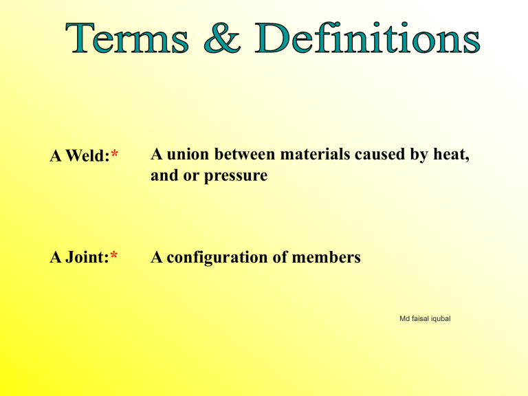 Terms & Definitions A Weld:* A union between materials caused by heat, and or pressure A Joint:* A configuration of members Md faisal iqubal Types of Welds Butt welds:* Fillet welds:* Spot/Seam welds:* Plug/Slot welds:* Edge welds:* Md faisal iqubal Types of Joints Butt joints: * T joints: * Lap joints: * Corner joints:* Closed corner Open corner* Md faisal iqubal Weld Preparations Remember, the purposes of a weld preparation is to allow access for the welding process, penetration and fusion through the area of the joint and its faces* The basic rule is this: The more you take out, then the more you must put back in* This has major effects on economics and distortion control etc The root face, root gap and angle of bevel values, the choice of single, or double sided preparations, are dictated only by the type of welding process, the position and accessibility of the joint* Md faisal iqubal Weld Preparations Angle of bevel* Root face* Included angle* Root radius* Root gap* Root landing* Md faisal iqubal Types of Single Butt Preparation Single bevel Single V Single J Single U* Md faisal iqubal Types of Double Butt Preparation Double bevel Double V Double J Double U* Md faisal iqubal Welded Joints Butt Joints A butt welded butt joint* A fillet welded butt joint* A compound welded butt joint* Md faisal iqubal Welded Joints T Joints A fillet welded T joint* A butt welded T joint* A compound welded T joint* Md faisal iqubal Welded Joints Lap Joints A fillet welded Lap joint* A spot welded Lap joint* A compound welded Lap joint* Md faisal iqubal Welded Joints Closed Corner Joints A fillet welded Closed Corner joint* A butt welded Closed Corner joint* A compound welded Closed Corner joint* Md faisal iqubal Welded Joints Open Corner Joints An inside fillet welded Open Corner joint* An outside fillet welded Open Corner joint* A double fillet welded Open Corner joint* Md faisal iqubal A Butt Welded Butt Joint Actual Throat Thickness* 1.2.3.4. Weld Toes* Weld Face* Weld Width* Design Throat Thickness* 1 2 A B 3 HAZ* Weld Root* 4 Fusion Boundary* Fusion Zone* A + B = Excess Weld Metal** Md faisal iqubal Sizing of Fillet Welds Vertical Leg Length* Weld face* Horizontal Leg Length* Excess weld metal ** Design throat* Actual throat* Md faisal iqubal Nominal & Effective Throat Thickness “a” = Nominal throat thickness “s” = Effective throat thickness a s Deep throat fillet welds from FCAW & SAW etc* Md faisal iqubal Fillet Weld Profiles Convex Concave Mitre * oncave is preferred for joints subject to fatigue loa Md faisal iqubal Effect of a Poor Toe Blend Angle 6 mm 80° Very Poor Weld Toe Blend Angle 3 mm* 20° Improved Weld Toe Blend Angle Md faisal iqubal Effect of a Poor Toe Blend Angle It is also possible that the height of excess weld metal is within the accepted limit of an applied standard, but the toe blend is unacceptable, as shown below* 90° 3 mm Extremely poor toe blend, but excess weld metal is within limits* Md faisal iqubal Summary of Terms Weld: A Union of materials Joint: A Configuration of members Weld Preparation: Preparing a joint to allow access and fusion. Types of Weld: Butt. Fillet. Spot. Seam Plug. Slot. Edge. Types of Joint: Butt. T. Lap. Corner (Open & Closed) Types of Preparation: Preparation Terms: Bevel’s. V’s. J’s. U’s. Single & Double Sided. Bevel/included angle. Root face/gap. Land/Radius Weldment Terms: Weld face & root. Fusion zone & boundary. HAZ. Weld toes.Weld width Weld Sizing (Butts): DTT. ATT. Excess weld metal. Weld Sizing (Fillets): DTT. ATT. Excess weld metal. Leg length * Md faisal iqubal Duties of a Welding Inspector It is the duty of all welding inspectors: To ensure that welding operations are carried out in accordance with written, or agreed practices or specifications Before During After * All Welding Operations Md faisal iqubal Duties of a Welding Inspector Discuss the following Before Welding: 1) Safety: Legislation and safe working practices 2) Documentation: Spec. Drawings. Procedures. Welder approvals. Certificates. Mill sheets 3) Welding Process and ancillaries: Cables. Regulators. Ovens. Quivers etc Equipme 4) Incoming Consumables: Materials/welding consumables (Size. Condition. Specification. Storage) 5) Marking out preparation & set up: Method. Angles/Root face/gap values. Distortion control. Pre-heat prior to tack welding if applicable* Md faisal iqubal Duties of a Welding Inspector During Welding: 1) Pre-Heating. (Method and control) 2) In process distortion control (Balance or sequence welding) 3) Consumable control. (Correct baking and storage prior to use) 4) Welding process (Related parameters i.e. volts/amps. gas flow rate) 5) Welding run sequence and inter-pass cleaning 6) Minimum/maximum Inter-pass temperatures 7) Full compliance with all elements given on the WPS* Md faisal iqubal Duties of a Welding Inspector After Welding: 1) Visual Inspection 2) Non Destructive testing 3) Repairs* 4) Repair procedures (NDT/Excavation/Welding/Welder approval) 5) PWHT 6) Hydro-static testing 7) Submission of all inspection reports to QC departments* Md faisal iqubal Responsibilities of a Welding Inspector To Observe Activities & Imperfections* To Record Activities & Imperfections* To Compare Activities & Imperfections* Md faisal iqubal Attributes of an effective Welding Inspector Some attributes/skills of an effective Welding Inspector:* •Honest •Literate •Respected •Dedicated •Impartial •Observant •Decisive •Analytical* •Knowledgeable •Experienced •Record keeping skills •Communication skills •Safety conscious •Inquisitive •Responsible •Diplomatic skil l* Md faisal iqubal A Welding Inspectors Toolbox A Welding Inspectors toolbox should contain* A welding gauge (Cambridge style, or high low gauges etc) A tape measure and scale A wire brush A magnifying glass A torch and mirror A specification, pen and report, or note paper Any other aids to visual inspection* Md faisal iqubal Specialised Aids for Inspectio