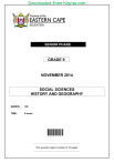 Downloaded from hlayiso.com SENIOR PHASE GRADE 9 NOVEMBER 2014 SOCIAL SCIENCES HISTORY AND GEOGRAPHY MARKS: 100 TIME: 2 hours *9SOSCE* This question paper consists of 16 pages. Downloaded from hlayiso.com 2 SOCIAL SCIENCES (NOVEMBER 2014) INSTRUCTIONS AND INFORMATION 1. This examination paper consists of TWO sections: SECTION A: HISTORY (50 marks), and SECTION B: GEOGRAPHY (50 marks). 2. ALL questions must be answered. 3. Read the questions carefully before answering. 4. Number your answers according to the sequence of questions asked. 5. Start EACH section on a NEW page. 6. Refer to the mark allocation as a guide to assist you with the number of facts that must be written down to answer a question. For example, a mark allocation of 3 marks requires three separate facts. 7. Write in full sentences or in short phrases to explain your answers. A one word answer or a listing of separate words will not be awarded marks. 8. You have been supplied with an extract of a 1 : 50 000 topographical map, 3228 BB THE HAVEN (Addendum). Refer to the topographical map when you answer SECTION B of this examination paper. Copyright reserved Please turn over Downloaded from hlayiso.com 3 SOCIAL SCIENCES (NOVEMBER 2014) SECTION A: HISTORY QUESTION 1: THE CAUSES AND OUTBREAK OF THE SECOND WORLD WAR (1919–1945) Write a good explanation of EACH of the following terms: 1.1 Democracy (2) 1.2 Fascism (2) 1.3 Propaganda (2) 1.4 Holocaust (2) [8] QUESTION 2: THE CAUSES AND OUTBREAK OF THE SECOND WORLD WAR (1919–1945) Refer to FIGURE A and FIGURE B to answer the questions that follow. [Source: m.harunyahya.com] FIGURE A An ‘ideal’ German man used in a Nazi poster. [Source: www.schoolhistory.co.uk] FIGURE B The ‘stereotypical’ Jew. This caricature was drawn by Philipp Rupprecht who worked for a Nazi newspaper called "Der Stürmer". Copyright reserved Please turn over Downloaded from hlayiso.com 4 SOCIAL SCIENCES (NOVEMBER 2014) 2.1 With reference to FIGURE B, explain the term, “stereotypical”. (2) 2.2 Compare the image in FIGURE A with the image in FIGURE B. Contrast ONE different way the Nazi cartoonist illustrated the ‘stereotypical’ German and the ‘stereotypical’ Jew. (2) 2.3 Besides racial prejudice, give TWO other reasons Nazi leaders wanted Jewish people to be portrayed in a negative way. QUESTION 3: (2) [6] THE NUCLEAR AGE AND THE COLD WAR (1945–1990) Look at the following cartoon to answer the following questions. [Source: gcps.desire2learn.com] The cartoon illustrates conflict between the Union of Soviet Socialist Republics (USSR) and the United States of America (USA) during the Cold War. 3.1 Name the international crisis that almost caused the USSR and the USA to start a nuclear war in 1961. (1) 3.2 On what object are the two people sitting on in the cartoon? (1) 3.3 Describe how the cartoonist is illustrating conflict between the two superpowers, USA and USSR, in the cartoon. (2) 3.4 Explain the term ‘Cold War’. (2) 3.5 Explain the ‘arms race’ as a cause of tension between the USSR and the USA during the Cold War period. Write FIVE different facts in full sentences. Copyright reserved (5) [11] Please turn over Downloaded from hlayiso.com QUESTION 4: 5 SOCIAL SCIENCES (NOVEMBER 2014) TURNING POINTS IN SOUTH AFRICAN HISTORY (1948– 1960) Choose the correct person from the list below. (Write only the name of the person as your answer.) Albert Luthuli Robert Sobukwe 4.1 Mahatma Ghandi Steve Biko Walter Sisulu F.W. de Klerk P.W. Botha Hector Petersen He was elected as president of the African National Congress in 1952 and won the Nobel Prize for Peace in 1960. (1) 4.2 He founded the Black Consciousness Movement in the early 1970s. (1) 4.3 “Satyagraha” – a policy of passive resistance (without violence). (1) 4.4 The president who unbanned all political parties/freedom movements and who ensured the release of Nelson Mandela in 1990. QUESTION 5: (1) [4] TURNING POINTS IN SOUTH AFRICAN HISTORY (1948– 1960) Provide the term or name FOR EACH of the following definitions: 5.1 5.2 5.3 A policy of separate development of racial groups in South Africa implemented by the National Party after 1948 (1) When a government is granted special powers, for example to imprison people without trial, or to enforce curfews so that they can crush the opposition and prevent protests (1) An economic measure used by member countries of the United Nations, whereby they refuse to trade with a particular country if that country is guilty of, for example, violations against human rights Copyright reserved (1) [3] Please turn over Downloaded from hlayiso.com 6 SOCIAL SCIENCES (NOVEMBER 2014) QUESTION 6: TURNING POINTS IN SOUTH AFRICAN HISTORY (1948–1960) A Women’s Protest March on 9 August 1956. Refer to the photograph to answer the questions that follow. [Source: www.capechameleon.co.za] Leaders of the march (from left to right) Radima Moosa, Lilian Ngoyi, Helen Joseph and Sophie Williams standing with the petition they wanted to present to the Prime Minister, J.G. Strijdom, on 9 August 1956. 6.1 For what reason did these women decide to organise a protest march? (1) 6.2 Study the photograph. What is the racial significance of the four ladies in the photograph? (1) 6.3 As a result of this protest, people living in South Africa celebrate National Women’s Day every year on 9 August as a public holiday. Explain the importance of this public holiday for all South Africans. QUESTION 7: (2) [4] TURNING POINTS IN SOUTH AFRICAN HISTORY (1960–1994) Contrasting evidence: Refer to SOURCE A and SOURCE B about the Sharpeville massacre that took place on Monday, 21 March 1960. SOURCE A Extract from an eyewitness report by Humprey Tyler There was no warning volley. When the shooting started, it did not stop until there was no living thing in the huge compound in front of the police station. The police claimed they were in desperate danger because the crowd was stoning them. Yet only three policemen were re