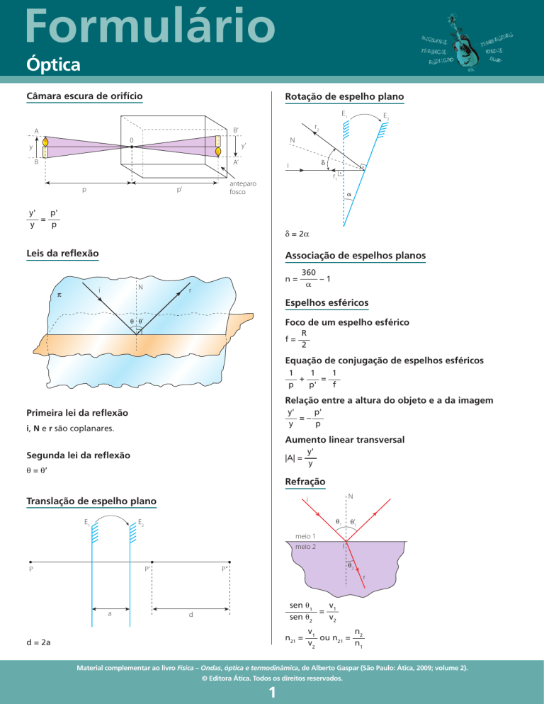 Formulário MÁQ RA I NAS TÉRMICAS Óptica ÃO RADIAÇ Câmara escura de orifício Rotação de espelho plano E1 0 N y’ B A’ p � i r1 anteparo fosco p’ E2 r2 B’ A y ATU PER TEM ONDAS L Z � y' p' = y p δ = 2α Leis da reflexão Associação de espelhos planos N i π n= 360 r –1 Espelhos esféricos Foco de um espelho esférico � �’ f= R 2 Equação de conjugação de espelhos esféricos 1 1 1 + = p p' f Relação entre a altura do objeto e a da imagem y' p' =– y p Primeira lei da reflexão i, N e r são coplanares. Aumento linear transversal Segunda lei da reflexão |A| = θ = θ’ y' y Refração E1 N i Translação de espelho plano E2 �1 meio 1 meio 2 P P’ a �’1 I �2 P” r v sen 1 = 1 v2 sen 2 d n21 = d = 2a v1 n ou n21 = 2 v2 n1 Material complementar ao livro Física – Ondas, óptica e termodinâmica, de Alberto Gaspar (São Paulo: Ática, 2009; volume 2). © Editora Ática. Todos os direitos reservados. 1 Formulário MÁQ TÉRMICAS Óptica ÃO RADIAÇ ATU PER TEM ONDAS L Z Deslocamento da luz numa lâmina de faces paralelas Índice de refração absoluto do meio c n= v d=e Ângulo-limite sen L = RA I NAS n1 (n < n2) n2 1 sen (i – r) cos r Prismas Leis da refração  1. i, N e r são coplanares. 2. sen 1 = n21 ou n1 sen θ1 = n2 sen θ2 sen 2 � �1 �’1 �’2 �2 3. O raio incidente e os raios refratado e refletido estão sempre em semiplanos opostos, separados pela normal N. Dioptro plano Desvio sofrido por um raio de luz δ = θ1 + θ2 – BA Ângulo de refringência BA = θ1’ + θ2’ �2 n2 meio 2 meio 1 I 0 Lentes esféricas �2 p’ P’ � �1 1 n1 Equação de conjugação das lentes delgadas 1 1 1 + = p p' f p P Convergência de uma lente 1 f Equação de conjugação para o dioptro plano C= n1 n = 2 p p' Equação dos fabricantes de lentes Lâmina de faces paralelas C = (n – 1)[ 1 1 + ] R1 R2 Relação entre a altura do objeto e a da imagem �i y' p' =– y p I1 Aumento linear transversal �r �i – �r |A| = e B �r A I2 y' y Associação de lentes d 1 1 1 = + f f1 f2 �e C = C1 + C2 Material complementar ao livro Física – Ondas, óptica e termodinâmica, de Alberto Gaspar (São Paulo: Ática, 2009; volume 2). © Editora Ática. Todos os direitos reservados. 2 Formulário MÁQ RA TÉRMICAS Óptica ÃO RADIAÇ Aumento de um instrumento óptico A= i o Comprimento mínimo Aumento de uma lupa Aumento Ltr = fob + foc Aℓ = d0C Atr = – Microscópio composto fob foc Interferência P r2 r1 F2 F a y O � � F1 B x foc sen θ = ocular y= foc y’ n a nx a Difração L fob objetiva imagem y” no infinito y +2 objeto +1 0 –1 –2 anteparo Aumento do microscópio composto Am = ATU PER TEM ONDAS L Z I NAS d0L focfob � � Telescópio refrator Fob b Foc luz Foc objetiva objeto imagem final Fob ocular Determinação das regiões escuras imagem intermediária sen θ = n b Material complementar ao livro Física – Ondas, óptica e termodinâmica, de Alberto Gaspar (São Paulo: Ática, 2009; volume 2). © Editora Ática. Todos os direitos reservados. 3 Formulário MÁQ RA ATU PER TEM ONDAS L Z I NAS TÉRMICAS Óptica ÃO RADIAÇ Difração e interferência picos de interferência � –1 –2 d a –5 –4 –3 –2 1 –1 0 1 2 2 3 4 5 Expressão dos máximos de intensidade produzidos por uma rede de difração sen θ = m d Material complementar ao livro Física – Ondas, óptica e termodinâmica, de Alberto Gaspar (São Paulo: Ática, 2009; volume 2). © Editora Ática. Todos os direitos reservados. 4