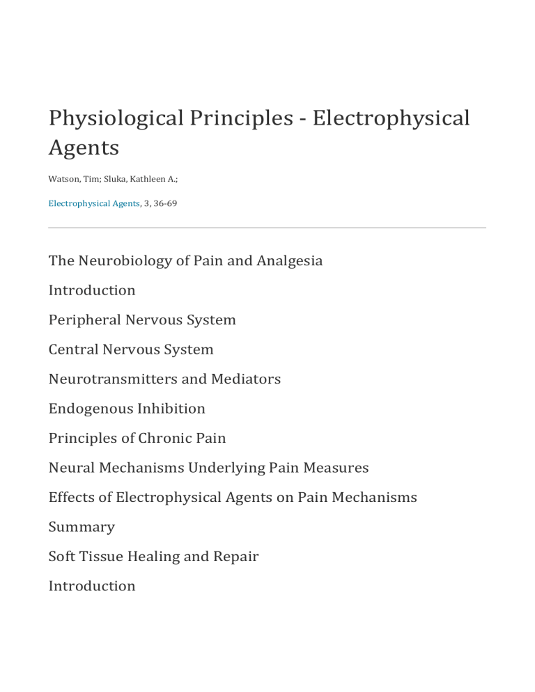 Physiological Principles - Electrophysical Agents Watson, Tim; Sluka, Kathleen A.; Electrophysical Agents, 3, 36-69 The Neurobiology of Pain and Analgesia Introduction Peripheral Nervous System Central Nervous System Neurotransmitters and Mediators Endogenous Inhibition Principles of Chronic Pain Neural Mechanisms Underlying Pain Measures Effects of Electrophysical Agents on Pain Mechanisms Summary Soft Tissue Healing and Repair Introduction The inflammatory and repair processes are no longer simple events to describe owing to the ever-increasing knowledge in this field. This text is intended to provide a brief resume of the key events associated with tissue repair, with an emphasis on the musculoskeletal/soft tissues rather than a classic skin-wound approach, which is considered elsewhere in this text (see Chapters 10 , 11 and 19 ). Examples of recent reviews can be found in Han and Ceilly (2017) Raffetto (2016) Serra et al (2017) and Sorg et al (2017) , and the impact of chronic skin wounds is also usefully considered in Green et al (2014) . Tissue healing (or tissue repair) refers to the body’s replacement of destroyed tissue by living tissue ( Walter & Israel 1987 ) and comprises two essential components – regeneration and repair. The differentiation between the two is based on the resultant tissue. In regeneration, specialized tissues are replaced by the proliferation of surrounding undamaged specialized cells – in other words, new specialized tissue replaces that which has been damaged. In repair, lost tissue is replaced by granulation tissue, which matures to form scar tissue. This review concentrates on the events and processes associated with the repair process. The potential for stem cell-based therapy to dominate in this field at some point in the future raises the possibility of regeneration of the damaged tissue, which would be clinically preferable (e.g. Liu et al 2017; Lin et al 2017 ). This is a rapidly developing field, and there are numerous examples of electrophysical modality interventions being employed as a means to enhance the response of the implanted stem cells (e.g. Hernandez-Bule et al 2017; Priglinger et al 2018 ), which provides exciting future treatment potential. Probably the most straightforward way to describe the healing process (repair) is to separate it into broad stages, which are not mutually exclusive and overlap considerably. The division into four phases is common and will be adopted here – these being bleeding , inflammation , proliferation and remodelling . In addition to the historically established texts ( Hardy 1989; Peacock 1984; Walter & Israel 1987 ) some more recent and detailed texts can be found at Broughton et al (2006) Granger and Senchenkova (2010) Pitzer (2006)Serhan et al (2010) and Stroncek and Reichert (2007) . The key information in this section has been previously published in Watson (2003 2006 2016) . Save to collection Share Overview A brief overview of each phase is presented here before considering them in any detail. Fig. 3.14 refers to a general arrangement of the phases. Fig. 3.15illustrates the physiological reality – in that the phases are not actually separated and the whole process is an integrated sequence of events with a continuous shift in emphasis rather than a sequence of discrete processes. Fig. 3.14 Gross Representation of the Key Phases of the Tissue Repair Process The phases are shown as separate entities, though in reality, they are interlinked in a very deliberate way such that one phase acts as a stimulant or initiator for the following phase. Fig. 3.15 The integrated reality of repair rather than the ‘convenient’ separate phase model. Bleeding Phase This is a relatively short-lived phase, and will occur following injury, trauma or other similar insult, including surgery. Clearly if there has been no overt injury, this will be of little or no importance, but following soft tissue injury, there will have been some bleeding. The normal time for bleeding to stop will vary with the nature of the injury and the nature of the tissue in question. The more vascular tissues (e.g. muscle) will bleed for longer, and there will be a greater escape of blood into the tissues. Other tissues (e.g. ligament) will bleed less (both in terms of duration and volume). It is normally cited that the interval between injury and end of bleeding is a matter of a few hours (4–6 hours is often quoted) though this of course is the average duration after the average injury in the average patient. Some tissues may continue to bleed for a significantly longer period, albeit at a significantly reduced rate. Useful considerations of haemostasis can be found in Gale (2011) and Sira and Eyre (2016) . Inflammatory Phase: Overview The inflammatory phase is an essential component of the tissue repair process and is best regarded in this way rather than as an ‘inappropriate reaction’ to injury. There are, of course, numerous other initiators of the inflammatory process, though for the purpose of this paper, the single event injury model will be adopted. The inflammatory phase has a rapid onset (few hours at most) and swiftly increases in magnitude to its maximal reaction (1–3 days) before gradually resolving (over the next couple of weeks). It can result in several outcomes (see below), but in terms of tissue repair, it is both normal and essential. The onset and resolution are swifter in more vascular tissues and slower in the relatively poorly vascularized tissues (e.g. tendon, ligament). The alternative initiators of the inflammatory events include mechanical irritation, repeated minor trauma, excessive heating and cooling plus others that may be less significant in therapy, such as infection and a wide range of autoimmune disorders. The inflammatory events are essentially the same whichever ‘route’ is relevant for the initiation. The widely held belief that inflammation is something that must be stopped is inconsis