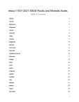 etracy11037 2021 SSSS Rocks and Minerals Notes Table of Contents Ulexite 4 Azurite 5 Malachite 6 Aragonite 7 Calcite 8 Dolomite 9 Halite 10 Fluorite 11 Magnetite 12 Bauxite 13 Corundum 14 Hematite 15 Goethite/Limonite 16 Diamond 17 Copper 18 Silver 19 Gold 21 Sulfur 22 Graphite 23 Apatite 24 Sodalite 25 Talc 26 Epidote 27 Olivine 28 Topaz 29 Staurolite 30 1 Kaolinite 31 Beryl 32 Tourmaline Group 33 Quartz Varieties 34 34 34 34 34 34 35 35 35 35 Agate/Onyx Amethyst Chalcedony Citrine Crystal Jasper Milky Quartz Opal Rose Quartz Garnet Group Almandine Feldspar-Potassium Amazonite Orthoclase Feldspar-Plagioclase Albite Pyroxene Group Augite Rhodonite Amphibole Group Tremolite Hornblende 36 36 37 37 38 39 39 40 40 41 42 42 43 Muscovite 44 44 45 46 Celestite/Celestine 47 Barite 48 Gypsum Varieties 49 49 49 49 Mica Group Biotite Lepidolite Alabaster Satin Spar Selenite 2 Sphalerite 50 Pyrite 51 Bornite 52 Galena 53 Chalcopyrite 54 Gneiss 55 Marble 56 Phyllite 57 Quartzite 58 Schist (Both in one) 59 Slate 60 Andesite 61 Basalt 62 Diorite 63 Gabbro 64 Granite 65 Obsidian 66 Pegmatite 67 Pumice 68 Rhyolite 69 Scoria 70 Arkose 71 Breccia 72 Chert 73 Conglomerate 74 Diatomite 75 Dolostone 76 Sandstone 77 Shale 78 3 Coal Varieties 79 Limestone Varieties 80 4 Borates Ulexite ● ● ● ● ● ● ● ● ● ● Named after George Luxwig Ulex (Germany), who first discovered it Forms in arid regions (saline lakes and salt playas) Yellow-white under UV Extremely fibrous Processed into borax Acicular (“bunny’s tail”) form: has thin, radiating needles coming out of the main rock, very rare Generally found just above the borax in mines, which is much more desirable so the ulexite is mined through and often destroyed Optical (“TV rock”) form: the needles grow parallel to each other. When cut perpendicular to the needles and placed over a paper, the words appear to be transmitted to the top of the mineral Clam Shell Variety: found at top of borax in the blue/green/tan shale. Resembles a clam shell and is not particularly desirable Popcorn Ulexite: looks like cauliflower. Made of white, knobby masses of parallel fibers and is often found in boron mud 5 Carbonates Azurite ● ● ● ● ● ● ● ● ● ● ● ● ● ● Used as ore for copper, pigment, and gemstone Formed when carbon dioxide filled waters get into the earth and react with copper ores and dissolves part of the copper. This copper eventually might become azurite in the right conditions Generally forms in pores or cavities in other rocks Usually massive and nodular Very rarely monoclinic Azurmalachite forms when azurite and malachite form in the same place (formed by similar process) Found in Arizona, New Mexico, and Utah. Plus France and Namibia Slight fizz (effervescence) with dilute hydrochloric acid Often found in rocks above copper ore (indicator mineral) Not modernly used as copper ore, but can be smelted into copper if necessary (Egyptians did it) Azurite granite (“K2 granite): named after the mountain it was found near. Made of white granite with blue orbs of azurite inside Ground and used as blue pigment and paint Azurite blueberries: small nodules of azurite, weathered out of loose sandstone Color sometimes fades Crystal azurite azurite granite Azurite blueberries azurite with a bit of malachite 6 Malachite ● ● ● ● ● ● ● ● ● ● ● ● ● Luster: ○ Crystals: vitreous (rare) ○ Fibrous: silkey ○ Massive: dull and earthy ○ Polishes well Copper ore (one of the first used) Small quantities found today, so rarely used for mining Color never fades Forms in oxidation zones shallowly underground (see azurite for more) Can often form within limestone Found in Egypt and Israel once, now only in Ural Mtns (russia), Congo, Australia, France, and Arizona Effervesces in dilute HCL to produce green liquid Often found as stalactites or botryoidal (grape-like) coverings on underground cavities Tabular crystals (thin, flat crystals) are rare but possible Used as a green pigment (sometimes called copper green) Azurmalachite forms when azurite and malachite form in the same place (formed by similar process) Banded malachite: bands are found inside of the botryoidal structure Banded stalactic botryoidal polished/cut 7 Aragonite ● ● ● ● ● ● ● ● ● ● A stable form of calcium carbonate, similar to calcite but with different structure Orthorhombic crystals separate it from calcite Most crystals are twinned (repeated) growths of pseudohexagonal (hexagon shape, but not hexagon crystals) trillings (3 orthorhombic crystals that twin at the center and form a pseudohexagon) Sometimes grows unstable and turns into calcite, while retaining the original shape (the new calcite is called a pseudomorph) Sometimes copper is also a pseudomorph of aragonite Brown color comes from sand inclusions Softer than calcite Forms in hot, mineral-rich springs when the water flows out of the spring but leaves the calcium carbonate behind (when banded, these deposites are called onyx marble) Forms pearl and coral Found and named by Abrahan Gottlieb Werner after Molina de Aragón, Spain Needle spray Interconnected group pseudohexagon onyx marble elongated crystal 8 Calcite ● ● ● ● ● ● ● ● ● ● ● ● Main component of limestone and marble Limestone formation traps and stores carbon dioxide Some consider it an “ubiquitous mineral” or one that is found everywhere Often forms twinning scalenohedrons (shape with 3+ pains of scalene triangle faces) Nailhead spar: shallow rhombohedral terminations shape (rhombus shaped) Optical spar: highly transparent Name comes from latin for burnt lime (calx), referring to its use in lime Effervesces in cold HCL Generally found in shallow marine places, hot springs, hydrothermal veins Used in paper, paint, tires, plastic, animal shells, food for animals, and as limestone for construction All water contains dissolved calcium and carbon dioxide (calcite dissolves into t