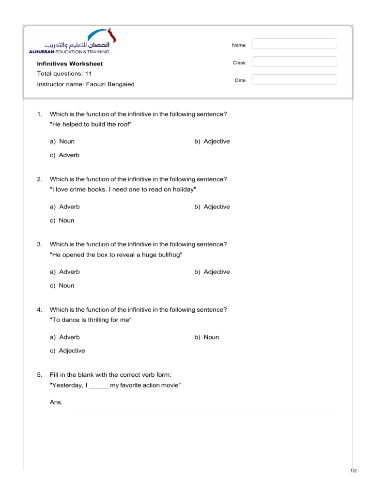 Name Class Infinitives Worksheet Total questions: 11 Date Instructor name: Faouzi Bengaied 1. Which is the function of the infinitive in the following sentence? "He helped to build the roof" a) Noun b) Adjective c) Adverb 2. Which is the function of the infinitive in the following sentence? "I love crime books. I need one to read on holiday" a) Adverb b) Adjective c) Noun 3. Which is the function of the infinitive in the following sentence? "He opened the box to reveal a huge bullfrog" a) Adverb b) Adjective c) Noun 4. Which is the function of the infinitive in the following sentence? "To dance is thrilling for me" a) Adverb b) Noun c) Adjective 5. Fill in the blank with the correct verb form: "Yesterday, I my favorite action movie" Ans. 1/2 6. Which is the function of the infinitive in the following sentence? "this is the best time to start" a) Adverb b) Adjective c) Noun 7. Which is the function of the infinitive in the following sentence? "To win, you need the highest number of points." a) Adjective b) Noun c) Adverb 8. Fill in the blank with the correct word: "When the quarantine is over, I visit my best friend" Ans. 9. Which is the function of the infinitive in the following sentence? "Karen ran to avoid being late." a) Adverb b) Adjective c) Noun 10. Which is the function of the infinitive in the following sentence? "My father took my phone away to teach me a lesson." a) Adjective b) Noun c) Adverb 11. Please check the correct sentence: a) My grandmother are the best person in the b) Olivia and Ralph wants to walk around world! c) Alicia have lots of friends in his school d) Ramon has lots of homework from his teachers 2/2