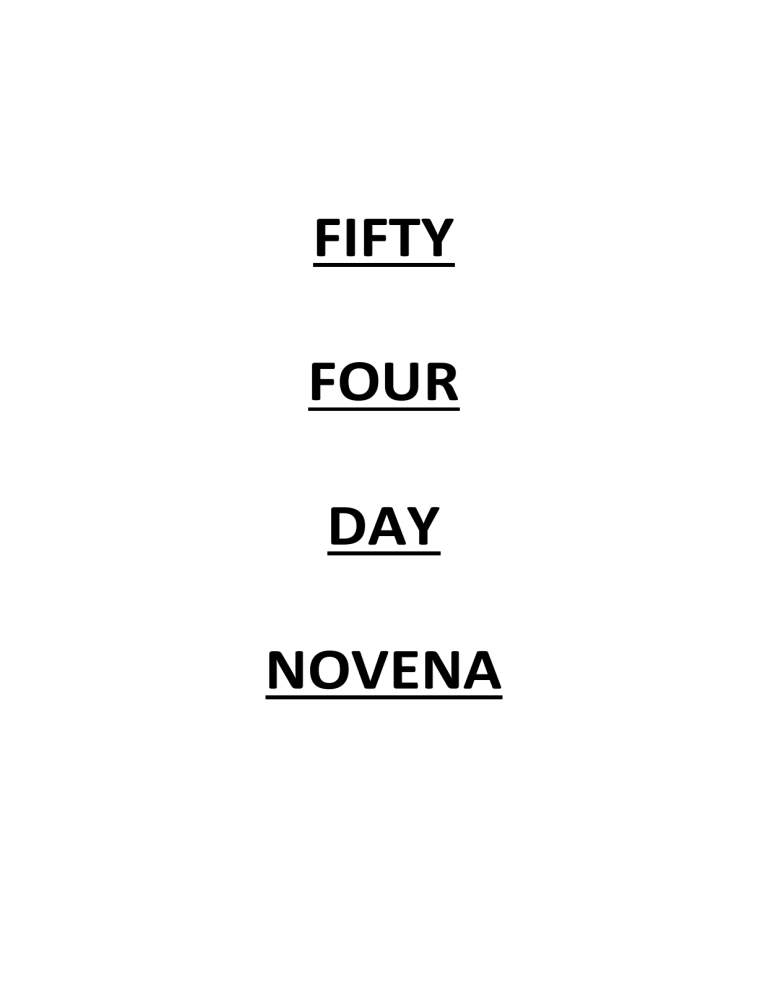 FIFTY FOUR DAY NOVENA Origin In an apparition of Our Lady of Pompeii, which occurred in 1884 at Naples, in the house of Commander Agrelli, the heavenly Mother deigned to make known the manner in which she desires to be invoked. For thirteen months Fortuna Agrelli, the daughter of the Commander, had endured dreadful sufferings and torturous cramps. The most celebrated physicians had given up. On February 16, 1884, the afflicted girl and her relatives commenced a novena of Rosaries. The Queen of the Holy Rosary favoured her with an apparition on March 3rd. Mary, sitting upon a high throne, surrounded by luminous figures, held the divine Child on her lap, and in her hand a Rosary. The Virgin Mother and the Holy Infant were clad in gold embroidered garments. They were accompanied by Saint Dominic and Saint Catherine of Siena. The throne was profusely decorated with flowers; the beauty of Our Lady was marvellous. Mary looked upon the sufferer with maternal tenderness and the patient saluted her with the words: “Queen of the Holy Rosary, be gracious to me; restore me to health! I have already prayed to thee in a novena O Mary, but have not yet experienced thy aid. I am so anxious to be cured!” “Child”, responded the Blessed Virgin, “thou hast invoked me by various titles and hast always obtained favours from me. Now, since thou hast called me by that title so pleasing to me, ‘Queen of the Holy Rosary’, I can no longer refuse the favour thou dost petition; for this name is most precious and dear to me. Make three novenas, and thou shalt obtain all”. Once more the Queen of the Holy Rosary appeared to her and said: “Whoever desires to obtain favours from me should make three novenas of the prayers of the Rosary, and three novenas in thanksgiving”. This miracle of the Rosary made a very deep impression on Pope Leo XIII, and greatly contributed to the fact that in so many circular letters, he urged all Christians to love the Rosary and say it fervently. Method The 54 Day Rosary Novena consists of five decades of the Rosary each day for 27 days in petition; then immediately five decades each day for 27 days in thanksgiving, whether or not the request has been granted. The meditations vary from day to day. On the first day meditate on the Joyful Mysteries; on the second day the Sorrowful Mysteries; on the third day the Glorious Mysteries and on the fourth day the Luminous Mysteries; and so on throughout the 54 days. Follow the format of the prayers for each of the mysteries as outlined in the guide below. This is an arduous novena but it is a novena of love. If you are sincere, you will not find it difficult to obtain your request. Should you not obtain the favour you seek, be assured that the Rosary Queen, who knows what each one stands most in need of, has heard your prayer. You will not have prayed in vain. No prayer ever went unheard and Our Blessed Lady has never been known to fail. Look upon each Hail Mary as a rare and beautiful rose which you lay at Mary’s feet. These spiritual roses, bound in a wreath with Spiritual Communions, will be a most pleasing and acceptable gift to her and will bring down upon you special graces. 2 Common Prayers The Sign of the Cross Ϯ In the name of the Father and of the Son and of the Holy Spirit. Amen. Glory Be Ϯ Glory be to the Father and to the Son and to the Holy Spirit. As it was in the beginning, is now and ever shall be, world without end. Amen. The Fatima Prayeri O my Jesus, forgive us our sins, save us from the fires of hell. Lead all souls to Heaven, especially those in most need of Thy mercy. Our Father Our Father, who art in Heaven; hallowed be Thy Name; Thy kingdom come; Thy will be done, on Earth as it is in Heaven. Give us this day our daily bread and forgive us our trespasses, as we forgive those who trespass against us; and lead us not into temptation, but deliver us from evil. Amen. Hail Maryii Hail Mary, full of grace, the Lord is with thee. Blessed art thou among women and blessed is the fruit of thy womb, Jesus. Holy Mary, Mother of God, pray for us sinners, now and at the hour of our death. Amen. Apostles’ Creediii 1. I believe in God, the Father almighty, creator of Heaven and Earth. 2. I believe in Jesus Christ, His only Son, our Lord. 3. He was conceived by the power of the Holy Spirit and born of the Virgin Mary. 4. He suffered under Pontius Pilate, was crucified, died and was buried. 5. He descended to the dead. On the third day He rose again. 6. He ascended into Heaven and is seated at the right hand of the Father. 7. He will come again to judge the living and the dead. 8. I believe in the Holy Spirit, 9. the Holy Catholic Church, the communion of saints, 10. the forgiveness of sins, 11. the resurrection of the body, 12. and life everlasting. Amen. Hail Holy Queeniv Hail, Holy Queen, Mother of Mercy, hail our life, our sweetness and our hope! To thee do we cry poor banished children of Eve; to thee do we send up our sighs, mourning and weeping in this vale of tears. Turn then, O most gracious advocate, thine eyes of mercy towards us and after this our exile show unto us the blessed fruit of thy womb, Jesus; O clement, O loving, O sweet Virgin Mary. Pray for us, O Holy Mother of God. That we may be made worthy of the promises of Christ. Let us pray: O God, whose only-begotten Son, by His life, death and resurrection has purchased for us the rewards of eternal life; grant, we beseech you, that meditating on these mysteries of the most Holy Rosary of the Blessed Virgin Mary, we may both imitate what they contain and obtain what they promise, through the same Christ our Lord. Amen. 3 Prayer to Saint Michael the Archangelv St Michael the Archangel, defend us in battle; be our defence against the wickedness and snares of the Devil. May God rebuke him, we humbly pray and do thou, O prince of the heavenly host, by the power of God, thrust into Hell Satan and all the other evil spirits who prowl about the world seeking