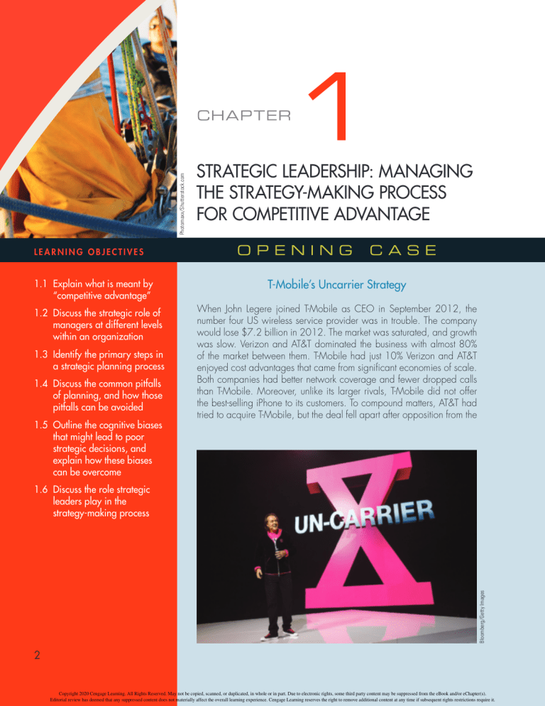 Photomaxx/Shutterstock.com 1 LEARNING OBJECTIVES SEI LEDESI: MI E SE-MI OESS O OMEIIE DE OP ENING C ASE 1.1 Explain what is meant by “competitive advantage” -Mobile’s Uncarrier Strategy 1.2 Discuss the strategic role of managers at different levels within an organization When John Legere joined T-Mobile as CEO in September 2012, the number four US wireless service provider was in trouble. The company would lose $7.2 billion in 2012. The market was saturated, and growth was slow. Verizon and AT&T dominated the business with almost 80% of the market between them. T-Mobile had just 10% Verizon and AT&T enjoyed cost advantages that came from signicant economies of scale. Both companies had better network coverage and fewer dropped calls than T-Mobile. Moreover, unlike its larger rivals, T-Mobile did not offer the best-selling iPhone to its customers. To compound matters, AT&T had tried to acquire T-Mobile, but the deal fell apart after opposition from the 1.3 Identify the primary steps in a strategic planning process 1.4 Discuss the common pitfalls of planning, and how those pitfalls can be avoided 1.5 Outline the cognitive biases that might lead to poor strategic decisions, and explain how these biases can be overcome Bloomberg/Getty Images 1.6 Discuss the role strategic leaders play in the strategy-making process 2 Copyright 2020 Cengage Learning. All Rights Reserved. May not be copied, scanned, or duplicated, in whole or in part. Due to electronic rights, some third party content may be suppressed from the eBook and/or eChapter(s). Editorial review has deemed that any suppressed content does not materially affect the overall learning experience. Cengage Learning reserves the right to remove additional content at any time if subsequent rights restrictions require it. Chapter 1 Strategic Leadership: Managing the Strategy-Making Process for Competitive Advantage Justice Department who thought that merger would reduce competition in the industry. Employee moral had taken a hit during the merger talks and had yet to recover. Legere saw things differently. Although employee morale was beaten down, he thought that the overall culture was intact and had the potential to be a powerful driver of growth. The average age of eld employees was just 27. They were looking for somebody to energize them, and Legere meant to deliver. He did so by providing a clear strategic direction, eliminating bureaucratic rules and procedures that stied motivation and initiative taking, and creating a sense of excitement. Legere also realized that customers hated industry practices. They hated being locked into contracts. They hated being gouged by extra fees they couldn’t understand or couldn’t fully control, such as data and roaming charges. They also thought wireless phones were cheap, whereas the wireless carriers were in fact subsidizing the phone manufacturers and recouping the cost of selling cheap handsets by charging high service fees. To Legere’s way of thinking, customer dissatisfaction with industry practices created an opportunity for T-Mobile. He believed that the best way to succeed in the industry was to do things differently from existing carriers – to do the complete opposite – and so was born T-Mobile’s strategy of being the “Un-carrier.” First though, Legere had to x some obvious problems. T-Mobile wasn’t selling the iPhone, so he went to Apple and made a deal. T-Mobile’s network coverage had been terrible, so the company began buying up all of the wireless spectrum they could and investing heavily in upgrading their network to improve both the coverage and speed of service. Next, Legere and his team started to make dramatic changes to the company’s offering aimed at making the experience better for customers. T-Mobile eliminated longterm contracts and replaced them with a transparent pricing model. They made it easier to upgrade to a new smartphone, and stopped charging for global roaming. They offered to pay the early termination fees for customers who wanted to switch from other carriers to T-Mobile. The company was also the rst to offer unlimited data plans. In 2017, it upped the ante by offering free Netix streaming to customers with two or more lines. Legere backed up all of this with ashy marketing, including creative use of his twitter account to promote T-Mobile and lambast industry rivals (Legere has an impressive 5.3 million followers on Twitter). The strategy has produced some noticeable results. The total number of subscribers at T-Mobile increased from 33 million in late 2012 to 70 million by late 2017, making the company number one in terms of customer growth. Market share expanded from 10% to 17% over the same period. Monthly churn rates, a key metric of customer satisfaction, fell from 2.7% in 2011 to 1.3% in 2017, close to the 1% achieved by industry leader Verizon. That being said, T-Mobile still faces big challenges. It continues to lack the economies of scale and coverage of its larger rivals. T-Mobile also has poor retail distribution in one-third of the United States, a deciency it is now trying to x by rapidly expanding its retail presence. It added more than 3,000 retail stores in 2017 alone. If it gains enough new customers, it may be able to attain scale economies, lower its costs per customer and become more protable. Sources: John Legere, “T-Mobile’s CEO on winning market share by trash talking rivals,” Harvard Business Review, January-February 2017. Brandt Ranj, “How the unlimited data plans from AT&T, Verizon, T-Mobile and Sprint all stack up,” Business Insider, June 29, 2017. Ina Fried, “T-Mobile COO explains why the “uncarrier” strategy is working,” Axios, September 11, 2017. Copyright 2020 Cengage Learning. All Rights Reserved. May not be copied, scanned, or duplicated, in whole or in part. Due to electronic rights, some third party content may be suppressed from the eBook and/or eChapter(s). Editorial review has deemed t