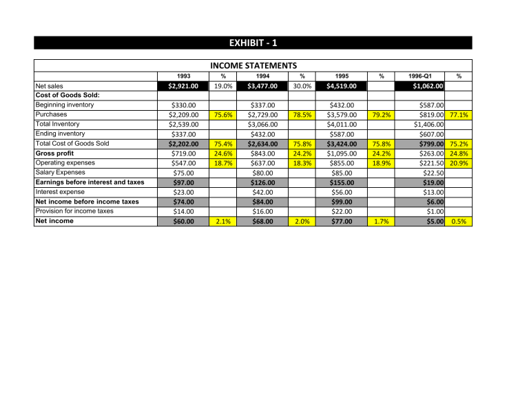 EXHIBIT - 1 INCOME STATEMENTS Net sales Cost of Goods Sold: Beginning inventory Purchases Total Inventory Ending inventory Total Cost of Goods Sold Gross profit Operating expenses Salary Expenses Earnings before interest and taxes Interest expense Net income before income taxes Provision for income taxes Net income 1993 % 1994 % 1995 $2,921.00 19.0% $3,477.00 30.0% $4,519.00 $330.00 $2,209.00 $2,539.00 $337.00 $2,202.00 $719.00 $547.00 $75.00 $97.00 $23.00 $74.00 $14.00 $60.00 75.6% 75.4% 24.6% 18.7% 2.1% $337.00 $2,729.00 $3,066.00 $432.00 $2,634.00 $843.00 $637.00 $80.00 $126.00 $42.00 $84.00 $16.00 $68.00 78.5% 75.8% 24.2% 18.3% 2.0% $432.00 $3,579.00 $4,011.00 $587.00 $3,424.00 $1,095.00 $855.00 $85.00 $155.00 $56.00 $99.00 $22.00 $77.00 % 1996-Q1 % $1,062.00 79.2% 75.8% 24.2% 18.9% 1.7% $587.00 $819.00 $1,406.00 $607.00 $799.00 $263.00 $221.50 $22.50 $19.00 $13.00 $6.00 $1.00 $5.00 77.1% 75.2% 24.8% 20.9% 0.5% EXHIBIT - 2 BALANCE SHEETS 1993 Cash Accounts receivable, net Inventory Current assets Property, net Total Assets Notes payable, bank Note payable to Holtz, (C/P) Notes payable, trade Accounts payable Accrued expenses Term loan, current portion Current liabilities Term loan Note payable, Mr. Holtz Total Liabilities Net worth Total Liabilities + Net Worth Return on Sales (Profit %) Return on Assets Return on Equity Profit Margin Asset Turnover Equity Multiplier % Sales % Assets 1994 % Sales % Assets 1995 % Sales % Assets 1996 % Sales % Assets $43.00 1.47% $52.00 1.50% $56.00 1.24% $53.00 4.99% $306.00 10.48% $411.00 11.82% $606.00 13.41% $583.00 54.90% E $337.00 11.54% $432.00 12.42% $587.00 12.99% $607.00 57.16% $686.00 $895.00 $1,249.00 $1,243.00 $233.00 7.98% $262.00 7.54% $388.00 8.59% $384.00 36.16% $919.00 31.46% $1,157.00 33.28% $1,637.00 36.22% $1,627.00 153.20% $0.00 $60.00 $390.00 $399.00 $0.00 $100.00 $100.00 $100.00 $0.00 $0.00 $127.00 $123.00 $213.00 $340.00 $376.00 $364.00 $42.00 1.44% $45.00 1.29% $75.00 1.66% $67.00 1.48% $20.00 $20.00 $20.00 $20.00 $275.00 29.92% $565.00 48.83% $1,088.00 66.46% $1,073.00 65.95% $140.00 $120.00 $100.00 $100.00 15.23% 19.01% 6.11% 6.15% $0.00 $100.00 $0.00 $0.00 $415.00 $785.00 $1,188.00 $1,173.00 $504.00 54.84% $372.00 32.15% $449.00 27.43% $454.00 27.90% $919.00 $1,157.00 $1,637.00 $1,627.00 2.1% 6.5% 11.9% 2.1% 3.2 1.8 2.0% 5.9% 18.3% 2.0% 3.0 3.1 1.7% 4.7% 17.1% 1.7% 2.8 3.6 0.5% 0.3% 1.1% 0.5% 0.7 3.6 EXHIBIT - 3 CASH FLOW STATEMENTS 1993 * 1994 $68.00 1995 $77.00 1996-Q1 $5.00 Cash Flow in Operating Activities Change in A/C Receivables Change in Inventory Change in Notes Payable, trade Change in A/C Payables Change in Accrued Expenses TOTAL N.A N.A N.A N.A N.A N.A -$105.00 -$95.00 $0.00 $127.00 $3.00 -$70.00 -$195.00 -$155.00 $127.00 $36.00 $30.00 -$157.00 $23.00 -$20.00 -$4.00 -$12.00 -$8.00 -$21.00 Cash Flow in Investing Activities Change in PPE TOTAL N.A N.A -$29.00 -$29.00 -$126.00 -$126.00 $4.00 $4.00 Cash Flow in Financing Activities Change in Notes Payable Bank Change in Notes Payable Holtz (Current Portion) Change in Term Loan (Current Portion) Change in Long Term Loan Change in Note Payable, Holtz (Long term) Equity Buyout TOTAL N.A N.A N.A N.A N.A N.A N.A $60.00 $100.00 $0.00 -$20.00 $100.00 -$200.00 $40.00 $330.00 $0.00 $0.00 -$20.00 -$100.00 $0.00 $210.00 $9.00 $0.00 $0.00 $0.00 $0.00 $0.00 $9.00 Net Cash Flow Opening Cash Balance Closing Cash Balance N.A N.A N.A $9.00 $43.00 $52.00 $4.00 $52.00 $56.00 -$3.00 $56.00 $53.00 -$2.58 $71.58 -$74.16 -$74.16 $16.38 -$90.54 Net Income DISCOOUNTING AND CASH BALANCES Opening Cash Balance (from closing of year 9x) Discounts Available on Purchase @ 2 % Closing Cash Balance (if discount is availed) N.A $44.18 N.A $52.00 $54.58 -$2.58 (*) 1993 Cash Flow not possible because data not given for 1992 EXHIBIT - 4 COMPARISON WITH INDUSTRIAL AVERAGES Industrial Preview Low Profit High Profit 1993 Cost of goods Operating expense Cash Accounts receivable Inventory Fixed assets, net Total Assets 76.90% 22.00% 1.30% 13.70% 12.00% 12.10% 39.10% 75.10% 20.60% 1.10% 12.40% 11.60% 9.20% 34.30% 75.4% 18.7% 1.5% 10.5% 11.5% 8.0% 31.5% Current liabilities Long-term liabilities Equity 52.70% 34.80% 12.50% 29.20% 16.00% 54.80% 29.9% 15.2% 54.8% Current ratio Return on sales Return on assets Return on equity 1.31 (0.7%) (1.8%) (14.3%) 2.52 4.3% 12.2% 22.1% 2.5 2.1% 6.5% 11.9% Acid Test Ratio Inventory T/O Days Days Sales Outstanding Payable Deferred Period Cash Conversion Cycle Other Ratios 1.3 41.5 37.7 34.7 44.5 (*) 1996 Full Year Data not available so it is not added here. Inventory T/O Days = Inventory*360/COGS DSO = A/C Rec*360/Sales Inventory T/O Days = A/C Payable*360/Purchases 1994 1995 Percent of Total Sales 75.8% 75.8% 18.3% 18.9% 1.5% 1.2% 11.8% 13.4% 12.4% 13.0% 7.5% 8.6% 33.3% 36.2% Percent of Total Assets 48.8% 66.5% 19.0% 6.1% 32.2% 27.4% Ratios 1.6 1.1 2.0% 1.7% 5.9% 4.7% 18.3% 17.1% 0.8 44.7 42.6 44.9 42.4 0.6 46.8 48.3 37.8 57.2 Clarkson Lumber Co. 1996* Performance Comments (on Current-1995) N.A N.A N.A N.A N.A N.A N.A In between lower and higher profit outlets Better than high profit outlets Worse than lower profit outlets In between lower and higher profit outlets Worse than lower profit outlets In between lower and higher profit outlets In between lower and higher profit outlets N.A N.A N.A Worse than lower profit outlets Better than high profit outlets In between lower and higher profit outlets N.A N.A N.A N.A In between lower and higher profit outlets In between lower and higher profit outlets In between lower and higher profit outlets In between lower and higher profit outlets N.A N.A N.A N.A N.A BAR CHARTS FOR EXHIBIT -4 EXHIBIT - 5 PROFORMA INCOME STATEMENT -1996 Net sales Cost of Goods Sold: Beginning inventory Purchases Total Inventory Ending inventory Total Cost of Goods Sold Disconuts added back @ 2% (3) Gross profit Operating expenses Salary Expenses Earnings before interest and taxes Interest expense (Note -1) Net income before income taxes Provision for income 