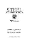 Steel construction manual american institute of steel construction fourteenth edition AISC_Prelims:14th Ed. 1/20/11 7:23 AM Page i 1 Dimensions and Properties 2 General Design Considerations 3 Design of Flexural Members 4 Design of Compression Members 5 Design of Tension Members 6 Design of Members Subject to Combined Forces 7 Design Considerations for Bolts 8 Design Considerations for Welds 9 Design of Connecting Elements AISC_Prelims:14th Ed. 1/20/11 7:23 AM Page ii AISC_Prelims:14th Ed. 1/20/11 7:23 AM Page iii 10 Design of Simple Shear Connections 11 Design of Partially Restrained Moment Connections 12 Design of Fully Restrained Moment Connections 13 Design of Bracing Connections and Truss Connections 14 Design of Beam Bearing Plates, Col. Base Plates, Anchor Rods, and Col. Splices 15 Design of Hanger Connections, Bracket Plates, and Crane-Rail Connections 16 Specifications and Codes 17 Miscellaneous Data and Mathematical Information Index and General Nomenclature AISC_Prelims:14th Ed. 1/20/11 7:23 AM Page iv AISC_Prelims:14th Ed. 1/20/11 7:23 AM Page v STEEL CONSTRUCTION MANUAL AMERICAN INSTITUTE OF STEEL CONSTRUCTION FOURTEENTH EDITION AISC_Prelims_14th Ed._February 25, 2013 14-11-10 9:30 AM Page vi (Black plate) vi AISC © 2011 by American Institute of Steel Construction ISBN 1-56424-060-6 All rights reserved. This book or any part thereof must not be reproduced in any form without the written permission of the publisher. The AISC logo is a registered trademark of AISC. The information presented in this publication has been prepared in accordance with recognized engineering principles and is for general information only. While it is believed to be accurate, this information should not be used or relied upon for any specific application without competent professional examination and verification of its accuracy, suitability, and applicability by a licensed professional engineer, designer, or architect. The publication of the material contained herein is not intended as a representation or warranty on the part of the American Institute of Steel Construction or of any other person named herein, that this information is suitable for any general or particular use or of freedom from infringement of any patent or patents. Anyone making use of this information assumes all liability arising from such use. Caution must be exercised when relying upon other specifications and codes developed by other bodies and incorporated by reference herein since such material may be modified or amended from time to time subsequent to the printing of this edition. The Institute bears no responsibility for such material other than to refer to it and incorporate it by reference at the time of the initial publication of this edition. Printed in the United States of America First Printing: March 2011 Second Printing: February 2012 Third Printing: February 2013 Fourth Printing: February 2015 AMERICAN INSTITUTE OF STEEL CONSTRUCTION AISC_Prelims:14th Ed. 1/20/11 7:23 AM Page vii vii FOREWORD The American Institute of Steel Construction, founded in 1921, is the nonprofit technical standards developer and trade organization for the fabricated structural steel industry in the United States. AISC is headquartered in Chicago and has a long tradition of service to the steel construction industry providing timely and reliable information. The continuing financial support and active participation of Members in the engineering, research and development activities of the Institute make possible the publishing of this Steel Construction Manual. Those Members include the following: Full Members engaged in the fabrication, production and sale of structural steel; Associate Members, who include erectors, detailers, service consultants, software developers and steel product manufacturers; Professional Members, who are structural or civil engineers and architects, including architectural and engineering educators; Affiliate Members, who include general contractors, building inspectors and code officials; and Student Members. The Institute’s objective is to make structural steel the material of choice, by being the leader in structural-steel-related technical and market-building activities, including specification and code development, research, education, technical assistance, quality certification, standardization and market development. To accomplish this objective, the Institute publishes manuals, design guides and specifications. Best known and most widely used is the Steel Construction Manual, which holds a highly respected position in engineering literature. The Manual is based on the Specification for Structural Steel Buildings and the Code of Standard Practice for Steel Buildings and Bridges. Both standards are included in the Manual for easy reference. The Institute also publishes technical information and timely articles in its Engineering Journal, Design Guide series, Modern Steel Construction magazine, and other design aids, research reports and journal articles. Nearly all of the information AISC publishes is available for download from the AISC web site at www.aisc.org. AMERICAN INSTITUTE OF STEEL CONSTRUCTION AISC_Prelims:14th Ed. 1/20/11 7:23 AM Page viii viii PREFACE This Manual is the 14th Edition of the AISC Steel Construction Manual, which was first published in 1927. It replaces the 13th Edition Manual originally published in 2005. The following specifications, codes and standards are printed in Part 16 of this Manual: • 2010 AISC Specification for Structural Steel Buildings • 2009 RCSC Specification for Structural Joints Using High-Strength Bolts • 2010 AISC Code of Standard Practice for Steel Buildings and Bridges The following resources supplement the Manual and are available on the AISC web site at www.aisc.org: • AISC Design Examples, which illustrate the application of tables and specification provisions that are included in this Manual. • AISC Shapes Database V14.0 and V14.0H. • Backgro