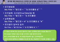 합격을 향한 빠르면서도 안전한 길! 유동균 선생님의 액세스 인터넷 강의 (이 표는 사이트 상단의 자료실 – 해당 과정 – 파워포인트 공식표에서 다운로드 할수 있습니다.) 문자열일때 Me.Filter = "필드명 = ‘ “& 컨트롤명 &” ’ “ 숫자일때, 논리값(true/false)일 때 Me.Filter = "필드명 = “& 컨트롤명 날짜형일때 Me.Filter = "필드명 = #” & 컨트롤명 & “#” 문자열의 일부와 일치 Me.Filter = "필드명 like ‘*” & 컨트롤명 & “*’ ” 각 자료의 형식에 따라 공식이 달라지는 점은 1단계에서 많이 연습을 했습니다. 아직 응용이 부족한 것은 진도를 나가면서 감을 잡으면 되지만 혹시 1단계 진행을 할 때 위 부분을 학습하지 않고 건너띄었다면 1단계 조회 및 출력2의 유형들을 최소한 몇 개는 연습해야 이 파트를 이해할 수 있습 니다. 합격을 향한 빠르면서도 안전한 길! 유동균 선생님의 액세스 인터넷 강의 (이 표는 사이트 상단의 자료실 – 해당 과정 – 파워포인트 공식표에서 다운로드 할수 있습니다.) RECORDSOURCE 속성 – 레코드원본 설정 Me.RecordSource = “SELECT 필드명 FROM 테이블 WHERE 조건” - 보통 폼이나 보고서의 레코드소스를 지정할땐 필드명은 *를 사용 - 조건은 필터명령을 줄때의 문법과 동일 합격을 향한 빠르면서도 안전한 길! 유동균 선생님의 액세스 인터넷 강의 (이 표는 사이트 상단의 자료실 – 해당 과정 – 파워포인트 공식표에서 다운로드 할수 있습니다.) APPLYFILTER - 필터 DOCMD.APPLYFILTER 필터이름, “조건” 합격을 향한 빠르면서도 안전한 길! 유동균 선생님의 액세스 인터넷 강의 (이 표는 사이트 상단의 자료실 – 해당 과정 – 파워포인트 공식표에서 다운로드 할수 있습니다.) 개체 구분 • Me : 현재 개체 (가령 현재 폼에서 현재폼 정보를 필터할때) • docmd : 다른 개체 (가령 현재 폼에서 다른 폼이나 보고서를 불러올 때) 합격을 향한 빠르면서도 안전한 길! 유동균 선생님의 액세스 인터넷 강의 (이 표는 사이트 상단의 자료실 – 해당 과정 – 파워포인트 공식표에서 다운로드 할수 있습니다.) 폼, 보고서 출력 <폼 열기> • Docmd.openform “폼이름”, 여는방법, 필터이름, “조건” <보고서 열기> • Docmd.openreport “보고서명”, 여는방법, 필터이름, “조 건” 합격을 향한 빠르면서도 안전한 길! 유동균 선생님의 액세스 인터넷 강의 (이 표는 사이트 상단의 자료실 – 해당 과정 – 파워포인트 공식표에서 다운로드 할수 있습니다.) OPENFORM 데이터모드 • acFormAdd : 새 레코드를 추가할 수 있지만 기존 레코드를 편집은 불가. • acFormEdit : 기존 레코드를 편집하고 새 레코드 를 추가도 가능. • acFormPropertySettings : 기본값모드로 나오는 폼이 가진 속성대로 그냥 사용되는 모드 • acFormReadOnly : 읽기전용모드로 열기 합격을 향한 빠르면서도 안전한 길! 유동균 선생님의 액세스 인터넷 강의 (이 표는 사이트 상단의 자료실 – 해당 과정 – 파워포인트 공식표에서 다운로드 할수 있습니다.) iif - 조건판단 • = iif(조건, 참, 거짓) • 액세스에선 거짓일 경우가 없다면 생략 = iif(조건, 참) * 엑셀의 if가 액세스에선 iif로 사용됩니다. • iif를 iff로 적지 않도록 주의하세요. 합격을 향한 빠르면서도 안전한 길! 유동균 선생님의 액세스 인터넷 강의 (이 표는 사이트 상단의 자료실 – 해당 과정 – 파워포인트 공식표에서 다운로드 할수 있습니다.) 여러 조건 연결 조건1 or 조건2 ~ 이거나 조건1 and 조건2 ~ 이고 합격을 향한 빠르면서도 안전한 길! 유동균 선생님의 액세스 인터넷 강의 (이 표는 사이트 상단의 자료실 – 해당 과정 – 파워포인트 공식표에서 다운로드 할수 있습니다.) 주로 사용되는 SQL 구문 • 검색 : SELECT 필드명 FROM 테이블명 WHERE 조건 • 갱신 : UPDATE 테이블명 SET 변경내용 WHERE 조건 • 삭제 : DELETE 필드명 FROM 테이블명 WHERE 조건 • 추가 : INSERT INTO 테이블(필드1, 필드) VALUES (값1, 값2) 합격을 향한 빠르면서도 안전한 길! 유동균 선생님의 액세스 인터넷 강의 (이 표는 사이트 상단의 자료실 – 해당 과정 – 파워포인트 공식표에서 다운로드 할수 있습니다.) SQL 구문 분석 • 일반 : SELECT 필드명 FROM 테이블명 WHERE 조건 • 그룹 : SELECT 필드명 FROM 테이블명 GROUP BY 그룹화필드명 HAVING 조건 • 조건은 WHERE이지만 그룹화를 했을 땐 HAVING 합격을 향한 빠르면서도 안전한 길! 유동균 선생님의 액세스 인터넷 강의 (이 표는 사이트 상단의 자료실 – 해당 과정 – 파워포인트 공식표에서 다운로드 할수 있습니다.) 반복 실행 구역 : 예 - 특정 그룹이 1, 2페이지에 걸쳐 출력될 때 1페이지에만 나오던 그룹 머리글 을 2페이지에도 나오게 하는 기능 특정 개체를 페이지 머리글로 옮기기 - 페이지마다 해당 영역을 상단에 표시하기 위한 기능 페이지 바꿈 : 구역 전/후 - 해당 구역을 만나기 전(후)에 페이지가 나뉘게 하는 기능 위 기능의 판단은 지문과 실습파일의 상황을 같이 보면서 판단해야 합니다. 그래서 이 문제에 어떤 기능을 적용하는 이유를 알아야 하겠지만 다른 기능까지 한 번 에 섭렵하긴 어렵고, 관련 문제가 나올 때 그 기능을 각각 이해해야 하겠습니다. 합격을 향한 빠르면서도 안전한 길! 유동균 선생님의 액세스 인터넷 