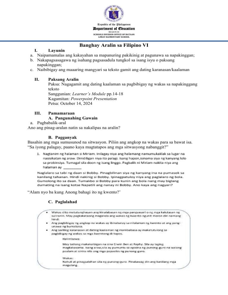 Republic of the Philippines Department of Education REGION III SCHOOLS DIVISION OFFICE OF BATAAN LIMAY ELEMENTARY SCHOOL Banghay Aralin sa Filipino VI I. Layunin a. Naipamamalas ang kakayahan sa mapanuring pakikinig at pagunawa sa napakinggan; b. Nakapagsasagawa ng isahang pagsasadula tungkol sa isang isyu o paksang napakinggan; c. Naibibigay ang maaaring mangyari sa teksto gamit ang dating karanasan/kaalaman II. Paksang Aralin Paksa: Nagagamit ang dating kaalaman sa pagbibigay ng wakas sa napakinggang teksto Sanggunian: Learner’s Module pp.14-18 Kagamitan: Powerpoint Presentation Petsa: October 14, 2024 III. Pamamaraan A. Pangunahing Gawain a. Pagbabalik-aral Ano ang pinag-aralan natin sa nakalipas na aralin? B. Pagganyak Basahin ang mga sumusunod na sitwasyon. Piliin ang angkop na wakas para sa bawat isa. “Sa iyong palagay, paano kaya magtatapos ang mga sitwasyong nabanggit?” “Alam nyo ba kung Anong bahagi ito ng kwento?’ C. Paglalahad Republic of the Philippines Department of Education REGION III SCHOOLS DIVISION OFFICE OF BATAAN LIMAY ELEMENTARY SCHOOL Ang sariling karanasan ay malaking bahagi ng pagbibigay ng sariling wakas sa nabasang kwento. D. Paglalahat E. Paglalapat Gawain 1. Basahin ang mga sumusunod na sitwasyon. Piliin ang angkop na wakas para sa bawat isa. Gawain 2. Pangkatang gawain Basahin ang mga sumusunod na sitwasyon. Bigyan ng sariling wakas ang sitwasyon. Republic of the Philippines Department of Education REGION III SCHOOLS DIVISION OFFICE OF BATAAN LIMAY ELEMENTARY SCHOOL F. Pagtataya Inihanda ni: Rosalinda Samong LSB Teacher