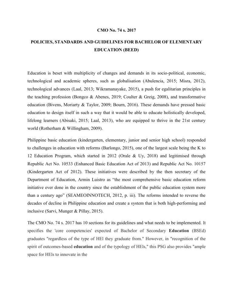CMO No. 74 s. 2017 POLICIES, STANDARDS AND GUIDELINES FOR BACHELOR OF ELEMENTARY EDUCATION (BEED) Education is beset with multiplicity of changes and demands in its socio-political, economic, technological and academic spheres, such as globalisation (Abulencia, 2015; Misra, 2012), technological advances (Laal, 2013; Wikramanayake, 2015), a push for egalitarian principles in the teaching profession (Bongco & Abenes, 2019; Coulter & Greig, 2008), and transformative education (Bivens, Moriarty & Taylor, 2009; Bourn, 2016). These demands have pressed basic education to design itself in such a way that it would be able to educate holistically developed, lifelong learners (Abisaki, 2015; Laal, 2013), who are equipped to thrive in the 21st century world (Rotherham & Willingham, 2009). Philippine basic education (kindergarten, elementary, junior and senior high school) responded to challenges in education with reforms (Barlongo, 2015), one of the largest scale being the K to 12 Education Program, which started in 2012 (Orale & Uy, 2018) and legitimised through Republic Act No. 10533 (Enhanced Basic Education Act of 2013) and Republic Act No. 10157 (Kindergarten Act of 2012). These initiatives were described by the then secretary of the Department of Education, Armin Luistro as “the most comprehensive basic education reform initiative ever done in the country since the establishment of the public education system more than a century ago” (SEAMEOINNOTECH, 2012, p. iii). The reforms intended to reverse the decades of decline in Philippine education and create a system that is both high-performing and inclusive (Sarvi, Munger & Pillay, 2015). The CMO No. 74 s. 2017 has 10 sections for its guidelines and what needs to be implemented. It specifies the 'core competencies' expected of Bachelor of Secondary Education (BSEd) graduates "regardless of the type of HEl they graduate from." However, in "recognition of the spirit of outcomes-based education and of the typology of HEls," this PSG also provides "ample space for HEls to innovate in the Section 1 is the rationale. Based on the guidelines for implementation of CMO No. 46 s 2012, this PSG implements the “shift to learning competency – based standards/ outcomes – based education” in response to the 21st century Philippine Teacher Education Framework. Furthermore, this PSG is anchored on the salient features of K to 12 Enhanced Curriculum (RA 10533), the Philippine Qualifications Framework € 83,s. 2012), the National Competency-based teacher standards (NCBTS) now the Philippine Professional standards for teacher (PPST). Section 2 ins all about government recognition, all private higher education institutions (PHEIs) intending to offer BEED programs must first secure proper authority from the Commission in accordance with this PSG. All PHIEs with an existing BEEd program are required to shift to an outcome based approach based on this PSG. Section 3 and 4 talk about the general provisions of the BEEd guidelines. Per Section 13 of RA 7722, the higher education institution shall exercise academic freedom in its curricular offerings but must comply with the minimum requirements for specific academic programs, the general education distribution requirement and the specific professional courses. Article IV is the program specification. Section 5 is the program Description, the degree program described herein shall be called Bachelor of Elementary education (BEEd) Section 8 curriculum description – The BEEd program is composed of New General Education Courses, Specialization/Major courses, elective/ cognate Courses, special topics, and mandated courses (PE and NSTP). Section 9 is the sample curriculum. Higher education Institutions offering the BEEd program may exercise flexibility in their curricular offering. However, the following courses are prescribed as minimum requirements to be implemented. References: ched.gov.ph/wp-content/uploads/2017/11/CMO-No.-74-s.-2017.pdf