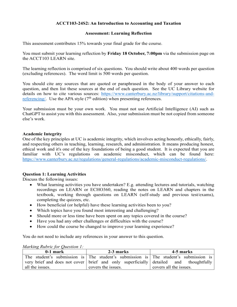 ACCT103-24S2: An Introduction to Accounting and Taxation Assessment: Learning Reflection This assessment contributes 15% towards your final grade for the course. You must submit your learning reflection by Friday 18 October, 7:00pm via the submission page on the ACCT103 LEARN site. The learning reflection is comprised of six questions. You should write about 400 words per question (excluding references). The word limit is 500 words per question. You should cite any sources that are quoted or paraphrased in the body of your answer to each question, and then list these sources at the end of each question. See the UC Library website for details on how to cite various sources: https://www.canterbury.ac.nz/library/support/citations-andreferencing/. Use the APA style (7th edition) when presenting references. Your submission must be your own work. You must not use Artificial Intelligence (AI) such as ChatGPT to assist you with this assessment. Also, your submission must be not copied from someone else’s work. Academic Integrity One of the key principles at UC is academic integrity, which involves acting honestly, ethically, fairly, and respecting others in teaching, learning, research, and administration. It means producing honest, ethical work and it's one of the key foundations of being a good student. It is expected that you are familiar with UC’s regulations on academic misconduct, which can be found here: https://www.canterbury.ac.nz/regulations/general-regulations/academic-misconduct-regulations/. Question 1: Learning Activities Discuss the following issues: • What learning activities you have undertaken? E.g. attending lectures and tutorials, watching recordings on LEARN or ECHO360, reading the notes on LEARN and chapters in the textbook, working through questions on LEARN (self-study and previous test/exams), completing the quizzes, etc. • How beneficial (or helpful) have these learning activities been to you? • Which topics have you found most interesting and challenging? • Should more or less time have been spent on any topics covered in the course? • Have you had any other challenges or difficulties with the course? • How could the course be changed to improve your learning experience? You do not need to include any references in your answer to this question. Marking Rubric for Question 1: 0-1 mark 2-3 marks 4-5 marks The student’s submission is The student’s submission is The student’s submission is very brief and does not cover brief and only superficially detailed and thoughtfully all the issues. covers the issues. covers all the issues. ACCT103-24S2 Learning Reflection Page 2 of 4 Question 2: Kaitiakitanga (or Guardianship) Applied to Financial Reporting The difference between operating income and expenses, which is called a profit or loss for entities in the corporate sector and a surplus or deficit for entities in the public and third sectors. This figure is the primary focus of attention when entities release their financial reports to the public. A loss or deficit is generally considered unacceptable to the governing board of entities and their stakeholders. Discuss whether financial reporting is overly focused on profit at the expense of people and planet, and then how financial reporting can be changed or reimagined, so that greater attention is placed on social and environmental challenges in the world. Marking Rubric for Question 2: 0-1 mark 2-3 marks The student’s submission is The student’s submission very brief and does not cover summarises the issues all the issues. discussed in the lecture slides and notes. The arguments are supported by a couple of references. 4-5 marks The student’s submission examines the issues discussed in the lecture slides and notes, and highlights alternatives for financial reporting. The arguments are supported by several references. Question 3: Valuation of Non-Current Assets For property, plant and equipment, an entity can choose to use the cost model or revaluation model under NZ IAS 16. The choice between the cost model and revaluation model and then the choice among valuation methods (fair value, current cost or value-in-use) significantly affects an entity’s income statement and balance sheet. For intangible assets, an entity can also choose to use the cost model or revaluation model under NZ IAS 38, although there are some restrictions. Most notably, internally generated brands and goodwill cannot be recognised as assets. Goodwill can be recognised as an asset but only upon acquisition under NZ IFRS 3. Non-current assets are also subject to depreciation and/or impairment. Discuss the merits and problems with how non-current assets are valued under the applicable NZ accounting standards. Also, discuss how, if at all, you would change the NZ accounting standards to resolve these problems. Limit your discussion to the large companies in corporate sector. Marking Rubric for Question 3: 0-1 mark 2-3 marks The student’s submission is The student’s submission very brief and does not cover summarises the issues all the issues. discussed in the lecture slides and notes. The arguments are supported by a couple of references. 4-5 marks The student’s submission examines the issues discussed in the lecture slides and notes, and highlights possible changes to NZ accounting standards. The arguments are supported by several references. ACCT103-24S2 Learning Reflection Page 3 of 4 Question 4: Capital Gains and Wealth Taxes Revisit the tutorial question, “Question 1: Discussion of the NZ Tax System”. During lectures and tutorials, there was some discussion of whether people with very high incomes and wealth are currently contributing enough taxation for the NZ tax system to be considered fair and equitable. For this question, you should discuss the possible merits and problems with introducing a comprehensive capital gains tax or a wealth tax in NZ. Conclude your answer by stating if you do or do not favour intro