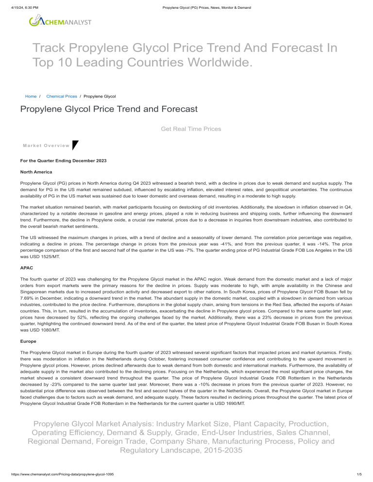 4/15/24, 6:30 PM Propylene Glycol (PG) Prices, News, Monitor & Demand Track Propylene Glycol Price Trend And Forecast In Top 10 Leading Countries Worldwide. Home / Chemical Prices / Propylene Glycol Propylene Glycol Price Trend and Forecast Get Real Time Prices Market Overview For the Quarter Ending December 2023 North America Propylene Glycol (PG) prices in North America during Q4 2023 witnessed a bearish trend, with a decline in prices due to weak demand and surplus supply. The demand for PG in the US market remained subdued, influenced by escalating inflation, elevated interest rates, and geopolitical uncertainties. The continuous availability of PG in the US market was sustained due to lower domestic and overseas demand, resulting in a moderate to high supply. The market situation remained bearish, with market participants focusing on destocking of old inventories. Additionally, the slowdown in inflation observed in Q4, characterized by a notable decrease in gasoline and energy prices, played a role in reducing business and shipping costs, further influencing the downward trend. Furthermore, the decline in Propylene oxide, a crucial raw material, prices due to a decrease in inquiries from downstream industries, also contributed to the overall bearish market sentiments. The US witnessed the maximum changes in prices, with a trend of decline and a seasonality of lower demand. The correlation price percentage was negative, indicating a decline in prices. The percentage change in prices from the previous year was -41%, and from the previous quarter, it was -14%. The price percentage comparison of the first and second half of the quarter in the US was -7%. The quarter ending price of PG Industrial Grade FOB Los Angeles in the US was USD 1525/MT. APAC The fourth quarter of 2023 was challenging for the Propylene Glycol market in the APAC region. Weak demand from the domestic market and a lack of major orders from export markets were the primary reasons for the decline in prices. Supply was moderate to high, with ample availability in the Chinese and Singaporean markets due to increased production activity and decreased export to other nations. In South Korea, prices of Propylene Glycol FOB Busan fell by 7.69% in December, indicating a downward trend in the market. The abundant supply in the domestic market, coupled with a slowdown in demand from various industries, contributed to the price decline. Furthermore, disruptions in the global supply chain, arising from tensions in the Red Sea, affected the exports of Asian countries. This, in turn, resulted in the accumulation of inventories, exacerbating the decline in Propylene glycol prices. Compared to the same quarter last year, prices have decreased by 52%, reflecting the ongoing challenges faced by the market. Additionally, there was a 23% decrease in prices from the previous quarter, highlighting the continued downward trend. As of the end of the quarter, the latest price of Propylene Glycol Industrial Grade FOB Busan in South Korea was USD 1080/MT. Europe The Propylene Glycol market in Europe during the fourth quarter of 2023 witnessed several significant factors that impacted prices and market dynamics. Firstly, there was moderation in inflation in the Netherlands during October, fostering increased consumer confidence and contributing to the upward movement in Propylene glycol prices. However, prices declined afterwards due to weak demand from both domestic and international markets. Furthermore, the availability of adequate supply in the market also contributed to the declining prices. Focusing on the Netherlands, which experienced the most significant price changes, the market showed a consistent downward trend throughout the quarter. The price of Propylene Glycol Industrial Grade FOB Rotterdam in the Netherlands decreased by -23% compared to the same quarter last year. Moreover, there was a -10% decrease in prices from the previous quarter of 2023. However, no substantial price difference was observed between the first and second halves of the quarter in the Netherlands. Overall, the Propylene Glycol market in Europe faced challenges due to factors such as weak demand, and adequate supply. These factors resulted in declining prices throughout the quarter. The latest price of Propylene Glycol Industrial Grade FOB Rotterdam in the Netherlands for the current quarter is USD 1690/MT. Propylene Glycol Market Analysis: Industry Market Size, Plant Capacity, Production, Operating Efficiency, Demand & Supply, Grade, End-User Industries, Sales Channel, Regional Demand, Foreign Trade, Company Share, Manufacturing Process, Policy and Regulatory Landscape, 2015-2035 https://www.chemanalyst.com/Pricing-data/propylene-glycol-1095 1/5 4/15/24, 6:30 PM Propylene Glycol (PG) Prices, News, Monitor & Demand Read More For the Quarter Ending September 2023 North America The prices of Propylene glycol declined by 2.87% in September compared to the levels noted in July. The third quarter saw a slowing in the growth of US company operations as a result of lower demand from both domestic and worldwide markets. In the United States, inflation climbed to 3.7% in August for the first time since June 2022, as a strong rise in energy prices pushed prices higher near the end of the summer, impacting even more on consumer confidence. Inflationary pressures suggest that the US economy is moving away from the Federal Reserve's 2% target rate, pushing officials to contemplate hiking interest rates later this year. The Federal Reserve hiked its key policy interest rate by 0.25 percent in July, the eleventh time in 17 months, to combat persistent inflation in the US economy, which has resulted in lower market demand. Rising fuel prices and high interest rates contributed to heightened economic uncertainty and weaker consumer confidence in September. Manufacturers reported another drop in new orders, with the greatest pace of contraction contributing to the negative tren