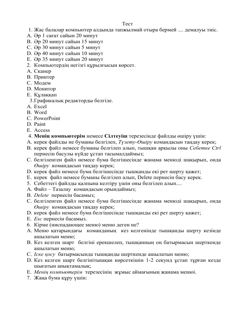 Тест 1. Жас балалар компьютер алдында тапжылмай отыра бермей .... демалуы тиіс. A. Әр 1 сағат сайын 20 минут B. Әр 20 минут сайын 15 минут C. Әр 30 минут сайын 5 минут D. Әр 40 минут сайын 10 минут E. Әр 35 минут сайын 20 минут 2. Компьютердің негізгі құрылғысын көрсет. A. Сканер B. Принтер C. Модем D. Монитор E. Құлаққап 3.Графикалық редакторды белгіле. A. Excel B. Word C. PowerPoint D. Paint E. Access 4. Менің компьютерім немесе Сілтеуіш терезесінде файлды өшіру үшін: A. керек файлды не буманы белгілеп, Түзету-Өшіру командасын таңдау керек; B. керек файл немесе буманы белгілеп алып, тышқан арқылы оны Себетке Ctrl пернесін басулы күйде ұстап тасымалдаймыз; C. белгіленген файл немесе бума белгішесінде жанама менюді шақырып, онда Өшіру командасын таңдау керек; D. керек файл немесе бума белгішесінде тышқанды екі рет шерту қажет; E. керек файл немесе буманы белгілеп алып, Delete пернесін басу керек. 5. Себеттегі файлды қалпына келтіру үшін оны белгілеп алып.... A. Файл – Тазалау командасын орындаймыз; B. Delete пернесін басамыз; C. белгіленген файл немесе бума белгішесінде жанама менюді шақырып, онда Өшіру командасын таңдау керек; D. керек файл немесе бума белгішесінде тышқанды екі рет шерту қажет; E. Esc пернесін басамыз. 6. Кірме (ниспадающее меню) меню деген не? A. Меню қатарындағы команданың кез келгенінде тышқанды шерту кезінде ашылатын меню; B. Кез келген шарт белгіні ерекшелеп, тышқанның оң батырмасын шерткенде ашылатын меню; C. Іске қосу батырмасында тышқанды шерткенде ашылатын меню; D. Кез келген шарт белгінітышқан көрсеткішін 1-2 секунд ұстап тұрған кезде шығатын анықтамалық; E. Менің компьютерім терезесінің жұмыс аймағының жанама менюі. 7. Жаңа бума құру үшін: A. Терезедегі бос орынға курсорды орналастырып, Түзету-Құру-Бума командасын таңдаймыз; B. Керек буманы ашып, Файл-Құру-Бума командасын таңдаймыз; C. Терезедегі бос орында жанама менюді шақып, одан Ашу-Бума командасын таңдаймыз; D. Белгіленген бума атына тышқан курсорын орналастырып, Кірістіру батырмасын шерту; E. Белгіленген буманы тышқан курсорын орналастырып, Кірістіру батырмасын шерту қажет. 8. Файлды флешжадқа көшіру үшін, көшірілетін файлды (буманы) белгілеп алып... A. Файл-Жіберу-Флешжады командасын орындау. B. Delete пернесін басу. C. Жанама менюді шақырып , оның Өшіру командасын орындау. D. Саймандар панеліндегі жабу батырмасын шерту. E. Буманы белгілеп тышқанды екі рет шерту. 9. Флешжадыны форматтау үшін Менің компьютерім бумасын ашып ... (қате жолды көрсетіңіз) A. Флешжадыны белгілеп алып, Файл-Форматтау командасын орныдау B. Windows бумасының ішіндегі Format командасын орныдау C. Флешжадыны белгісінде жанама менюді шақып, оның Форматтау командасын орныдау D. Флешжадыны белгісінде тышқанды екі рет шерту. E. Берілген жауаптардың бәрі дұрыс 10.Файлдарды өшіру үшін ... (қате жолды көрсетіңіз) A. Өшірілетін файлды (буманы) белгілеп алып, Файл-Өшіру командасын орындау B. Өшірілетін файлды (буманы) белгілеп алып, Delete пернесін басамыз; C. Өшірілетін файлды (буманы) белгілеп алып, жанама менюді шақып, оның Өшіру командасын орныдау D. Өшірілетін файлды (буманы) белгілеп алып, Саймандар панеліндегі батырмасын шерту. E. Өшірілетін файлды (буманы) белгілеп алып, тышқанды екі рет шерту. 11.WORD редакторын іске қосу былай орындалады (қате жолды көрсетіңіз): A. Басты менюдің Іске қосу-Программалар-Microsoft WORD қатарында шықанды шерту арқылы. B. Windows жүйесінің Менің компьютерім немесе Сі