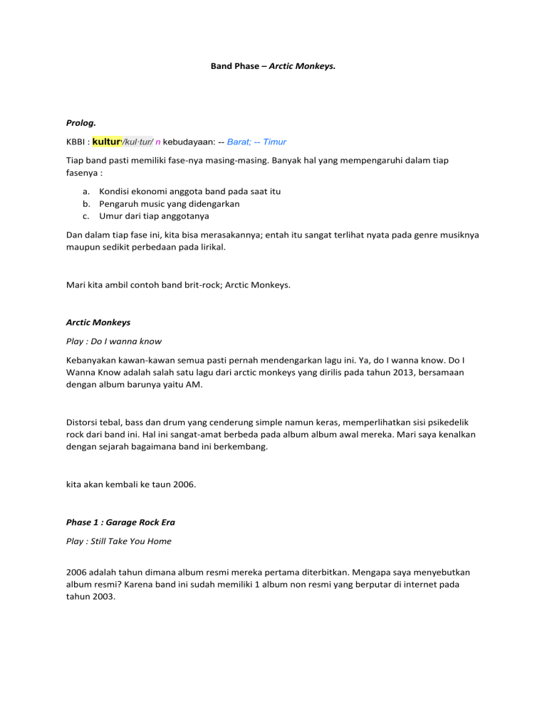 Band Phase – Arctic Monkeys. Prolog. KBBI : kultur /kul·tur/ n kebudayaan: -- Barat; -- Timur 1 Tiap band pasti memiliki fase-nya masing-masing. Banyak hal yang mempengaruhi dalam tiap fasenya : a. Kondisi ekonomi anggota band pada saat itu b. Pengaruh music yang didengarkan c. Umur dari tiap anggotanya Dan dalam tiap fase ini, kita bisa merasakannya; entah itu sangat terlihat nyata pada genre musiknya maupun sedikit perbedaan pada lirikal. Mari kita ambil contoh band brit-rock; Arctic Monkeys. Arctic Monkeys Play : Do I wanna know Kebanyakan kawan-kawan semua pasti pernah mendengarkan lagu ini. Ya, do I wanna know. Do I Wanna Know adalah salah satu lagu dari arctic monkeys yang dirilis pada tahun 2013, bersamaan dengan album barunya yaitu AM. Distorsi tebal, bass dan drum yang cenderung simple namun keras, memperlihatkan sisi psikedelik rock dari band ini. Hal ini sangat-amat berbeda pada album album awal mereka. Mari saya kenalkan dengan sejarah bagaimana band ini berkembang. kita akan kembali ke taun 2006. Phase 1 : Garage Rock Era Play : Still Take You Home 2006 adalah tahun dimana album resmi mereka pertama diterbitkan. Mengapa saya menyebutkan album resmi? Karena band ini sudah memiliki 1 album non resmi yang berputar di internet pada tahun 2003. Album pertama mereka berjudul Beneath the Boardwalk. Di bawah “Boardwalk”. Hal ini merujuk pada bar di tempat kelahiran band ini terbentuk, yaitu kota Sheffield. Kompilasi lagu ini pertama tersebar secara massif dari orang ke orang, tular tinular, yang akhirnya membawa nama mereka terdengar ke penjuru inggris Utara. Tipe lagu yang dibawakan pun memang mewakili sekali pada umur mereka – pemuda pemuda rebel pada jamannya – apalagi kalau bukan garage rock. Dan memang pada saat itu, Alex Turner dan temen temennya emang lagi ngulik banget band band Oasis, The Strokes dan The White Stripes. Dan itu berlanjut ke album resmi perdana mereka pada tahun 2006. Pada saat itu personil Arctic Monkeys - Alex Turner, Jamie Cook, Matt Helder dan Nick O Malley sedang berusia 20 tahun. Karakter dari lagu yang dibawain di album pertama mereka, Whatever People Say I Am, That’s What Im Not, emang nunjukkin banget kalo mereka lagi di fase remaja remaja nakal gitu. Main ke klub, mabok mabokan, ditangkep polisi gara gara keributan kecil, cerita tentang lihat cewek kesukaannya. Kita bisa ambil contoh di lagunya mereka Riot Van, yang ceritanya ya Cuma tentang sekumpulan temen temen, minum minum, bikin masalah, ditangkep polisi terus udah. Dan hal hal ini tertuang dengan sangat bagus ke lirikal lagu mereka, thanks to pak Alex Turner. Alex ini emang salah satu jenius kalo dalam hal pembuatan lirik. Dia bisa bawa pendengar lagunya tuh kaya ngerasain langsung cerita yang dibawain sama si Arctic Monkeys. Dibalut sama gitar yang renyah, bassline yang ciamik sekali dari pak Nick, dan drum yang gaada duanya dari Matt Helder, album Whatever People Say I Am, That’s What Im not ini jadi salah satu masterpiece yang membawa mereka jadi headliner di salah satu perhelatan music terbesar di dunia, yaitu Glastonbury. Lalu berlanjut ke 2007. Remaja remaja urakan ini melanjutkan pembuatan albumnya yang kedua yaitu Favourite Worst Nightmare. Di album kedua ini, aura garage rock mereka masih kental tetapi lebih dibalut dengan permainan alat music yang lebih rapih dan lebih “rumit”. Masih sama seperti album sebelumnya, lirik lirik dari pak Alex Turner pada album keduanya ini lebih masih lekat dengan cerita cerita anak remaja umur 20an tahun, dan diceritakan dengan sangat handal. 2 album ini, menjadi bukti bahwa band ini bukan hanya band biasa. Mereka bisa membuat sebuah lagu seperti sebuah film pendek, tanpa ada repetisi. Alunan music yang dihadirkan seperti backsound daripada cerita mereka, memancing emosi dari pendengar. Dinamika dari pergantian tempo di beberapa lagunya bisa membuat kita merasakan apa yang ingin disampaikan oleh Arctic Monkeys. Plays 505, “but I crumble completely when you cry” Mereka tidak hanya “membuat lagu”. Mereka melakukan story telling dengan sangat baik. Dan inilah mengapa era ini masih menjadi era favorit saya, bahkan era terbaik mereka versi saya.