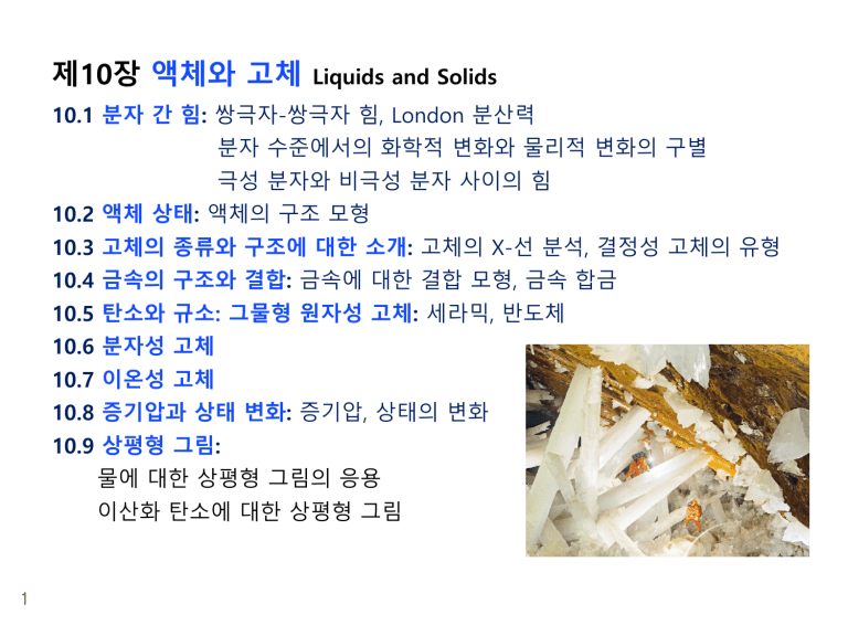 제10장 액체와 고체 Liquids and Solids 10.1 분자 간 힘: 쌍극자-쌍극자 힘, London 분산력 분자 수준에서의 화학적 변화와 물리적 변화의 구별 극성 분자와 비극성 분자 사이의 힘 10.2 액체 상태: 액체의 구조 모형 10.3 고체의 종류와 구조에 대한 소개: 고체의 X-선 분석, 결정성 고체의 유형 10.4 금속의 구조와 결합: 금속에 대한 결합 모형, 금속 합금 10.5 탄소와 규소: 그물형 원자성 고체: 세라믹, 반도체 10.6 분자성 고체 10.7 이온성 고체 10.8 증기압과 상태 변화: 증기압, 상태의 변화 10.9 상평형 그림: 물에 대한 상평형 그림의 응용 이산화 탄소에 대한 상평형 그림 1 제10장 액체와 고체 고체에서 액체로의 변화보다 액체에서 기체로 갈 때 변화의 정도가 훨씬 더 큼. 액체: 25°C, 1065atm에서 밀도: 1.046 g/cm3 기체: 400°C, 242atm에서 밀도: 0.157 g/cm3 (기체가 훨씬 더 큰 압축률의 변화) 액체와 고체는 비슷하며, 액체와 고체는 기체와는 뚜렷이 다르다. 2 10.1 분자간 힘 - 쌍극자-쌍극자 힘 물질의 응축상(액체와 고체)의 성질과, 액체와 고체를 형성하는 물질의 구성 성분을 응집시키는 힘을 생각해 보자. 이러함 힘은 공유 결합이나 이온 결합일 수도 있고, 분자간 힘(intermolecular force)이라 부르는 보다 약한 상호 작용일 수도 있다. 쌍극자-쌍극자 힘 쌍극자-쌍극자 힘은 공유 결합 또는 이온 결합의 약 1%에 불과하며 쌍극자 간의 거리가 증가함에 따라 급격히 약화됨. 3 기체 상태에서는 이 힘은 비교적 덜 중요함. 10.1 분자간 힘 - 쌍극자-쌍극자 힘 N, O, F 와 같이 전기음성도가 큰 원자에 H가 결합된 분자들 사이에는 매우 큰 쌍극자-쌍극자 힘: 수소 결합 (hydrogen bonding) - 결합의 극성이 큼. - H의 크기가 작기에 쌍극자들이 가까이 올 수 있음. 4 10.1 분자간 힘 - 쌍극자-쌍극자 힘 각 족의 첫 원소들은 큰 전기 음성도를 가짐. 큰 극성의 X-H 결합 형성 크기가 작아서 쌍극자들이 더욱 가까이 접근 5 쌍극자-쌍극자 힘증가 10.1 분자간 힘 – London 분산력 London 분산력 (London dispersion force) - 불활성 기체 원자들 또는 비극성 분자들 사이에 존재하는 비교적 약한 힘 - 순간 쌍극자(instantaneous dipole)와 이에 의한 유발 쌍극자(induced dipole)에 기인 6 10.1 분자간 힘 – London 분산력 쌍극자 모멘트가 없는 분자들 간에도 힘이 작용함. - 원자 또는 비극성 분자(H2, CH4, CCl4, CO2)는 순간적으로 비대칭적인 전하 분포를 하여 순간 쌍극자를 만듦. → 순간 쌍극자는 인접한 원자/비극성 분자에 유발 쌍극자를 생성 표 10.2에서 어는 점은 족의 아래로 내려감에 따라 상승 ∵ (1) 원자번호 ↑ 전자수 ↑ 순간 쌍극자 인력의 발생 확률↑ (2) 분극성(polarizability): 원자의 전자 구름이 쌍극자 전하 분포를 가짐을 나타냄. 많은 전자를 가진 원자/비극성 분자는 더 큰 분극성 더 큰 London 분산력 7 10.2 액체 상태 액체를 고체 표면에 쏟았을 때 방울이 되려는 경향 분자 간 힘 때문에 나타나는 현상 표면 장력 (surface tension) - 액체가 표면적을 크게 하지 않으려 하는 현상 (액체의 저항력) - 액체의 표면적의 증가를 위해서는 분자들을 액체의 내부에서 표면으로 옮겨야 함. - 이것은 분자간 힘을 극복하여야 함. 액체의 표면적이 증가하려면 에너지가 필요함. 8 10.2 액체 상태 모세관 작용 (capillary action) - 극성 액체들에서 나타나는 좁은 관 속에서 액체가 스스로 올라가는 현상 - 액체 분자간의 힘인 응집력과 액체 분자와 용기(또는 좁은 관 사이)의 접착력이 관련됨. - 물의 경우 접착력은 용기가 극성 결합을 가진 물질로 만들어졌을 때 작용 ex) 유리는 부분 음전하를 가진 산소 원자를 많이 포함하고 있음. - 물은 강한 응집력과 유리에 대한 강한 접착력을 동시에 가짐. - 물 기둥의 무게가 유리 표면에 이끌리는 물 접착력과 균형을 이루는 높이까지 위로 올라감. 물의 표면적 증가 표면적을 최소화하려는 응집력의 저항 meniscus의 오목면은 유리에 대한 물의 접착력이 응집력보다 크다는 것을 의미 meniscus의 볼록면은 유리에 대한 수은의 접착력이 응집력보다 작다는 것을 의미 9 10.2 액체 상태 10 10.3 고체의 형태와 구조에 대한 소개 고체 결정성 고체 (crystalline solid): 구성 성분이 매우 규칙적인 배열을 함. 비결정성 고체 (amorphous solid): 구조가 상당히 무질서 함. 단위 세포 (unit cell) - 결정성 고체에서 구성성분(원자,이온,분자)들의 위치를 지정하는 점들로 이루어진 삼차원 계이며, 격자의 반복되는 가장 작은 단위 격자(lattice) - 단위 세포를 모든 삼차원 방향으로 반복함으로 만들 수 있음. 11 10.3 고체의 형태와 구조에 대한 소개 12 10.3 고체의 형태와 구조에 대한 소개 – 결정성 고체의 유형 이온성 고체 (ionic solid): 격자점을 이온이 차지 ex) 소금 결정성 고체 분자성 고체 (molecular solid): 격자점을 중성 분자가 차지 ex) 얼음, 설탕(sucrose) 원자성 고체 (atomic solid): 격자점을 원자가 차지/ 금속 + 그물형 + 8족기체 ex) 철. 탄소(흑연, 다이아몬드, 풀러렌), 규소, 알곤등 13 원자성 고체 (다이아몬드) 이온성 고체 (소금: 염화 소듐) 분자성 고체 (얼음) 10.3 고체의 형태와 구조에 대한 소개 – 결정성 고체의 유형 원자 사이에 존재하는 결합의 종류에 따라 원자성 고체는 금속성 고체: 비편재화되고 지향성이 
