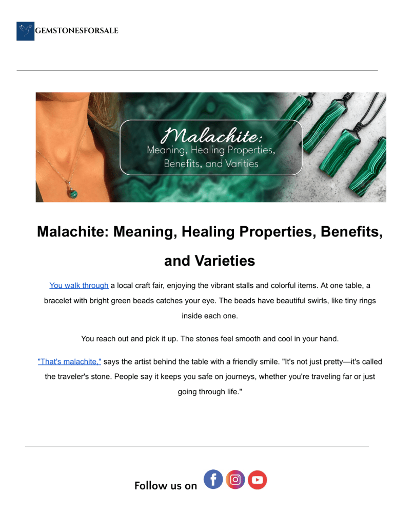 Malachite: Meaning, Healing Properties, Benefits, and Varieties You walk through a local craft fair, enjoying the vibrant stalls and colorful items. At one table, a bracelet with bright green beads catches your eye. The beads have beautiful swirls, like tiny rings inside each one. You reach out and pick it up. The stones feel smooth and cool in your hand. "That's malachite," says the artist behind the table with a friendly smile. "It's not just pretty—it's called the traveler's stone. People say it keeps you safe on journeys, whether you're traveling far or just going through life." Follow us on You try it on, and somehow, it just feels special. Its deep green color and the artist's words are with you, so it is much more than just another bracelet that has a story. What is Malachite? Malachite is a beautiful green mineral that became popular because of its interesting patterns and colors. For hundreds of years already, its fascinating looks and metaphysical properties have been considered worthy of being an object of treasure. Belonging to the classification of copper carbonate hydroxide, the malachite crystal is normally characterized by bands of greenish or bluish and dark colors. Its outstanding visual attractiveness is complemented by transformation, protection, and healing qualities. Follow us on This mineral is found in copper deposits, typically with many other minerals, including azurite, chrysocolla, and turquoise. It is rather softer than most gemstones. Thus, it has been handled with care and, of course, properly kept. Meaning and Symbolism of Malachite Malachite meaning is often considered the "stone of transformation." It symbolizes growth, renewal, and the vitality of nature with its rich tones of green. It is connected to spiritual growth, emotional healing, and protection over the centuries. Let's see what symbolic value it holds: Transformation: ● Fosters personal growth and brings out negative patterns. ● During periods of major change, it supports individuals. Follow us on Protection: ● It protects from harmful negative energies and psychic attacks. ● It absorbs pollutants within the environment and the aura. Heart Chakra Connection: ● The heart chakra is opened and aligned, facilitating love, empathy, and compassion. ● Deep emotional healing through forgiveness and understanding Empowerment: ● Builds confidence and strengthens willpower ● Encourages risk-taking and adventure Follow us on Malachite's symbolism also shows how it can cultivate emotional and spiritual growth and thus, is a potent tool for those seeking balance and renewal. History of Malachite Malachite has been around for thousands of years. For its color and metaphysical properties, it has been in use by many cultures and civilizations, and so is a sought-after gemstone for thousands of years. Greek and Roman Civilizations: ● Malachite represented Venus in Greek and Roman cultures. The goddess symbolized love and beauty. ● Decorative art highly utilizes it. It is protected from the evil eye in talismans. Medieval ● The malachite during the medieval years protected people from curses of evil eyes. ● Travelers took it along to preserve them from any danger as well as an evil fortune that could occur during their traveling. Renaissance and Beyond: ● Malachite was used extensively in Europe for decorative purposes in sculptures, ornaments, and palatial interiors. Follow us on ● In the 19th century, Russian artisans extensively used malachite in creating elaborate vases, tabletops, and columns. ● From ancient rituals to modern decor, malachite's allure has remained timeless. What Is the Healing Property? Malachite is considered to possess excellent healing properties, working across emotional, physical, and spiritual dimensions. Now let's discuss the range of malachite benefits: Follow us on Healing for Emotions ● Removes Stress: Helps ease the mind and bring back the feelings of having little or no anxiety/stress. ● Emotional Healing: Malachite healing balances mood swing patterns and promotes inner serenity. ● Trauma Healers: Encourages one to reflect on things they have been through so far and helps overcome painful past emotional wounds. Physical Cure ● Pain Relief: Relieves the pain in the joints and muscles, as well as menstrual cramps. ● Detoxification: It removes toxins from the body. It is also an immune system booster. ● Circulatory Well-being: The drug promotes proper blood flow and tissue oxygenation. Follow us on Spiritual Healing Heart Chakra Primarily resonates with the heart chakra but also activates the throat and third eye chakra. ● Energy Cleansing Breaks blockages in the aura and promotes the free movement of energy. ● Spiritual Growth Helps to develop one's intuition and deepen his meditation practices. ● Malachite healing priorities makes it an excellent crystal for holistic health. What is Malachite Used For? Malachite's versatility is not just limited to its aesthetic. It has applications in jewelry, decoration, metaphysics, and even as an old pigment. Jewelry Follow us on ● Malachite is popularly used for making rings, necklaces, bracelets, and earrings because of its striking patterns. ● It is usually set in protective designs or used in combination with sturdier materials due to its softness. Decorative Objects Primarily produced as vases, bowls, and sculptures to be used for the decoration of an interior Malachite's rich look is a favorite for luxury decoration. Metaphysical Properties Malachite properties are highly utilized for meditation and energy healing to facilitate change and protection. Best used in living areas or rooms to absorb bad energy and increase positive energy. Pigments ● Malachite has been used for ages, ground into powder to be used as green pigments in art and cosmetics. ● Ancient wall paintings and manuscripts used malachite for its bright green color. ● Malachite combines practicality with spiritua