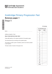 * 0 0 3 4 9 3 4 2 4 1 * Cambridge Primary Progression Test Science paper 1 Stage 5 45 minutes For Teacher’s Use Name ………………………………………………….………………………. Additional materials: Ruler Page 1 2 3 READ THESE INSTRUCTIONS FIRST 4 Answer all questions in the spaces provided on the question paper. 5 You should show all your working on the question paper. 6 7 The number of marks is given in brackets [ ] at the end of each question or part question. The total number of marks for this paper is 50. 8 9 10 11 12 13 14 15 16 17 18 19 20 Total SCIENCE 01_S5_6RP © UCLES 2018 Mark 3 1 Insects can pollinate flowers. For Teacher’s Use insect petal The flowers attract insects. (a) Tick () the two features of flowers that attract insects for pollination. bright petals green leaves seed pod small petals sweet smell [2] (b) Describe how the insect takes the pollen to another flower. Circle the correct answer. the insect drinks the pollen the insect eats the pollen the insect holds the pollen in its hands the pollen sticks to the insect [1] © UCLES 2018 S/S5/01 [Turn over 4 2 The Earth and Sun are part of the universe. For Teacher’s Use Complete the sentences. Choose from the following words. minute hour day week month year (a) The Earth spins on its axis once every ............................................. . [1] (b) The Earth orbits the Sun once every ............................................. . [1] © UCLES 2018 S/S5/01 5 3 The diagram shows a simple water cycle. water droplets in clouds For Teacher’s Use water vapour in clouds process A rain process B water on and in the Earth’s surface sea water rivers and lakes (a) What is the name of process A? ................................................................................................................ [1] (b) What is the name of process B? ................................................................................................................ [1] (c) Sea water contains dissolved salt. Explain why the water vapour in clouds does not contain any salt. .................................................................................................................... ................................................................................................................ [1] (d) Sometimes clouds make snow rather than rain. Explain why. .................................................................................................................... .................................................................................................................... ................................................................................................................ [2] © UCLES 2018 S/S5/01 [Turn over 6 4 Mike looks at different materials. plastic in spectacle lens wood door For Teacher’s Use cotton lampshade glass in magnifying glass metal pan water in a jug (a) Put the materials in the correct group. One has been done for you. transparent translucent opaque cotton [2] © UCLES 2018 S/S5/01 7 (b) Draw a line from each word to its meaning. For Teacher’s Use word meaning transparent allows no light to pass through translucent allows some light to pass through opaque allows all light to pass through [1] © UCLES 2018 S/S5/01 [Turn over 8 5 Safia investigates germination. For Teacher’s Use Here is what she does. Safia • chooses two seeds • puts the seeds in a cup with cotton wool • pours water into the cup using a jug • waits for the seeds to germinate. (a) Safia only uses two seeds. Why is it a good idea to use more seeds? ................................................................................................................ [1] (b) Describe how Safia knows the seeds have germinated. ................................................................................................................ [1] (c) Safia wants to make some measurements in this investigation. Write down one thing she measures. ................................................................................................................ [1] © UCLES 2018 S/S5/01 9 6 Mercury is a silver liquid with a low melting point and a high boiling point. For Teacher’s Use (a) What is the meaning of the words melting point? .................................................................................................................... ................................................................................................................ [2] (b) Mercury is a dangerous metal. It forms a poisonous vapour at room temperature. What is the name of the process that makes this vapour? ................................................................................................................ [1] (c) Mercury vapour can be changed back into mercury liquid. Suggest how this could be done. ................................................................................................................ [1] © UCLES 2018 S/S5/01 [Turn over 10 7 Blessy and Mike investigate shadows. Blessy For Teacher’s Use Mike shadow • Blessy stands outside in the sunshine. • Mike draws around the shadow she makes. Blessy and Mike do this again 2 hours later. (a) Predict what happens to Blessy’s shadow. ................................................................................................................ [1] (b) Mike thinks that the same thing will happen every day. What does he do to test his idea? ................................................................................................................ [1] (c) Write down one way to make this test fair. ................................................................................................................ [1] © UCLES 2018 S/S5/01 11 8 The pictures show different seeds. For Teacher’s Use Draw a line from each seed to the way it is dispersed. seed dispersed burst open blackberry carried in the wind coconut eat