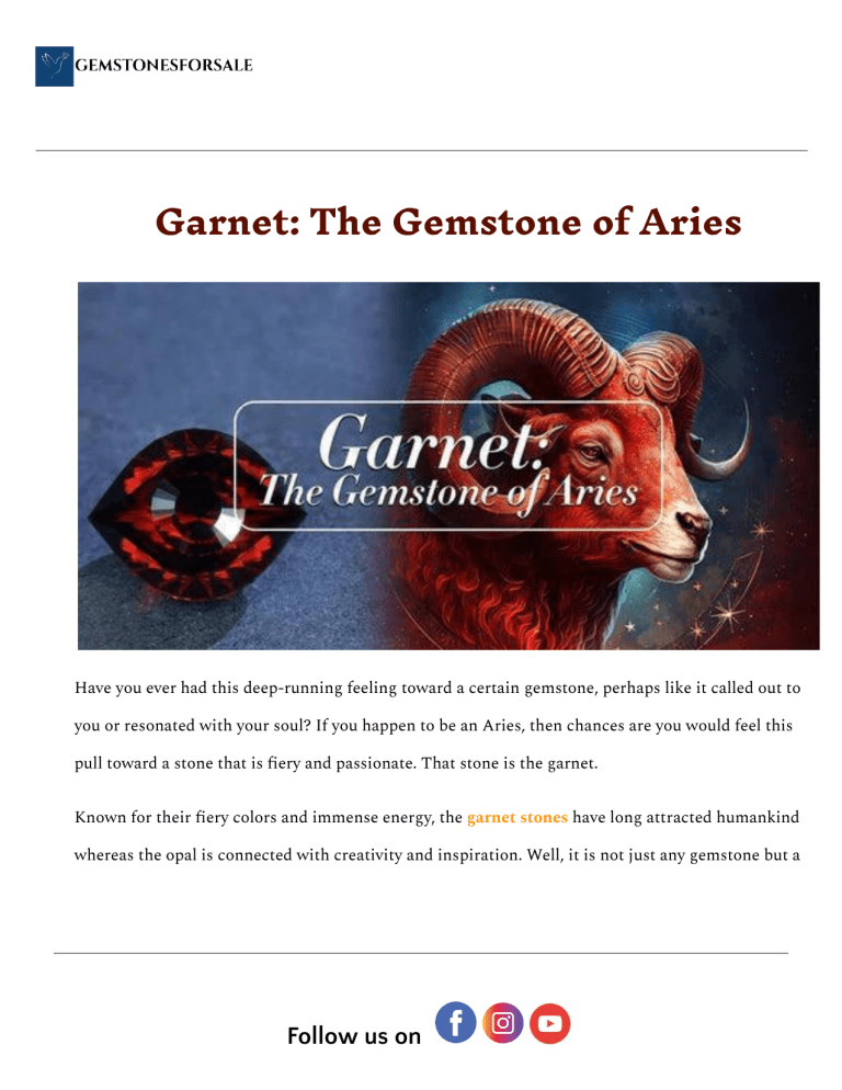 Garnet: The Gemstone of Aries Have you ever had this deep-running feeling toward a certain gemstone, perhaps like it called out to you or resonated with your soul? If you happen to be an Aries, then chances are you would feel this pull toward a stone that is fiery and passionate. That stone is the garnet. Known for their fiery colors and immense energy, the garnet stones have long attracted humankind whereas the opal is connected with creativity and inspiration. Well, it is not just any gemstone but a Follow us on January birthstone. What makes this stone special to Aries becomes the question here. Let's delve into the world of garnets to discover what magic binds this fiery sign to this stone. Garnet: More Than Just a Pretty Stone Probably the most interesting gemstone is the garnet stone, available in a wide range of colors that range from conventional deep red to seldom green and even orange. Its name comes from the Latin "granatus," which means pomegranate, due to its resemblance to the seeds of this fruit. While being a self-exquisitely beautiful stone, garnet is said to further sustain many powerful metaphysical properties. It is most associated with the process of passion, energy, and vitality—things that easily and ably merge with the Aries personality. If you want to read more about other gemstone : Aurora Opal Garnet: The Aries Birthstone Garnet birthstone is the birthstone for January and is specially situated in the hearts of Aries individuals. They are known for their fiery spirits, determination, and leadership qualities. It is believed to bring out those kinds of abilities within one, hence being able to become companions with that dynamic of a zodiac. Follow us on If you want to know more about the January birthstone read the blog “ Garnet: The January Birthstone with a Rich History” Power of Garnet for Aries Follow us on The association between Garnet and Aries runs a bit deeper. Let us see how this precious stone can help people born under this fiery sign. ● Enabling Energy and Vigor: Aries are known for the immense amount of energy that they seem to possess; garnet is said to enhance this endless energy found naturally in the subjects. It will make you feel more alive, impelling you toward your goals. ● Creativity and passion. Aries are people who have a definite tendency to be creative and passionate. Garnet stone will bring out the inner flame in you and help you to live with a new boldness and originality in expression. It strengthens your courage and determination. Since Aries are natural-born leaders, they have unyielding courage. It would supposedly enhance this and let one do things they find challenging but with determination and resilience. ● Balancing Emotions: With the reputation of Aries to have a hot head, they also hold an inner deep well of emotion. This is where garnet can help to balance emotions and promote emotional stability and self-awareness. Garnet is one of the stones of action and passion, whereas moonstone is more associated with intuition and feminine energy. Also Known: Why is Aurora Opals the most popular type of Opals? The Many Faces of Garnet Stones Follow us on You may not know that garnet is a stone available in myriad colors and you can buy these stones from GemstonesForSale. So, let's talk about some of the most popular ones: ● Red Garnet: This would be the most stereotypical color you associate with garnet stones. For example, it symbolizes passion, energy, and vigor. ● Green Garnet (Tsavorite): This is one of the rare and highly valuable kinds of garnet. It reflects an intense green color. ● Spessartine (Orange Garnet): It is bright, sunny, and jolly and shares warmth and positivity. While red garnet often can be the most recognized, each of these types has its different properties and energies. Follow us on For detail explanation do check the blog “ Colors of Garnet: Exploring the Diverse Color Spectrum" Garnet Price: Worth the Investment The price of garnet varies with the colour, clarity, cut, and carat weight, and is generally low, being considered an affordable gemstone compared to diamonds or sapphires. On the other hand, high-quality garnet stones command a high price. You can also check the prices on GemstonesForSale. Follow us on You will be making a smart move if you can invest in a beautiful garnet piece. Of course, you will now have a really beautiful article of jewelry, but more importantly, you will then have its energy working for you. Garnet Stone Benefits: More Than Beauty While exhibiting an absolutely stunning appearance, the garnet stone is believed to offer a host of benefits. The belief is that wearing garnet can do so much as to: ● Emotional Well-being: Garnet has been linked to healing in terms of the emotions. It is said to pacify stress, anxiety, and depression. It's believed to increase self-esteem and passion. ● Physical Health: This dynamic stone is said to enhance energy, circulation, and immunological function. ● Spiritual Growth: It is said that the stone garnet stimulates creativity, intuition, and spiritual awareness. It is often used for grounding and protection. While garnet is always focused on energy and vitality, malachite is often associated with transformation and growth. ● Love and Relationships: Some consider garnet to increase love, passion, and commitment in a relationship, so it is often given as a gift among lovers. Natural Garnet Stone - The Real Deal Follow us on While buying garnet jewelry, one has to select the natural garnet stone over synthetic or treated forms of this gemstone. A natural garnet stone organically contains the authentic energy and properties associated with this gemstone. Main source of blog : Garnet: The Gemstone of aries Conclusion Garnet represents the forever charming gemstone, being strongly connected to the Aries zodiac sign. Colors of the garnet stone are vivid, and according to many traditions, they symbolize passion, energy, and