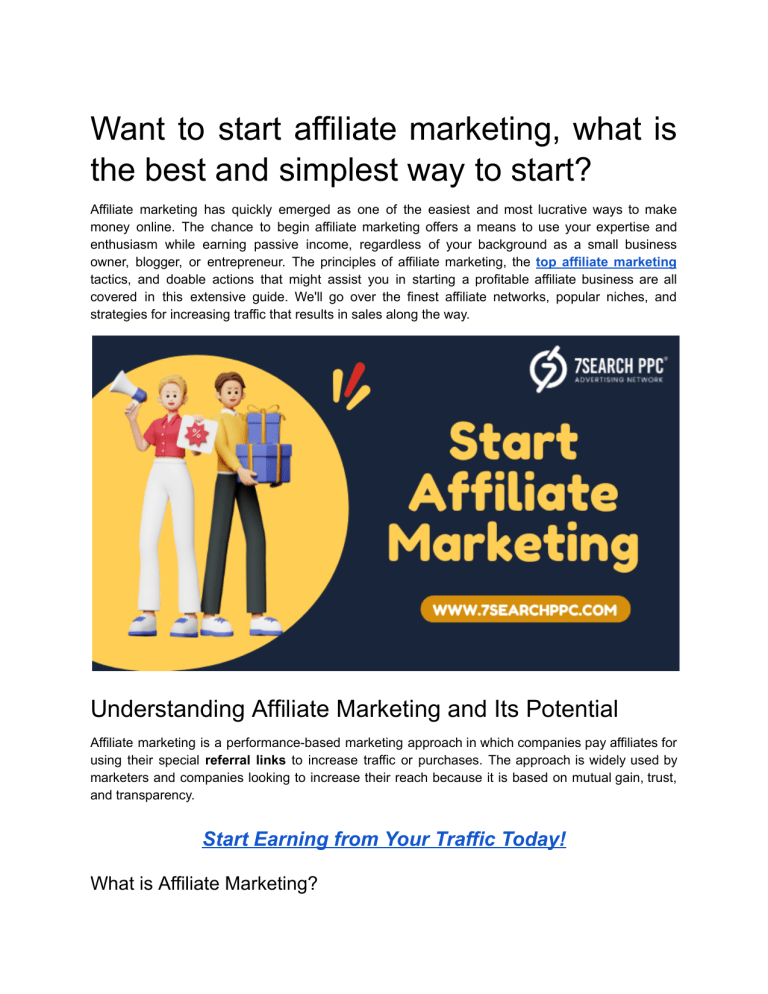 Want to start affiliate marketing, what is the best and simplest way to start? Affiliate marketing has quickly emerged as one of the easiest and most lucrative ways to make money online. The chance to begin affiliate marketing offers a means to use your expertise and enthusiasm while earning passive income, regardless of your background as a small business owner, blogger, or entrepreneur. The principles of affiliate marketing, the top affiliate marketing tactics, and doable actions that might assist you in starting a profitable affiliate business are all covered in this extensive guide. We'll go over the finest affiliate networks, popular niches, and strategies for increasing traffic that results in sales along the way. Understanding Affiliate Marketing and Its Potential Affiliate marketing is a performance-based marketing approach in which companies pay affiliates for using their special referral links to increase traffic or purchases. The approach is widely used by marketers and companies looking to increase their reach because it is based on mutual gain, trust, and transparency. Start Earning from Your Traffic Today! What is Affiliate Marketing? A system known as affiliate marketing links service providers or product developers with affiliates who market their goods in exchange for a commission. As an affiliate, you take on the role of a marketer by suggesting goods and services that fit the interests of your target audience. You may direct your audience to worthwhile products and make money from each successful referral by incorporating your own experiences, sincere reviews, and professional guidance into your material. This approach is especially alluring since it makes use of already-existing companies and their goods rather than requiring you to develop your own. How Does Affiliate Marketing Work? The procedure is simple but effective. You start by signing up for an affiliate program that a business or affiliate network offers. After that, you get special tracking links that you may use in your blog entries, social media postings, and website. You receive a commission based on the sale when a visitor clicks on your link and completes a transaction. The catchphrase "Start Affiliate Marketing" for novices wishing to venture into the world of internet commerce was born because of this system's simplicity. The scalability of affiliate marketing is what really makes it unique; you can begin with little money and progressively grow your portfolio by experimenting with different tactics and branching out into different categories. Key Elements of Affiliate Marketing A number of essential components form the basis of an effective affiliate marketing strategy. The first is the significance of high-quality material that establishes authority and trust. Next, it's critical to choose the appropriate platforms and products. Additionally, marketers need to be skilled at generating visitors via a variety of platforms, including paid advertising and organic search. Lastly, ongoing campaign optimization and analysis guarantee that your efforts are constantly in line with the changing demands of your target demographic. All of these components work together to create a system that turns visitors into devoted clients in addition to drawing them in. Start Affiliate Marketing: The Best Affiliate Marketing Strategies Developing your strategy is one of the first steps in creating your affiliate empire. Your success may significantly change if you choose the best affiliate marketing strategies. From content production to traffic generation, having a clear goal is crucial, as is a dedication to giving your audience real value. Identifying Top Affiliate Marketing Niches Selecting a specialization that aligns with your skills and interests is essential to starting your affiliate marketing career. You have a better chance of establishing a genuine connection with your audience and creating a community around your suggestions if you choose one of the Top Affiliate Marketing Niches. Your selected expertise, whether it be technology, travel, finance, or health and wellness, should not only represent consumer need but also enable you to produce informative content that increases conversions. The most prosperous affiliates frequently discover that their enthusiasm for a topic instantly translates into audience trust, which eventually boosts conversion rates and income. Choosing the Best Affiliate Marketing Site and Platforms The next important step after identifying your specialty is determining where to focus your affiliate marketing efforts. Having a platform that supports your objectives is crucial, regardless of whether you choose a specialized blog, social media accounts, or an extensive website. Starting with the Best Affiliate Marketing Site—a website that is easy to use, aesthetically pleasing, and search engine optimized—is something that many prosperous marketers stress. Choosing the Best Affiliate Platforms that provide competitive commissions, a wide variety of products, and dependable tracking is equally crucial. A lot of these platforms include comprehensive analytics, which can help you gradually improve your approach. Benefits of Using Reputable Affiliate Platforms Engaging with reputable affiliate networks can greatly expedite your process. These platforms have a number of advantages, such as simple integration and powerful reporting capabilities that let you monitor your performance in real time. You can concentrate less on the technical parts of affiliate management and more on producing interesting content by collaborating with reliable platforms. Long-term success in the fiercely competitive online industry is thus ensured by the stronger ties you are able to build with both your audience and the businesses you endorse. Creating Quality Content and Attracting Traffic While selecting the right niche and platforms is vital, the heart of affiliate marketing lies in your ability to create com