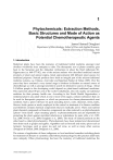 1 Phytochemicals: Extraction Methods, Basic Structures and Mode of Action as Potential Chemotherapeutic Agents James Hamuel Doughari Department of Microbiology, School of Pure and Applied Sciences, Federal University of Technology, Yola Nigeria 1. Introduction Medicinal plants have been the mainstay of traditional herbal medicine amongst rural dwellers worldwide since antiquity to date. The therapeutic use of plants certainly goes back to the Sumerian and the Akkadian civilizations in about the third millenium BC. Hippocrates (ca. 460–377 BC), one of the ancient authors who described medicinal natural products of plant and animal origins, listed approximately 400 different plant species for medicinal purposes. Natural products have been an integral part of the ancient traditional medicine systems, e.g. Chinese, Ayurvedic and Egyptian (Sarker & Nahar, 2007). Over the years they have assumed a very central stage in modern civilization as natural source of chemotherapy as well as amongst scientist in search for alternative sources of drugs. About 3.4 billion people in the developing world depend on plant-based traditional medicines. This represents about 88 per cent of the world’s inhabitants, who rely mainly on traditional medicine for their primary health care. According to the World Health Organization, a medicinal plant is any plant which, in one or more of its organs, contains substances that can be used for therapeutic purposes, or which are precursors for chemo-pharmaceutical semi synthesis. Such a plant will have its parts including leaves, roots, rhizomes, stems, barks, flowers, fruits, grains or seeds, employed in the control or treatment of a disease condition and therefore contains chemical components that are medically active. These non-nutrient plant chemical compounds or bioactive components are often referred to as phytochemicals (‘phyto-‘ from Greek - phyto meaning ‘plant’) or phytoconstituents and are responsible for protecting the plant against microbial infections or infestations by pests (Abo et al., 1991; Liu, 2004; Nweze et al., 2004; Doughari et al., 2009). The study of natural products on the other hand is called phytochemistry. Phytochemicals have been isolated and characterized from fruits such as grapes and apples, vegetables such as broccoli and onion, spices such as turmeric, beverages such as green tea and red wine, as well as many other sources (Doughari & Obidah, 2008; Doughari et al., 2009). The science of application of these indigenous or local medicinal remedies including plants for treatment of diseases is currently called ethno pharmacology but the practice dates back since antiquity. Ethno pharmacology has been the mainstay of traditional medicines the www.intechopen.com 2 Phytochemicals – A Global Perspective of Their Role in Nutrition and Health entire world and currently is being integrated into mainstream medicine. Different catalogues including De Materia Medica, Historia Plantarum, Species Plantarum have been variously published in attempt to provide scientific information on the medicinal uses of plants. The types of plants and methods of application vary from locality to locality with 80% of rural dwellers relying on them as means of treating various diseases. For example, the use of bearberry (Arctostaphylos uva-ursi) and cranberry juice (Vaccinium macrocarpon) to treat urinary tract infections is reported in different manuals of phytotherapy, while species such as lemon balm (Melissa officinalis), garlic (Allium sativum) and tee tree (Melaleuca alternifolia) are described as broad-spectrum antimicrobial agents (Heinrich et al., 2004). A single plant may be used for the treatment of various disease conditions depending on the community. Several ailments including fever, asthma, constipation, esophageal cancer and hypertension have been treated with traditional medicinal plants (Cousins & Huffman, 2002; Saganuwan, 2010). The plants are applied in different forms such as poultices, concoctions of different plant mixtures, infusions as teas or tinctures or as component mixtures in porridges and soups administered in different ways including oral, nasal (smoking, snoffing or steaming), topical (lotions, oils or creams), bathing or rectal (enemas). Different plant parts and components (roots, leaves, stem barks, flowers or their combinations, essential oils) have been employed in the treatment of infectious pathologies in the respiratory system, urinary tract, gastrointestinal and biliary systems, as well as on the skin (Rojas et al., 2001; R´ıos & Recio, 2005; Adekunle & Adekunle, 2009). Medicinal plants are increasingly gaining acceptance even among the literates in urban settlements, probably due to the increasing inefficacy of many modern drugs used for the control of many infections such as typhoid fever, gonorrhoea, and tuberculosis as well as increase in resistance by several bacteria to various antibiotics and the increasing cost of prescription drugs, for the maintenance of personal health (Levy, 1998; Van den Bogaard et al., 2000; Smolinski et al., 2003). Unfortunately, rapid explosion in human population has made it almost impossible for modern health facilities to meet health demands all over the world, thus putting more demands on the use of natural herbal health remedies. Current problems associated with the use of antibiotics, increased prevalence of multiple-drug resistant (MDR) strains of a number of pathogenic bacteria such as methicillin resistant Staphylococcus aureus, Helicobacter pylori, and MDR Klebsiela pneumonia has revived the interest in plants with antimicrobial properties (Voravuthikunchai & Kitpipit, 2003). In addition, the increase in cases of opportunistic infections and the advent of Acquired Immune Deficiency Syndrome (AIDS) patients and individuals on immunosuppressive chemotherapy, toxicity of many antifungal and antiviral drugs has imposed pressure on the scientific community and pharmaceutical 