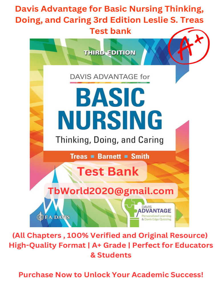 Davis Advantage for Basic Nursing Thinking, Doing, and Caring 3rd Edition Leslie S. Treas Test bank Test Bank TbWorld2020@gmail.com (All Chapters , 100% Verified and Original Resource) High-Quality Format | A+ Grade | Perfect for Educators & Students Purchase Now to Unlock Your Academic Success! 1 Treas: Basic Nursing, 3e Chapter 10 Chapter 10. Family Health Multiple Choice Identify the choice that best completes the statement or answers the question. ____ 1. The graduate nurse tells the preceptor that the newly admitted patient has a strange living arrangement. The patient lives in a household that consists of two aunts, a grandparent, a niece, a nephew, and their best friend. Which response by the preceptor is best? 1. “You are correct. That is a different type of household.” 2. “That is an example of a family defined by a different culture.” 3. “This is considered an extended family, which is not unusual.” 4. “This type of blended family is statistically shown to be increasing.” ____ 2. An older adult patient is admitted to the hospital with heart failure. The patient’s best friend is present during admission. The two have shared a home since they were widowed 3 years ago. Both have grown children who live out of state. Which family nursing approach does the nurse use? 1. Involve the friend in the care, discharge planning, and home care. 2. Encourage the friend to wait until discharge to provide care for the patient at home. 3. Explain to the friend an inability to be involved in patient care for confidentiality reasons. 4. Encourage liberal visiting hours by the friend and the patient’s children. ____ 3. The nurse is providing care for a patient diagnosed with lung cancer. The patient and the spouse are 2 years from retirement. However, which typical stage of family development is this couple likely experiencing? 1. Family launching young adults 2. Postparental family 3. Family with frail elderly 4. Family with teenagers and young adults ____ 4. A nurse is providing care for a patient newly diagnosed with type 1 diabetes mellitus. The patient’s spouse states, “We are a family of diabetics.” The nurse advises attendance to the free nutrition, cooking, and exercise classes at the health center near their neighborhood. The nurse also provides the name of the public health nurse for their area. Which perspective of family nursing is the nurse practicing? 1. Family as a unit of care 2. Family as a system Copyright © 2022 F. A. Davis Company 2 Treas: Basic Nursing, 3e Chapter 10 3. Family as the context of care 4. Family as a resource and stressor ____ 5. The parents of three children, aged 3, 6, and 8 years, comment that although the children are close in age, they each seem to have different needs. The nurse teaches the parents what tasks the children should accomplish based on the different age groups and provide strategies to help meet the children’s needs. Which theory best explains the nurse’s teaching plan? 1. General systems theory 2. Family interactional theory 3. Family as a context theory 4. Developmental theory ____ 6. The nurse is aware that which situation best depicts a midlife crisis? 1. A college graduate moves in with parents because of an inability to find employment. 2. Parents enroll their two toddlers in daycare because two incomes are needed to meet the household’s financial demands. 3. After the couple’s daughter leaves for college, the husband quits his job and decides to “see the world.” 4. An older adult widower rejects the children’s advice to move into an assisted-living facility. ____ 7. To prevent a reduction in herd immunity, which information does the nurse teach in a class of pregnant women? 1. “You should increase your intake of milk to meet your growing calcium needs.” 2. “It is important to take prenatal vitamins daily to provide the essential vitamins and minerals your body needs.” 3. “You should ensure your child gets immunizations at the recommended scheduled times.” 4. “You should limit the time your child is in crowded environments for the first 6 months of life.” ____ 8. For which patient in the emergency room is it most important that the nurse conduct a thorough assessment for abuse and neglect? 1. A 6-year-old male with complaints of abdominal pain 2. A 2-year-old male with injuries from a fall 3. A 7-year-old female with a broken arm from a motor vehicle accident 4. A 4-year-old female who complains of an earache Copyright © 2022 F. A. Davis Company 3 Treas: Basic Nursing, 3e Chapter 10 ____ 9. The nurse on a medical-surgical unit is providing care for a patient with diabetes mellitus. During a teaching session with the patient and the family, the nurse asks questions regarding care at home, ability to perform blood glucose testing, and administration of insulin. Which perspective of family nursing is the nurse providing? 1. Family as context for care 2. Family as a unit of care 3. Family as a system 4. A blend of all of the above ____ 10. The nurse is participating in a family conference regarding one of the patients on the geriatric unit. During the conference, each family member is asked about their role in the family, communication style, coping strategies, and relationship with other family members. This type of family conference best illustrates the use of which theory related to family care? 1. General systems theory 2. Structural–functional theory 3. Family interactional theory 4. Developmental theory ____ 11. The grown child of an older adult patient tells the nurse, “I’m starting to worry about my father’s eating habits. He lives alone and has been able to cook, but now he doesn’t want to cook and says he is too tired to go to the store.” Which is the most appropriate response by the nurse? 1. “We may need to contact the physician for a nutritional assessment.” 2. “Your family members will need to get together and bring him meals.” 3. “It may be time for 