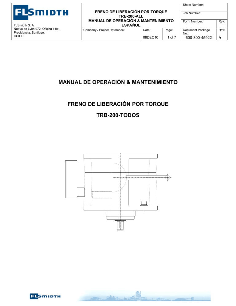 Sheet Number: FLSmidth S. A. a de Lyon 072. Oficina O 1101. Nueva Provid dencia. Santiago. CHILE E FRENO DE D LIBERAC CIÓN POR TO ORQUE TRB-20 0-ALL MANUAL DE E OPERACIÓ ÓN & MANTE ENIMIENTO ESPA ÑOL Com mpany / Project Reference: R Date: 08DEC10 Page: 1 of 7 MA ANUAL DE E OPERA ACIÓN & M MANTEN NIMIENTO O FRENO DE LIBER RACIÓN POR TOR RQUE TRB-2 200-TODO OS Job Numbe er: Form Numb ber: Rev: R Document P Package No.: Rev: R 600-800 0-45922 A Sheet Number: FLSmidth S. A. a de Lyon 072. Oficina O 1101. Nueva Provid dencia. Santiago. CHILE E D LIBERAC CIÓN POR TO ORQUE FRENO DE TRB-20 0-ALL MANUAL DE E OPERACIÓ ÓN & MANTE ENIMIENTO ESPA ÑOL Com mpany / Project Reference: R Date: 08DEC10 Page: 2 of 7 Job Numbe er: Form Numb ber: Rev: R Document P Package No.: Rev: R 600-800 0-45922 INDICE 1. MOD DELOS CUBIERT TOS POR ESTE MANUAL ........................... ........................................................................ 2 2. OPER RACIÓN .......................................................................... ........................................................................ 3 3. LIBER RACION MANU UAL .......................................................... ........................................................................ 4 4. RESO ORTE DEL TRB .................................................................. ........................................................................ 5 5. MAN NTENCIÓN ....................................................................... ........................................................................ 6 6. SOLU UCIÓN DE PROBLEMAS .................................................. ........................................................................ 7 1. MODELOS M CUBIIERTOS POR ESSTE MANUAL TRB-200-078-12 TRB-200-078-19 TRB-200-078-24 TRB-200-078-30 TRB-200-078-37 TRB-200-078-4 45 A Sheet Number: FLSmidth S. A. a de Lyon 072. Oficina O 1101. Nueva Provid dencia. Santiago. CHILE E FRENO DE D LIBERAC CIÓN POR TO ORQUE TRB-20 0-ALL MANUAL DE E OPERACIÓ ÓN & MANTE ENIMIENTO ESPA ÑOL Com mpany / Project Reference: R Date: 08DEC10 Page: 3 of 7 Job Numbe er: Form Numb ber: Rev: R Document P Package No.: Rev: R 600-800 0-45922 A INDICADOR 2. OPERACIÓN POS SICIÓN #2 POS SICIÓN #1 Estos freno os son dispossitivos de ajusste por resorte e con un brazzo de liberaciión manual. C Contienen una a parte cónicca de fricción giratoria, que e es accionado a través de el eje de entra ada del freno y el eje de accionamie ento de salida a del acoplam miento magnético.. Cuando se a aplica par al e eje de entrada a del freno, e el resorte de e este y el cono o de leva son forzados ha acia abajo, crreando así un na cámara de aire entre la a copa y el co ono. Esto perrmite la libre rotación de el eje de salida del freno. LA ADO DE ACOPLE MAGNETIC CO BAL LATA CON NO LADO DE D REDUCTO OR ADVERTENCIA: Respe ete las medida as de seguridad apropiadass en que la ap plicación o la falla del freno o permita que e la carga caiga y pueda p producir lesiones al personal. COP PA MANTENG GA AL PERSO ONAL FUERA A DEL AREA DE CARGA A. EJE DE SAL LIDA MANIJA EN N POSICIÓN #1 – FRENO O ACTIVADO O. MANIJA EN N POSICIÓN #2 – BRAKE E LIBERADO. NOTA: DURANTE LA OPERAC CIÓN NORMA AL DEL FRENO, LA A ACTIVACIÓ ÓN Y LIBERA ACIÓN SIN DESLIZAM MIENTO PUED DEN PROVO OCAR PEQUEÑO OS DESGAST TES EN LA BA ALATA DEL CONO. Sheet Number: FLSmidth S. A. a de Lyon 072. Oficina O 1101. Nueva Provid dencia. Santiago. CHILE E FRENO DE D LIBERAC CIÓN POR TO ORQUE TRB-20 0-ALL MANUAL DE E OPERACIÓ ÓN & MANTE ENIMIENTO ESPA ÑOL Com mpany / Project Reference: R Date: 08DEC10 3. Page: 4 of 7 Job Numbe er: Form Numb ber: Rev: R Document P Package No.: Rev: R 600-800 0-45922 RACION MANU UAL LIBER á equipado co on un liberado or manual. El freno está ATENCION N! NUNCA a plique energíía al enrollaca ables a meno os que la ma nija de liberación este en posición hacia arriba o pu uesto en liberración! NOTA: 1. Ante es de aplicar e energía, levan nte la manija de libera ación manual para garantiizar la bobina a pued de girar librem mente en amb bas direccione es. 2. El fu uncionamiento o normal de frreno requiere e man ija de aperturra manual de estar abajo. Para libera ar manualme ente el freno, levante la ma anija de lib beración man nual. ATENCIÓN: ene que ser ccargado utiliza ando el poder del Si el cable tie carrete de ca able, la manija a de apertura a manual debe estar en la po osición hacia a arriba o puesto en libertad. Una persona a debe estar u ubicada en e el carrete para a aplicar el fren no una vez fin nalizada la ca arga. Esto es necesario po orque el freno o requiere resistencia a la torsión adecu uada en el ca arrete para se er completamente liberado. Ressistencia a la torsión inade ecuada puede e eratura en lass pastillas de freno. Una vez causar tempe que el cable esté complettamente cargado esto ya n no es una preocup pación. NOTA: Si el freno no se mantiene en n la posición n liberada durrante la insta alación del c cable, la balatta de fricción se p puede dañarr lo que resullta en proble emas de freno en operación. A Sheet Number: FLSmidth S. A. a de Lyon 072. Oficina O 1101. Nueva Provid dencia. Santiago. CHILE E 4. RESORTE R DEL TRB T FRENO DE D LIBERAC CIÓN POR TO ORQUE TRB-20 0-ALL MANUAL DE E OPERACIÓ ÓN & MANTE ENIMIENTO ESPA ÑOL Com mpany / Project Reference: R Date: 08DEC10 Page: 5 of 7 Job Numbe er: Form Numb ber: Rev: R Document P Package No.: Rev: R 600-800 0-45922 A Sheet Number: FLSmidth S. A. a de Lyon 072. Oficina O 1101. Nueva Provid dencia. Santiago. CHILE E 5. FRENO DE D LIBERAC CIÓN POR TO ORQUE TRB-20 0-ALL MANUAL DE E OPERACIÓ ÓN & MANTE ENIMIENTO ESPA ÑOL Com mpany / Project Reference: R Date: Page: 08DEC10 6 of 7 Job Numbe er: Form Numb ber: Rev: R Document P Package No.: Rev: R 600-800 0-45922 MANTENCIÓN M PCIÓN DESCRIP Comproba ar funcionamiento del freno (refiérase a procedimien