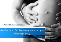 Part I FCA preparation Anatomical & physiological changes in pregnancy Body composition • ↑ metabolic rate • ± 12 kg weight gain (T1 1-2kg; T2&T3 5-6kg each) - uterus, 1 kg; - amniotic fluid, 1 kg; - fetus and placenta, 4 kg; - blood volume & interstitial fluid (approximately 2 kg each); - new fat & protein (approximately 4 kg) • DEPRESSING FACT: The OR for CS are 1.46, 2.05, and 2.89 for overweight, obese, and severely obese women, respectively, compared with pregnant women of normal weight. Endocrine function • Principal hormone is progesterone - initially, placental production of β-hCG sustains the corpus luteum, enabling it to produce progesterone - from 6-8 weeks, the placenta takes over progesterone production • Human placental lactogen is produced by the placenta - similar effects to growth hormone; may be the cause of maternal insulin resistance - may be cause of acromegalic-like changes in pregnancy • Thyroid gland hypertrophy Endocrine functionthyroid • ↑ T3 and T4 • ↑ TBG production free hormone levels unaltered • ↓ PTH levels • ↓ serum calcium level • constant ionized Ca levels due to changes in serum albumin Endocrine function- pancreas • Hypertrophy and hyperplasia of the B cells • Fasting associated with accelerated starvation – maternal hypoglycemia, hypoinsulinemia and hyperketonemia – due to diffusion of glucose by the fetoplacental unit • Feeding response – hyperglycemia, hyperinsulinemia, hypertriglyceridemia and reduced tissue sensitivity to insulin – glucose response greater during pregnancy – peripheral resistance to insulin: diabetogenic effect of pregnancy. • hPL and cortisol mediated • greater insulin resistance as the pregnancy advances • Fetus primarily depends on glucose – Facilitated diffusion (carrier-mediated but not energy dependent process) Respiratory system • Major changes- hormonal & mechanical factors • Difficult intubation much more common at term- bigger breasts, airway mucosal oedema, need for smaller ETT, nasal congestion with epistaxis risk • Hyperventilation due to increased VT (40%) and lesser increase in respiratory rate (15%) slight drop in PaCO2 mild, partially-compensated respiratory alkalosis • Heightened oxygen consumption (up to 60% during labour) • FRC decrease by 20% (and even more when supine!) - After midgestation, the supine position frequently results in a PaO2 less than 13.2 kPa. Why? The FRC may be less than closing capacity, resulting in closure of small airways during normal tidal volume ventilation. Respiratory system: Mechanics • Configuration of thoracic cage changes early on - increase in subcostal angle, transverse diameter and circumference of chest • With advancing gestation, the level of diaphragm is pushed up by 4 cm So…. Inspiration at term is almost totally attributable to diaphragmatic excursion. Why? Because of a greater descent of the diaphragm from its elevated resting position and limitation of thoracic cage expansion because of its expanded resting position. Effects of pregnancy on respiratory mechanics • • Both large- and small-airway function are minimally altered during pregnancy. The shape of flow-volume loops, the absolute flow rates at normal lung volumes, FEV1, and the FEV1/FVC ratio are unchanged during pregnancy, as is closing capacity. Lung volumes and capacities • • • FRC falls from the fifth month and is decreased to 80% of the prepregnancy capacity by term. Diaphragm elevation 25% ↓ in ERV and a 15% reduction in RV, accounts for the change. Assumption of the supine position causes FRC to decrease further to 70% of the prepregnancy volume. The ABG in pregnancy Non-pregnant T1 T2 T3 pH 7.40 7.44 7.44 7.44 pCO2 (kPa) 5.26 3.95 3.95 3.95 pO2 (kPa) 13.16 14.08 13.82 13.55 HCO3 (mEq/L) 24 21 20 20 Ventilation & blood gases • ↑ minute ventilation – due to progesterone & 30% ↑ CO2 production • CO2 response: progesterone ↑CO2 chemosensitivity steeper slope & leftward shift of the CO2 ventilatory response curve; early change - PaCO2 ↓ to 4 kPa by 12/40; thereafter ≈ • Hypoxic ventilatory response: ↑ two-fold by oestrogen and progesterone , despite blood and cerebrospinal fluid (CSF) alkalosis. • PaO2 ↑ to 13.2 – 13.8 kPa as a result of greater alveolar ventilation. • As pregnancy progresses, oxygen consumption continues to increase, and cardiac output increases to a lesser extent reduced mixed venous oxygen content and increased arteriovenous oxygen difference. Blood volume changes • • Plasma volume expands by about 50% from 6/40 to 34/40; thereafter stable. Increased volume of distribution results in a prolonged elimination half life for many drugs • Red blood cell volume falls in the first 8 weeks, returns to the prepregnancy level by 16 weeks, and then rises to 30% above the prepregnancy volume at term. • The plasma volume expansion increase exceeds that of the red blood cell volume increase, resulting in the physiologic anaemia of pregnancy. • Why? Facilitated delivery of nutrients to the fetus, maternal protection from hypotension, reduced risks associated with haemorrhage at delivery. Decreased blood viscosity lower resistance to blood flow, which helps maintain the patency of the uteroplacental vascular bed; also reduced cardiac work. • Plasma volume expansion mediated by: oestrogen, progesterone, fetal dehydroepiandrosterone, adrenomedullin Cardiac structural changes • Eccentric LVH (like in exercise!) seen from 12/40; LV mass increases by 23% from T1 to T3. • Increase in size of pre-existing cardiomyocytes rather than in the number of cells. • Cardiac dilatation causes significantly-increased annular diameters of the mitral, tricuspid, and pulmonic valves; 94% of term pregnant women exhibit TR and PR, and 27% exhibit MR. The aortic annulus is not dilated Cardiac output • • • Measurable ↑ by 5/40 due to ↑ HR; 35-40% ↑ by the end of T1 ↑ through T2 to ± 50