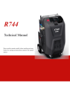 R744 Technical Manual Please read this manual carefully before installing and using. Follow the warnings and precautions marked in the product manual. CONTENT 1.Instruction .............................................................................................................1 1.) Safety Precautions ..........................................................................................1 2.) Safety Signs on the Machine ...........................................................................2 2. Product introduction ............................................................................................2 1.)Features ...........................................................................................................2 4. Nitrogen leak check; ..........................................................................................3 2. )Technical Specifications .................................................................................3 3. Product Description and Appearance ..................................................................4 3.1 Front View.....................................................................................................4 3.2 Rear View ......................................................................................................5 3.3 Right Side View.............................................................................................5 4. Initial Setup ..........................................................................................................7 Change work tank ................................................................................................7 7)Work tank change completed............................................................................7 5. Basic Operations ...................................................................................................7 5.1 Select the oil type ..........................................................................................7 5.2 Automatic Mode ............................................................................................8 5.3 Manual operation ...........................................................................................9 6. Maintenance .......................................................................................................12 6.1 Change vacuum pump oil............................................................................. 12 6.2 Load cell calibration .................................................................................... 13 6.3 Leak check................................................................................................... 14 7. Setting ................................................................................................................. 14 8. Troubleshooting .................................................................................................. 16 Do not use an extension cord. Do not use the machine 1.Instruction in the vicinity of flames and hot surfaces. Refrigerant can decompose at high temperatures and free toxic 1.) Safety Precautions substances to the environment that can be noxious to i.)ALLOW ONLY QUALIFIED PERSONNEL TO the user. Do not use the machine in environments OPERATE THE MACHINE. Before operation, containing explosive gases or vapors. Do not use this read and follow the instructions and warnings in this machine in ATEX classified zones or areas. Protect the manual. The operator must have knowledge about air machine from conditions that can cause electrical conditioning and refrigeration systems, refrigerants, failure or other hazards relating to ambient interaction. and the dangers of pressurized components. If the v.)DO NOT PRESSURE TEST OR LEAK TEST operator EQUIPMENT cannot read this manual, operating AND/OR VEHICLE AIR instructions and safety precautions must be read and CONDITIONING discussed in the operator’s native language. COMPRESSED AIR. Mixtures of air and R1234yf ii.)USE THE MACHINE AS OUTLINED IN THIS refrigerant can be combustible at elevated pressures. MANUAL. Using the machine in a manner for which These mixtures are potentially dangerous and can it was not designed will compromise the machine and result in fire or explosion causing personal injury nullify the protections provided. and/or property damage. iii.)AVOID BREATHING IN A/C REFRIGERANT vi.)NEVER START THE MACHINE IF IT WILL OR LUBRICANT VAPOR OR MIST. Exposure can NOT BE USED IMMEDIATELY. Disconnect the irritate eyes, nose, and throat. To remove refrigerant electrical supply before a long period of inactivity or from the A/C system, use only equipment certified for before internal maintenance is performed. the type of refrigerant being removed. Use the unit in DO NOT MODIFY THE PRESSURE RELIEF locations with mechanical ventilation that provides at VALVE OR CHANGE THE CONTROL SYSTEM least four times ventilation per hour. If accidental SETTINGS. Using the machine in a manner for which system discharge occurs, ventilate the work area before it was not designed will compromise the machine and resuming service. nullify the protections provided. iv.)TO REDUCE THE RISK OF FIRE, do not use vii.)HOSES the machine in the vicinity of spilled or open REFRIGERANT UNDER PRESSURE. Contact containers of gasoline or other flammable substances. with refrigerant can cause personal injury, including R744 1 CAN SYSTEMS CONTAIN WITH LIQUID blindness and frozen skin. Wear protective equipment, REFRIGERANT. Do not overfill the internal storage including goggles and gloves. Disconnect hoses using vessel (ISV). Overfilling can cause explosion resulting extreme caution. Ensure the phase is complete before in personal injury or death. Do not recover refrigerants disconnecting the machine to prevent the release of into nonrefillable containers; use only type-approved refrigeration to the atmosphere. refillable containers that have pressure relief valves. viii.)PRESSURIZED TAN