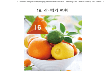 ▷ Brown/Lemay/Bursten/Murphy/Woodward/Stoltzfus; Chemistry: The Central Science; 14th Edition ◁ 16. 산-염기 평형 1 ▷ Brown/Lemay/Bursten/Murphy/Woodward/Stoltzfus; Chemistry: The Central Science; 14th Edition ◁ 목차 16.1 Arrhenius 산과 염기 이전에 배운 Arrhenius 산-염기 정의에 대해 떠올려 보자. 산 16.6 약산 물에서 약산의 해리는 평형 상수 𝐾𝑎 로 표현되는 평 형 과정이고, 𝐾𝑎 로부터 약산 용액의 pH를 계산할 수 있다. 은 물에서 수소 이온 농도를 증가시키는 화합물이고, 염기는 물에서 수산화 이온 농도를 증가시키는 화합물이다. 16.2 Brønsted-Lowry 산과 염기 Brønsted-Lowry 산은 양성자 주개이고, Brønsted-Lowry 염기 는 양성자 받개이다. 양성자의 포함 여부만 다른 두 화학종을 짝산-짝염기 쌍(conjugate acid-base pair)이라고 한다. 16.3 물의 자체 이온화 물은 자체 이온화로 소량의 H3 𝐎+와 𝐎𝐇− 이온을 생성한다. 물의 자체 이온화에 대한 평형상수 𝑲𝒘 = 𝐇𝟑 𝐎+ 𝐎𝐇− 이고, 이 식은 수용액에서 𝐇𝟑 𝐎+와 𝐎𝐇−의 농도에 대한 상관관계를 정의한다. 16.7 약염기 물에서 약염기의 해리는 평형 상수 𝐾𝑏 로 표현되는 평형 과정이고, 𝐾𝑏 로부터 약염기 용액의 pH를 계산할 수 있다. 16.8 𝐾𝑎 와 𝐾𝑏 의 관계 𝐾𝑎 × 𝐾𝑏 = 𝐾𝑤 인 상관관계로부터 강한 산일수록 그 짝 염기는 약하다는 것을 알 수 있다. 16.9 염 용액의 산-염기 성질 가용성 이온 결합 화합물의 이온은 Brønsted-Lowry 산 이나 염기가 될 수 있다. 16.4 pH 값 pH 값은 수용액의 산도나 염기도를 나타낸다. 중성 용액의 pH는 7, 산성 용액의 pH는 7보다 작고, 염기성 용액의 pH는 7 보다 크다. 16.5 강산과 강염기 산과 염기를 강전해질과 약전해질로 구분할 수 있다. 강산과 강염기는 강전해질이다. 따라서 수용액에서 모두 이온화하거나 16.10 산-염기 거동과 화학 구조 화학 구조와 산-염기 거동 사이의 상관관계를 살펴본다. 16.11 Lewis 산과 염기 가장 일반적인 산-염기 정의인 Lewis 산-염기 정의를 살 펴본다. Lewis 산은 전자쌍 받개이고, Lewis 염기는 전자 쌍 주개이다. 해리된다. 약산과 약염기는 약전해질이다. 따라서 수용액에서 일부분만 이온화된다. 2 ▷ Brown/Lemay/Bursten/Murphy/Woodward/Stoltzfus; Chemistry: The Central Science; 14th Edition ◁ 16.1 Arrhenius 산과 염기 1880년대에 스웨덴의 화학자 Svante Arrhenius(1859~1927)가 제안. Arrhenius의 산-염기 개념 : ① 산(acid) : 물에 녹아서 H+ 이온의 농도를 증가시키는 물질 - 염산은 Arrhenius 산: H2O HCl(g) H+(aq) + Cl-(aq) 산(acid) ② 염기(Base) : 염기(base) : 물에 녹아서 OH- 이온의 농도를 증가시키는 물질 - 수산화 소듐은 Arrhenius 염기: H2O NaOH(s) Na+(aq) + OH-(aq) 염기(base) 3 ▷ Brown/Lemay/Bursten/Murphy/Woodward/Stoltzfus; Chemistry: The Central Science; 14th Edition ◁ 16.2 Brønsted-Lowry 산과 염기 1923년 덴마크의 화학자인 Johannes Brønsted(1879~1947)와 영국의 화학자인 Thomas Lowry(1874~1936)가 제안. 산-염기 반응에서 H+이온이 한 물질에서 다른 물질로 이동한다는 사실에 근거함 Brønsted-Lowry의 산-염기 개념 : ① 산(acid) : H+(proton)을 주는 물질(H+ donor) ② 염기(Base) : H+(proton)을 받는 물질(H+ acceptor) 4 ▷ Brown/Lemay/Bursten/Murphy/Woodward/Stoltzfus; Chemistry: The Central Science; 14th Edition ◁ 양성자 전달 반응 양성자 이동 반응 : H+(proton 또는 H3O+)를 주고 받는 개념 H+ donating (산) H+ acceptor (염기) Brønsted-Lowry의 산-염기 정의 ① 산(acid)은 다른 물질에 양성자를 제공하는 물질(분자나 이온)이다. ② 염기(Base)는 양성자를 제공받는 물질이다. 5 ▷ Brown/Lemay/Bursten/Murphy/Woodward/Stoltzfus; Chemistry: The Central Science; 14th Edition ◁ 양성자 전달 반응 산(주개)과 염기(받개)는 항상 함께 작용하여 양성자를 이동시킨다. 6 ▷ Brown/Lemay/Bursten/Murphy/Woodward/Stoltzfus; Chemistry: The Central Science; 14th Edition ◁ 짝산-짝염기 쌍 모든 산-염기 평형에서 정반응과 역반응에 모두 양성자 이동이 관여된다. 짝염기(conjugate base) 산(acid) 염기(base) 짝산(conjugate acid) 예를 들어 아질산(HNO2 )과 물의 반응 및 NH3와 H2O의 반응식을 살펴보자. 7 ▷ Brown/Lemay/Bursten/Murphy/Woodward/Stoltzfus; Chemistry: The Central Science; 14th Edition ◁ 산과 염기의 상대적인 세기 산이 강할수록 그 짝염기는 약해지고, 염기가 강할수록 그 짝산은 약해진다. 산과 염기를 넓게 세 부류로 나타내면, 1. 강산의 짝염기는 무시할 정도의 염기도 2. 약산의 짝염기는 약염기 3. 무시할 정도의 산도를 갖는 물질의 짝염기는 강염기 모든 산-염기 반응에서, 양성자가 강산에서 강염기로 전달되어 약산과 약염기를 형성하는 방향으로 평형이 진행된다. 8 ▷ Brown/Lemay/Bursten/Murphy/Woodward/Stoltzfus; Chemistry: The Central Science; 14th Edition ◁ 16.3 물의 자체이온화 물은 양쪽성 양성자 물질(amphoteric substance)이기 때문에, 산이 있는 경우, 물은 양성자 받개 역할을 하고, 염기가 있는 경우, 물은 양성자 주개 역할을 한다. 이 과정을 물의 자체이온화(autoionization 또는 자동이온화) 라고 한다 9 ▷ Brown/Lemay/Bursten/Murphy/Woodward/Stoltzfus; Chemistry: The Central Science; 14th Edition ◁ 물의 이온곱 물의 자체이온화에 대한 평형 상수식 : 순수한 고체와 액체의 농도는 일정하기 때문에, [H2O] 항은 평형 상수식(K)에서 제외. 물의 자체이온화에 대한 것이므로, Kc 평형 상수를 Kw로 