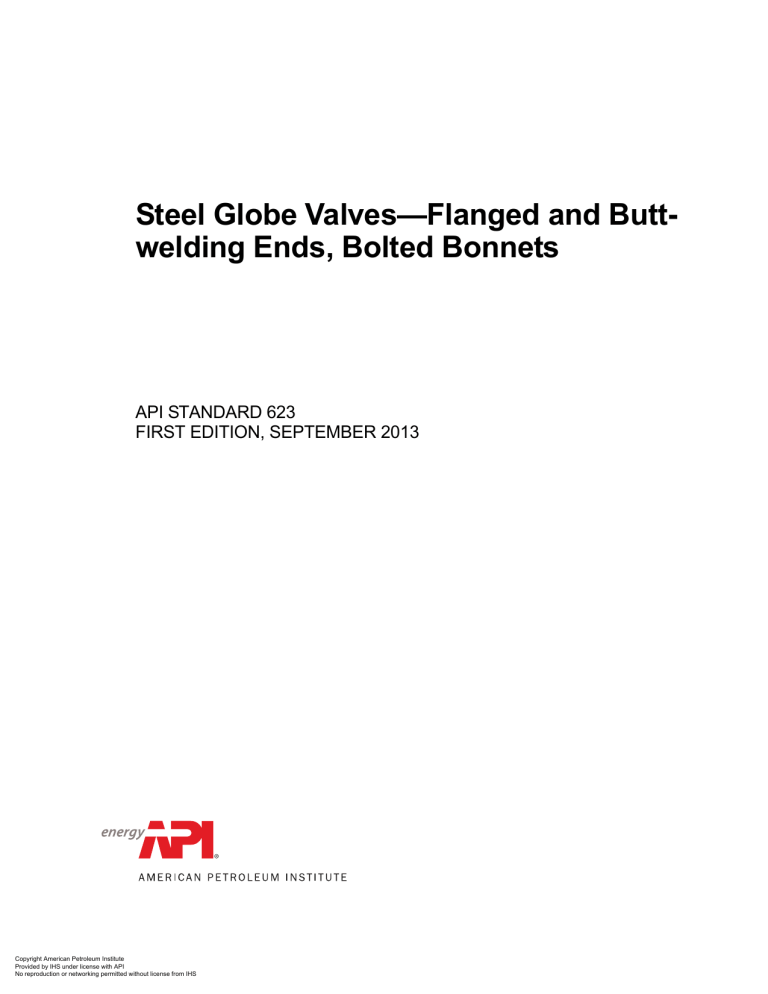 Steel Globe Valves—Flanged and Buttwelding Ends, Bolted Bonnets API STANDARD 623 FIRST EDITION, SEPTEMBER 2013 Copyright American Petroleum Institute Provided by IHS under license with API No reproduction or networking permitted without license from IHS Special Notes API publications necessarily address problems of a general nature. With respect to particular circumstances, local, state, and federal laws and regulations should be reviewed. Neither API nor any of API’s employees, subcontractors, consultants, committees, or other assignees make any warranty or representation, either express or implied, with respect to the accuracy, completeness, or usefulness of the information contained herein, or assume any liability or responsibility for any use, or the results of such use, of any information or process disclosed in this publication. Neither API nor any of API's employees, subcontractors, consultants, or other assignees represent that use of this publication would not infringe upon privately owned rights. API publications may be used by anyone desiring to do so. Every effort has been made by the Institute to assure the accuracy and reliability of the data contained in them; however, the Institute makes no representation, warranty, or guarantee in connection with this publication and hereby expressly disclaims any liability or responsibility for loss or damage resulting from its use or for the violation of any authorities having jurisdiction with which this publication may conflict. API publications are published to facilitate the broad availability of proven, sound engineering and operating practices. These publications are not intended to obviate the need for applying sound engineering judgment regarding when and where these publications should be utilized. The formulation and publication of API publications is not intended in any way to inhibit anyone from using any other practices. Any manufacturer marking equipment or materials in conformance with the marking requirements of an API standard is solely responsible for complying with all the applicable requirements of that standard. API does not represent, warrant, or guarantee that such products do in fact conform to the applicable API standard. Users of this Standard should not rely exclusively on the information contained in this document. Sound business, scientific, engineering, and safety judgment should be used in employing the information contained herein. All rights reserved. No part of this work may be reproduced, translated, stored in a retrieval system, or transmitted by any means, electronic, mechanical, photocopying, recording, or otherwise, without prior written permission from the publisher. Contact the Publisher, API Publishing Services, 1220 L Street, NW, Washington, DC 20005. Copyright © 2013 American Petroleum Institute Copyright American Petroleum Institute Provided by IHS under license with API No reproduction or networking permitted without license from IHS Foreword Nothing contained in any API publication is to be construed as granting any right, by implication or otherwise, for the manufacture, sale, or use of any method, apparatus, or product covered by letters patent. Neither should anything contained in the publication be construed as insuring anyone against liability for infringement of letters patent. Shall: As used in a standard, “shall” denotes a minimum requirement in order to conform to the specification. Should: As used in a standard, “should” denotes a recommendation or that which is advised but not required in order to conform to the specification. This document was produced under API standardization procedures that ensure appropriate notification and participation in the developmental process and is designated as an API standard. Questions concerning the interpretation of the content of this publication or comments and questions concerning the procedures under which this publication was developed should be directed in writing to the Director of Standards, American Petroleum Institute, 1220 L Street, NW, Washington, DC 20005. Requests for permission to reproduce or translate all or any part of the material published herein should also be addressed to the director. Generally, API standards are reviewed and revised, reaffirmed, or withdrawn at least every five years. A one-time extension of up to two years may be added to this review cycle. Status of the publication can be ascertained from the API Standards Department, telephone (202) 682-8000. A catalog of API publications and materials is published annually by API, 1220 L Street, NW, Washington, DC 20005. Suggested revisions are invited and should be submitted to the Standards Department, API, 1220 L Street, NW, Washington, DC 20005, standards@api.org. iii Copyright American Petroleum Institute Provided by IHS under license with API No reproduction or networking permitted without license from IHS Copyright American Petroleum Institute Provided by IHS under license with API No reproduction or networking permitted without license from IHS Contents Page 1 Scope . . . . . . . . . . . . . . . . . . . . . . . . . . . . . . . . . . . . . . . . . . . . . . . . . . . . . . . . . . . . . . . . . . . . . . . . . . . . . . . . . . 1 2 Normative References. . . . . . . . . . . . . . . . . . . . . . . . . . . . . . . . . . . . . . . . . . . . . . . . . . . . . . . . . . . . . . . . . . . . . 1 3 Terms and Definitions . . . . . . . . . . . . . . . . . . . . . . . . . . . . . . . . . . . . . . . . . . . . . . . . . . . . . . . . . . . . . . . . . . . . . 3 4 Pressure/Temperature Ratings . . . . . . . . . . . . . . . . . . . . . . . . . . . . . . . . . . . . . . . . . . . . . . . . . . . . . . . . . . . . . 3 5 Design . . . . . . . . . . . . . . . . . . . . . . . . . . . . . . . . . . . . . . . . . . . . . . . . . . . . . . . . . . . . . . . . . . . . . . . . . . . . . . . . . . 3 5.1 Body Wall Thickness. . . . . . . . . . . . . . . . . . . . . . . . . .