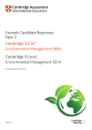 Example Candidate Responses Paper 2 Cambridge IGCSE™ Environmental Management 0680 Cambridge O Level Environmental Management 5014 For examination from 2019 Version 1 In order to help us develop the highest quality resources, we are undertaking a continuous programme of review; not only to measure the success of our resources but also to highlight areas for improvement and to identify new development needs. We invite you to complete our survey by visiting the website below. Your comments on the quality and relevance of our resources are very important to us. www.surveymonkey.co.uk/r/GL6ZNJB Would you like to become a Cambridge International consultant and help us develop support materials? Please follow the link below to register your interest. www.cambridgeinternational.org/cambridge-for/teachers/teacherconsultants/ Copyright © UCLES 2019 Cambridge Assessment International Education is part of the Cambridge Assessment Group. Cambridge Assessment is the brand name of the University of Cambridge Local Examinations Syndicate (UCLES), which itself is a department of the University of Cambridge. UCLES retains the copyright on all its publications. Registered Centres are permitted to copy material from this booklet for their own internal use. However, we cannot give permission to Centres to photocopy any material that is acknowledged to a third party, even for internal use within a Centre. Contents Introduction........................................................................................................................................................................4 Question 1.........................................................................................................................................................................6 Example Candidate Response – high............................................................................................................................6 Example Candidate Response – middle......................................................................................................................18 Example Candidate Response – low...........................................................................................................................30 Question 2.......................................................................................................................................................................42 Example Candidate Response – high..........................................................................................................................42 Example Candidate Response – middle......................................................................................................................46 Example Candidate Response – low...........................................................................................................................50 Question 3.......................................................................................................................................................................55 Example Candidate Response – high..........................................................................................................................55 Example Candidate Response – middle......................................................................................................................58 Example Candidate Response – low...........................................................................................................................61 Example Candidate Responses – Paper 2 Introduction The main aim of this booklet is to exemplify standards for those teaching Cambridge IGCSE Environmental Management 0680 and Cambridge O Level Environmental Management 5014, and to show how different levels of candidates’ performance (high, middle and low) relate to the subject’s curriculum and assessment objectives. In this booklet candidate responses have been chosen from June 2019 scripts to exemplify a range of answers. For each question, the response is annotated with a clear explanation of where and why marks were awarded or omitted. This is followed by examiner comments on how the answer could have been improved. In this way, it is possible for you to understand what candidates have done to gain their marks and what they could do to improve their answers. There is also a list of common mistakes candidates made in their answers for each question. This document provides illustrative examples of candidate work with examiner commentary. These help teachers to assess the standard required to achieve marks beyond the guidance of the mark scheme. Therefore, in some circumstances, such as where exact answers are required, there will not be much comment. The questions and mark schemes and pre-release material used here are available to download from the School Support Hub. These files are: June 2019 Question Paper 22 June 2019 Paper 22 Mark Scheme Past exam resources and other teacher support materials are available on the School Support Hub: www.cambridgeinternational.org/support Cambridge IGCSE Environmental Management 0680 and O Level Environmental Management 5014 4 Example Candidate Responses – Paper 2 How to use this booklet This booklet goes through the paper one question at a time, showing you the high-, middle- and low-level response for each question. The candidate answers are set in a table. In the left-hand column are the candidate answers, and in the right-hand column are the examiner comments. Example Candidate Response – Question 1, high Examiner comments 1 The reference to permanent ice achieves one mark. No roads connecting the coast to the inland (centre of island) achieves one 1mark. The reference tononpermanent The idea that the coastal areas doone not have fishing ice achieves mark. No roads ports achieves one mark. Three connecting the coast to the inland Examiner marks comments are awarded. are 1 1 (c