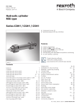 RE 17332 Edition: 2021-07 Replaces: 2017-07 Hydraulic cylinder Mill type Series CDH1 / CGH1 / CSH1 ▶ Component series 3X ▶ Nominal pressure 250 bar (25 MPa) Features ▶ 6 types of mounting ▶ Piston Ø (ØAL): 40 to 320 mm ▶ Piston rod Ø (ØMM): 22 to 220 mm ▶ Stroke lengths up to 6 m ▶ Self-adjusting and adjustable end position cushioning ▶ IO-Link interface, optional H4646_d Contents Features1 Contents1 Ordering code series CDH1 2…4 Ordering code series CGH1 5…7 Ordering code series CSH1 8 … 10 Technical data 11 … 15 Overview types of mounting: Series CDH1 / CSH1 16 Overview types of mounting: Series CSH1 17 Swivel eye at base CDH1: MP3 18, 19 Self-aligning clevis at base CDH1: MP5 20, 21 Round flange at head CDH1/CGH1: MF3 22, 23 Round flange at base CDH1: MF4 24, 25 Trunnion mounting CDH1/CGH1: MT4 26, 27 Foot mounting CDH1/CGH1: MS2 28, 29 Swivel eye at base CSH1: MP3 30, 31 Self-aligning clevis at base CSH1: MP5 32, 33 Round flange at head CSH1: MF3 34, 35 Round flange at base CSH1: MF4 36, 37 Trunnion mounting CSH1: MT4 38, 39 Foot mounting CSH1: MS2 40, 41 Project planning software Interactive Catalog System www.boschrexroth.com/mill-type-cylinder Flange ports 42, 43 Subplates for valve mounting 44 … 47 Bleeding / measuring coupling 48 Throttle valve 48 Proximity switch 49 … 51 Position measurement system 52, 53 Profibus 54, 55 IO-Link, Profinet 56 … 58 Plain clevis CSA 59 Plain clevis CGA 60 Swivel head CGAK 61, 62 Swivel head CGAS (clampable) 63, 64 Buckling65 Admissible stroke length 66 … 67 End position cushioning 68 … 70 Selection criteria for seals 71 Seal kits 72 … 76 Tightening torques 77 Components 78 … 81 Cylinder weight 82 Corrosivity categories 83 RE 17332, edition: 2021-07, Bosch Rexroth AG 2/84 Series CDH1 /CGH1 / CSH1 | Hydraulic cylinder mill type Ordering code series CDH1 01 02 CD H1 03 04 / 05 06 / / 07 08 A 3X 09 10 11 12 13 14 15 16 / 01 Differential cylinder CD 02 Series H1 Types of mounting 03 Swivel eye at base MP3 1) Self-aligning clevis at base MP5 Round flange at head MF3 Round flange at base MF4 Trunnion mounting MT4 2) Foot mounting MS2 04 Piston Ø (ØAL) 40 … 320 mm 05 Piston rod Ø (ØMM) 22 … 220 mm 06 Stroke length in mm 3) 07 Design principle: Head and base flanged A 08 Component series 30 … 39 (30 … 39: unchanged installation and connection dimensions) 3X Line connection / version 09 According to ISO 1179-1 (pipe thread ISO 228-1) B According to ISO 9974-1 (metric thread ISO 261) M Flange hole pattern according to ISO 6162-2 tab. 2 type 1 (≙SAE 6000 PSI) D 4; 9) Flange hole pattern according to ISO 6164 tab. 2 H 4) According to ISO 1179-1 (pipe thread ISO 228-1) with flat pipe flange C 31) With mounted control block Y 38) for directional and control valves Subplate NG6 P 4; 5) Subplate NG10 T 4; 6) Subplate NG16 U 4; 7) Subplate NG25 V 4; 8) for SL and SV valves Subplate NG6 A 4; 5; 15) Subplate NG10 E 4; 6; 15) Subplate NG20 L 4; 7; 15) Subplate NG30 N 4; 8; 15) Line connection / position at head 10 View to piston rod 30) 1 2 3 4 Line connection/position at base 11 View to piston rod 30) Bosch Rexroth AG, RE 17332, edition: 2021-07 1 2 34) 3 4 34) Hydraulic cylinder mill type | Series CDH1 / CGH1 / CSH1 3/84 Ordering code series CDH1 01 02 CD H1 03 04 / 05 / 06 / 07 08 A 3X 09 10 11 12 13 14 15 16 / Piston rod design 12 Hard chromium-plated C Hardened and hard chromium-plated 12) H Nickel-plated and hard chromium-plated 19) N Piston rod end 13 Thread for swivel head CGAS Thread for swivel head CGA, CGAK, plain clevis CSA A G 13) With mounted swivel head CGAS S With mounted swivel head CGA L 13) With mounted swivel head CGAK M 13) With mounted plain clevis CSA N 1) End position cushioning 14 Without U Both sides, self-adjusting D 1) Both sides, adjustable E Base sides, self-adjusting K 1; 38) Head sides, self-adjusting S 1; 38) Seal design - observe selection criteria for seals, see page 71 15 For mineral oil HL, HLP and HFA Standard seal system M Standard seal system with guide rings L Reduced friction, heavy industry R For mineral oil HL, HLP, HFA and water glycol HFC Standard seal system HFC G 40) Servo quality / reduced friction T Chevron seal kits A For HDFR phosphate ester and HFDU polyol ester Servo quality / reduced friction S Standard seal system FKM V 40) Chevron seal kits B 39) Option 16 Without additional options, do not fill fields for additional options W Additional options, fill fields for additional options Z RE 17332, edition: 2021-07, Bosch Rexroth AG 4/84 Series CDH1 /CGH1 / CSH1 | Hydraulic cylinder mill type Ordering code series CDH1 (fields for additional options) 01 02 03 04 05 06 07 08 Z 01 02 Without inductive proximity switches W Inductive proximity switches without mating connector - separate order, see page 49 E 37) Without additional guide rings W Additional guide rings 03 F 10), 28) Without measuring coupling W Measuring coupling, on both sides A Measuring coupling, on both sides, stainless steel version 04 E 38) Standard grease nipples, DIN 71412 form A W Spherical bearing, maintenance-free 05 06 07 08 A 14), 35) Flat type grease nipples, DIN 3404 form A B Without piston rod extension W Specify the piston rod extension LY in the plain text in mm Y Priming class CP3 W Painting class CP4 B 21) Painting class CP5 L 21) Painting class CP6 U 21) Painting class CP7 E 21) Without oil filling W With corrosion protection oil VG 68 F Without test certificate W With certificate of compliance 2.1 based on EN 10204 B With acceptance test certificate 3.1 based on EN 10204 C Order examples: Without additional options: CDH1MP5/100/56/300A3X/B11CADMW With additional options: CDH1MP5/100/56/300A3X/B11CADMZEWABWWWW 1) Only piston Ø 40 to 200 mm 12) Only piston rod Ø 22 to 140 mm 2) Trunnion position freely selectable. When ordering, always specify the "XV" dimensions in the plain text in mm 13) Not with piston Ø 320 mm 3) Observe the max. available stroke length page 14 and admissible