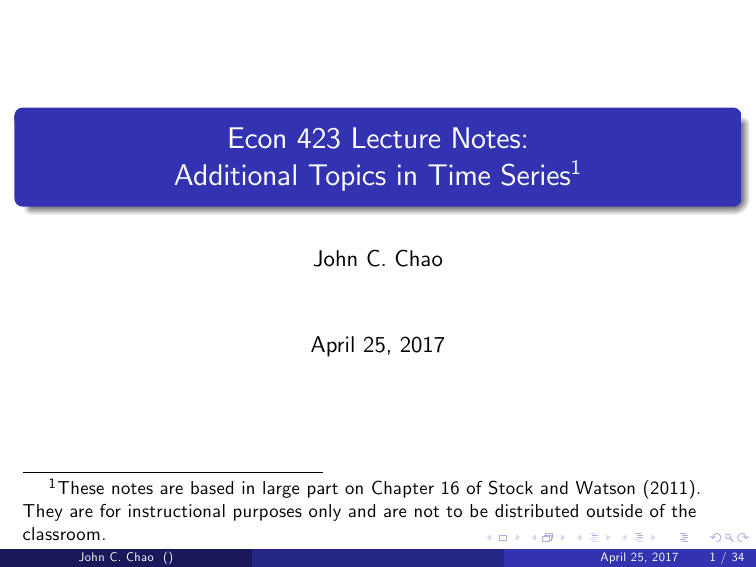 Econ 423 Lecture Notes: Additional Topics in Time Series1 John C. Chao April 25, 2017 1 These notes are based in large part on Chapter 16 of Stock and Watson (2011). They are for instructional purposes only and are not to be distributed outside of the classroom. John C. Chao () April 25, 2017 1 / 34 Vector Autoregression (VAR) Motivation: One may be interested in forecasting two or more variables; such as rate of in‡ation, rate of unemployment, growth rate of GDP, and interest rates. In this case, it is bene…cial to develop a single model that allows you to forecast all these variables in a systemic approach. De…nition: A VAR (p ), i.e., a vector autoregression of order p, a set of m time series regressions, in which the regressors are the p lagged values of the m time series variables. Example: m = 2 case Y1t Y2t John C. Chao () = β10 + β11 Y1t 1 + + β1p Y1t p +γ11 Y2t 1 + + γ1p Y2t p + u1t , = β20 + β21 Y1t 1 + + β2p Y1t p +γ21 Y2t 1 + + γ2p Y2t p + u2t . April 25, 2017 2 / 34 Estimation and Inference Algebraically, the VAR model is simply a system of m linear regressions; or, to put it another way, it is a multivariate linear regression model. The coe¢ cients of the VAR can be estimated by estimating each equation by OLS. Under appropriate conditions, the OLS estimators are consistent and have a joint normal distribution in large samples in the stationary case. In consequence, in the stationary case, inference can proceed in the usual way; for example, 95% con…dence interval on coe¢ cients can be constructed based on the usual rule: estimated coe¢ cients John C. Chao () 1.96 standard errors. April 25, 2017 3 / 34 Estimation and Inference (con’t) An Advantage of the VAR: By modeling the dynamics of m variables as a system, one can test joint hypotheses that involve restrictions across multiple equations. Example: In a two-varlable VAR (1), one might be interested in testing the null hypothesis H0 : β11 β21 = 0 on the unrestricted model Y1t Y2t = β10 + β11 Y1t 1 + γ11 Y2t 1 + u1t , = β20 + β21 Y1t 1 + γ21 Y2t 1 + u2t . Since the estimated coe¢ cients have a jointly normal large sample distribution, the restrictions on these coe¢ cients can be tested by computing the t- or the F-statistic. Importantly, many hypotheses of interest to economists can be formulated as cross-equation restrictions. John C. Chao () April 25, 2017 4 / 34 Modeling Issues How many variables should be included in a VAR? (i) Having more variables leads to having more coe¢ cients to estimate which, in turn, increases estimation error and can result in a deterioration of forecast accuracy. (ii) Concrete example: A VAR with 5 variables and 4 lags will have 21 coe¢ cients to estimate in each equation, leading to a total of 105 coe¢ cients that must be estimated. (iii) A preferred strategy is to keep m relatively small and to make sure that the variables included are plausibly related to each other, so that they will be useful in forecasting one another. (iv) For example, economic theory suggests that the in‡ation rate, the unemployment rate, and the short-term interest rate are related to one another, suggesting that it would be useful to model these variables together in a VAR system. John C. Chao () April 25, 2017 5 / 34 Modeling Issues (con’t) Determining the lag order in VAR’s (i) We can estimate the lag length of a VAR using either the F-test or an information criterion, but the latter is preferred as it trades o¤ between goodness of …t and the dimension of the model, whereas the F-test does not. (ii) BIC in the vector case: h i b u + m (mp + 1) ln T , BIC (p ) = ln det Σ T b where Σu is an estimate of Σu , the m m covariance matrix of the VAR errors. Let u bit and u bjt be, respectively, the OLS residual for the i th and j th equations, respectively, and note that the (i, j )th element of b u is given by Σ T b u (i, j ) = 1 ∑ u Σ b u b , T t =1 it jt bu i.e., an estimate of Cov uit , ujt . Moreover, det Σ bu . determinant of the matrix Σ John C. Chao () denotes the April 25, 2017 6 / 34 Modeling Issues (con’t) Determining the lag order in VAR’s (con’t) (iii) AIC in the vector case: Analogous to BIC, h i b u + m (mp + 1) 2 . AIC (p ) = ln det Σ T (iv) Note that "penalty term" for both AIC and BIC involves the factor m (mp + 1) , whih is the total number of coe¢ cients in an m-variable VAR (p ) model, as there are m equations each having an intercept as well as p lags of the m variables. (v) Note also that increasing the lag order by one leads to an additional m2 coe¢ cients to estimate. (vi) Let P = f0, 1, 2, ...., p g. As in the univariate case, we can select the lag order based on BIC or AIC using the following estimation rule p bBIC John C. Chao () p bAIC = arg min BIC (p ) , p 2P = arg min AIC (p ) . p 2P April 25, 2017 7 / 34 Empirical Example: A VAR Model of the Rates of In‡ation and Unemployment Estimating a VAR (4) model for ∆Inft and Unempt using data from 1982:I to 2004:IV gives the following result: [t ∆Inf = 1.47 (0.55 ) 0.64 ∆Inft 1 0.13 ∆Inft 4 (0.09 ) + 2.44 Unempt 3 (1.07 ) \t Unemp 0.64 ∆Inft 2 (0.12 ) (0.94 ) 2 R = 0.44 ; 2.03 Unempt 4 , (0.55 ) (0.017 ) 0.004 ∆Inft 2 (0.018 ) 0.003 ∆Inft 4 + 1.52 Unempt 1 (0.014 ) (0.11 ) 3.49 Unempt 1 + 2.80 Unempt 2 (0.58 ) = 0.22 + 0.005 ∆Inft 1 (0.12 ) 0.13 ∆Inft 3 (0.10 ) (0.11 ) 0.007 ∆Inft 3 (0.018 ) 0.29 Unempt 2 (0.18 ) 2 0.43 Unempt 3 + 0.16 Unempt 4 , R = 0.982 . (0.21 ) John C. Chao () (0.11 ) April 25, 2017 8 / 34 Empirical Example (con’t) Granger Causality Tests (a) Write the VAR (4) model for ∆Inft and Unempt as ∆Inft = β10 + β11 ∆Inft 1 + β12 ∆Inft 2 + β13 ∆Inft 3 + β14 ∆Inft 4 + γ11 Unempt 1 + γ12 Unempt 2 +γ13 Unempt 3 + γ14 Unempt 4 + u1t Unempt = β20 + β21 ∆Inft 1 + β22 ∆Inft 2 + β23 ∆Inft 3 + β24 ∆Inft 4 + γ21 Unempt 1 + γ22 Unempt 2 +γ23 Unempt 3 + γ24 Unempt 4 + u2t . (b) Test Granger non-causality of lagged unemploym