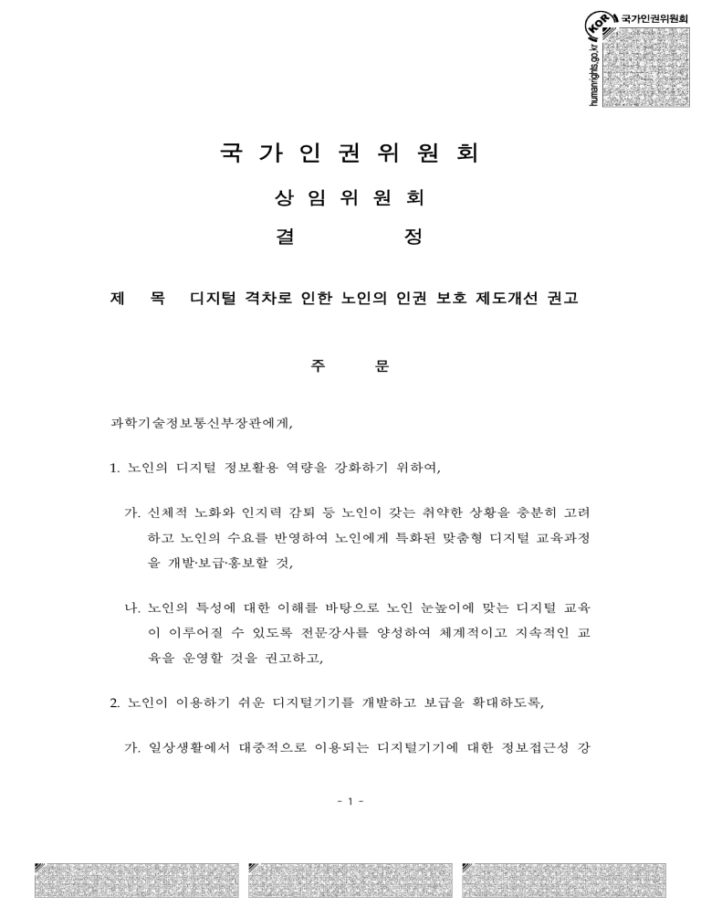 국 가 인 권 위 원 회 상 임 위 원 회 결 제 목 정 디지털 격차로 인한 노인의 인권 보호 제도개선 권고 주 문 과학기술정보통신부장관에게, 1. 노인의 디지털 정보활용 역량을 강화하기 위하여, 가. 신체적 노화와 인지력 감퇴 등 노인이 갖는 취약한 상황을 충분히 고려 하고 노인의 수요를 반영하여 노인에게 특화된 맞춤형 디지털 교육과정 을 개발‧보급‧홍보할 것, 나. 노인의 특성에 대한 이해를 바탕으로 노인 눈높이에 맞는 디지털 교육 이 이루어질 수 있도록 전문강사를 양성하여 체계적이고 지속적인 교 육을 운영할 것을 권고하고, 2. 노인이 이용하기 쉬운 디지털기기를 개발하고 보급을 확대하도록, 가. 일상생활에서 대중적으로 이용되는 디지털기기에 대한 정보접근성 강 - 1 - 화 지침을 마련하고 보급할 것, 나. 국가기관, 지방자치단체, 공공기관이 행정 정보나 서비스를 제공할 때, 노인의 디지털 정보접근성 보장 의무를 준수하는지 여부에 대한 관리‧ 감독을 강화할 것, 다. 민간 지능정보서비스 제공업자와 지능정보제품 제조업자가 노인의 접 근성을 고려하여 디지털기기의 기술을 개발·보급할 수 있도록 우선순 위를 정하여 단계적으로 의무화하고, 이 경우 기술적‧재정적 지원 방안 을 마련할 것을 권고하고, 3. 디지털 환경에 익숙하지 않은 노인이 소외되거나 불이익을 겪지 않도록, 디지털 방식과 병행하여 유선이나 대면상담 등 오프라인 방식의 서비스를 제공하고 지원함으로써 아날로그 접근권을 보장할 것을 권고하고, 4. 홀로 사는 노인 등 주변의 도움을 받을 수 없는 노인이 디지털기기 사용과 관련하여 상시 도움받을 수 있도록, 디지털 헬프데스크 및 핫라인을 설치 하는 방안에 대하여 검토할 것을 권고하고, 5. 노인이 디지털 정보와 서비스에 접근 및 이용할 수 있도록 수단과 편의를 제공하고, 노인의 특성을 고려한 기술을 개발, 보급 및 지원하는 등 노인의 디지털 정보접근권 보장 및 지원 근거를 「지능정보화 기본법」 등 관계 법 령에 마련할 것을 권고합니다. 이 유 - 2 - Ⅰ. 검토 배경 우리나라는 세계에서 고령화가 가장 급속하게 진행되고 있는 국가로, 2023년 65세 이상 노인 인구 비율은 18.4%이고, 2025년에는 20%까지 증가하여 초고령 사회에 진입할 것으로 전망된다. 참고로 노인(老人)은 사전적 의미로 ‘나이가 들어 늙은 사람’을 뜻하며, 「노인복지법」에서는 연령을 기준으로 하는 노인에 대한 정의를 명시하고 있지 않다. 이 결정에서는 사회적 통념을 고려하여 65세 이상인 사람을 ‘노인’으로 지칭하고자 한다. 과학기술정보통신부가 2022년 실시한 「디지털 정보격차 실태조사」(이하 ‘2022 과기부 실태조사’라 한다)에 따르면, 한국사회 디지털 정보화 활용 수준은 저소득층(87.8%), 장애인(75.2%), 농어민(70.6%), 고령층(69.9%) 순으로 이른바 정보취약계층 중에서도 고령층이 가장 낮다. 방송통신위원회가 2022년 실시한 「방송매체이용행태조사」를 살펴보면, 스마트폰을 일상의 필수 매체로 인식하는 연령별 비율은 10대 94.5%, 20대 93.1%, 30대 90.4%, 40대 89.2%이지만, 70대 이상은 14.4%로 노인의 스마트폰 활용이 타 연령대에 비하여 현저히 낮은 것으 로 나타났다. 또한 코로나바이러스감염증-19(이하 ‘코로나19’라 한다)로 인해 비대면 활동 이 장기화되면서 노인을 비롯한 정보취약계층이 사회안전망 사각지대에 노출되 는 사례들이 빈번히 목격되었다. 코로나19 시기에 등장한 QR 인증 방역패스나 공공기관을 중심으로 가속화되고 있는 비대면‧무인서비스 확산, 식당이나 상점 에서 주문하기 위한 무인정보단말기(흔히 ‘키오스크’라고 불린다) 사용부터 교 통정보 검색에 이르기까지 일상생활 전반에 걸쳐 폭넓은 디지털 전환(Digital - 3 - Transformation)이 이루어지고 있다. 노인은 스마트폰과 인터넷 사용이 익숙하지 못하여 온라인으로 이루어지는 활동에서 배제되거나 소외될 수 있다. 디지털 격차의 결과인 정보 소외는 경제 적·사회적·문화적 불평등을 유발하고, 삶의 질과 경제활동, 사회참여 등에 부정 적인 영향을 미치며, 생활상의 불편을 넘어 자존감 하락, 우울·고립감 악화에 더하여 생존권을 위협하는 요인으로 작용할 수 있어 이는 노인의 존엄한 삶을 누릴 권리와 관련하여 우리 사회가 시급히 해결하여야 할 중요한 인권 현안이다. 이에 국가인권위원회(이하 ‘위원회’라 한다)는 2022년 「디지털 격차로 인한 노인의 인권상황 실태조사」(이하 ‘2022 국가인권위 실태조사’라 한다)’를 실시하 였고, 이를 바탕으로 「국가인권위원회법」 제19조 제1호 및 제25조 제1항에 근거 하여, 디지털 기술의 발전에 따른 디지털 격차의 실태와 주요 요인 분석 및 노인 등 디지털 취약계층의 인권 보호를 위한 제도적 개선 방안에 관하여 검토하였다. Ⅱ. 판단 및 참고기준 「대한민국헌법」(이하 ‘헌법’이라 한다) 제10조, 제11조 및 제34조, 「세계인 권선언」 제19조 및 제25조, 유엔 「시민적 및 정치적 권리에 관한 국제규약」 (이하 ‘자유권규약’이라 한다) 제19조, 유엔 「경제적·사회적 및 문화적 권리 에 관한 국제규약」(이하 ‘사회권규약’이라 한다) 제2조, 제9