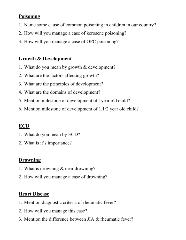 Poisoning 1. Name some cause of common poisoning in children in our country? 2. How will you manage a case of kerosene poisoning? 3. How will you manage a case of OPC poisoning? Growth & Development 1. What do you mean by growth & development? 2. What are the factors affecting growth? 3. What are the principles of development? 4. What are the domains of development? 5. Mention milestone of development of 1year old child? 6. Mention milestone of development of 1.1/2 year old child? ECD 1. What do you mean by ECD? 2. What is it’s importance? Drowning 1. What is drowning & near drowning? 2. How will you manage a case of drowning? Heart Disease 1. Mention diagnostic criteria of rheumatic fever? 2. How will you manage this case? 3. Mention the difference between JIA & rheumatic fever? VSD 1. Mention some a cyanotic heart disease in children? 2. How will you treat the case? 3. How will a child with VSD present? 4. What is the fate of VSD? TOF 1. What are the cyanotic Heart diseases? 2. What are the components of TOF? 3. How will a patient with TOF present with us? 4. Mention management of cyanotic spell? IMCI 1. What are the components of IMCI? 2. What is the danger sign below 2months and above 2months? 3. A child present with fever? 4. How will you assess according to IMCI? 5. What do you mean by high malaria low malaria and no malaria risk area? 6. What is the high malaria risk area of Bangladesh? 7. Management of uncomplicated falciparum malaria? 8. Management of severe malaria? 9. Management of vivax malaria? 10. A child present with ear problem. How will you assess clinically? 11. Classify ear problem according to IMCI? 12. What 3 line of ENCC chart means? 13. What is the line between & below signify?
