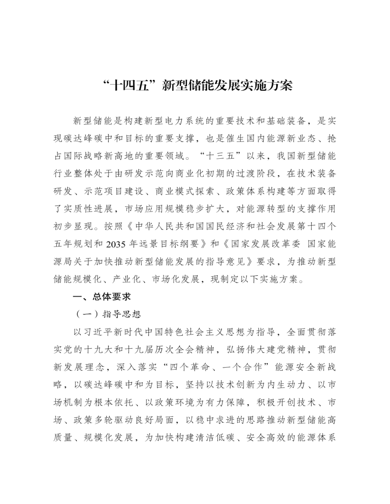 “十四五”新型储能发展实施方案 新型储能是构建新型电力系统的重要技术和基础装备,是实 现碳达峰碳中和目标的重要支撑,也是催生国内能源新业态、抢 占国际战略新高地的重要领域。“十三五”以来,我国新型储能 行业整体处于由研发示范向商业化初期的过渡阶段,在技术装备 研发、示范项目建设、商业模式探索、政策体系构建等方面取得 了实质性进展,市场应用规模稳步扩大,对能源转型的支撑作用 初步显现。按照《中华人民共和国国民经济和社会发展第十四个 五年规划和 2035 年远景目标纲要》和《国家发展改革委 国家能 源局关于加快推动新型储能发展的指导意见》要求,为推动新型 储能规模化、产业化、市场化发展,现制定以下实施方案。 一、总体要求 (一)指导思想 以习近平新时代中国特色社会主义思想为指导,全面贯彻落 实党的十九大和十九届历次全会精神,弘扬伟大建党精神,贯彻 新发展理念,深入落实“四个革命、一个合作”能源安全新战 略,以碳达峰碳中和为目标,坚持以技术创新为内生动力、以市 场机制为根本依托、以政策环境为有力保障,积极开创技术、市 场、政策多轮驱动良好局面,以稳中求进的思路推动新型储能高 质量、规模化发展,为加快构建清洁低碳、安全高效的能源体系 提供有力支撑。 (二)基本原则 统筹规划,因地制宜。强化顶层设计,突出科学引领作用, 加强与能源相关规划衔接,统筹新型储能产业上下游发展。针对 各类应用场景,因地制宜多元化发展,优化新型储能建设布局。 创新引领,示范先行。以“揭榜挂帅”等方式加强关键技术 装备研发,分类开展示范应用。加快推动商业模式和体制机制创 新,在重点地区先行先试。推动技术革新、产业升级、成本下 降,有效支撑新型储能产业市场化可持续发展。 市场主导,有序发展。明确新型储能独立市场地位,充分发 挥市场在资源配置中的决定性作用,更好发挥政府作用,完善市 场化交易机制,丰富新型储能参与的交易品种,健全配套市场规 则和监督规范,推动新型储能有序发展。 立足安全,规范管理。加强新型储能安全风险防范,明确新 型储能产业链各环节安全责任主体,建立健全新型储能技术标 准、管理、监测、评估体系,保障新型储能项目建设运行的全过 程安全。 (三)发展目标 到 2025 年,新型储能由商业化初期步入规模化发展阶段,具 备大规模商业化应用条件。新型储能技术创新能力显著提高,核 心技术装备自主可控水平大幅提升,标准体系基本完善,产业体 系日趋完备,市场环境和商业模式基本成熟。其中,电化学储能 技术性能进一步提升,系统成本降低 30% 以上;火电与核电机组 抽汽蓄能等依托常规电源的新型储能技术、百兆瓦级压缩空气储 能技术实现工程化应用;兆瓦级飞轮储能等机械储能技术逐步成 熟;氢储能、热(冷)储能等长时间尺度储能技术取得突破。 到 2030 年,新型储能全面市场化发展。新型储能核心技术装 备自主可控,技术创新和产业水平稳居全球前列,市场机制、商 业模式、标准体系成熟健全,与电力系统各环节深度融合发展, 基本满足构建新型电力系统需求,全面支撑能源领域碳达峰目标 如期实现。 二、强化技术攻关,构建新型储能创新体系 发挥政府引导和市场能动双重作用,加强储能技术创新战略 性布局和系统性谋划,积极开展新型储能关键技术研发,采用 “揭榜挂帅”机制开展储能新材料、新技术、新装备攻关,加速 实现核心技术自主化,推动产学研用各环节有机融合,加快创新 成果转化,提升新型储能领域创新能力。 (一)加大关键技术装备研发力度 推动多元化技术开发。开展钠离子电池、新型锂离子电池、 铅炭电池、液流电池、压缩空气、氢(氨)储能、热(冷)储能 等关键核心技术、装备和集成优化设计研究,集中攻关超导、超 级电容等储能技术,研发储备液态金属电池、固态锂离子电池、 金属空气电池等新一代高能量密度储能技术。 突破全过程安全技术。突破电池本质安全控制、电化学储能 系统安全预警、系统多级防护结构及关键材料、高效灭火及防复 燃、储能电站整体安全性设计等关键技术,支撑大规模储能电站 安全运行。突破储能电池循环寿命快速检测和老化状态评价技 术,研发退役电池健康评估、分选、修复等梯次利用相关技术, 研究多元新型储能接入电网系统的控制保护与安全防御技术。 专栏 1 “十四五”新型储能核心技术装备攻关重点方向 ——多元化技术:百兆瓦级压缩空气储能关键技术,百兆瓦级高安全性、低成本、长寿 命锂离子电池储能技术,百兆瓦级液流电池技术,钠离子电池、固态锂离子电池技术,高性 能铅炭电池技术,兆瓦级超级电容器,液态金属电池、金属空气电池,氢(氨)储能、热 (冷)储能等。 ——全过程安全技术:储能电池智能传感技术,储能电池热失控阻隔技术,电池本质安 全控制技术,基于大数据的故障诊断和预警技术,清洁高效灭火技术;储能电池循环寿命预 测技术,可修复再生的新型电池技术,电池剩余价值评估技术。 ——智慧调控技术:规模化储能与常规电源联合优化运行技术,规模化储能电网主动支 撑控制技术;分布式储能设施聚合互动调控技术,分布式储能与分布式电源协同控制技术, 区域能源调配管理技术。 创新智慧调控技术。集中攻关规模化储能系统集群智能