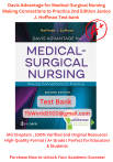 Davis Advantage for Medical-Surgical Nursing Making Connections to Practice 2nd Edition Janice J. Hoffman Test bank Test Bank TbWorld2020@gmail.com (All Chapters , 100% Verified and Original Resource) High-Quality Format | A+ Grade | Perfect for Educators & Students Purchase Now to Unlock Your Academic Success! Chapter 1: Foundations for Medical-Surgical Nursing Multiple Choice Identify the choice that best completes the statement or answers the question. ____ 1. Which type of nursing is the root of all other nursing practice areas? 1. Pediatric nursing 2. Maternal child nursing 3. Medical-surgical nursing 4. Mental health–psychiatric nursing ____ 2. Which competency did the Nursing Executive Center of the Advisory Board identify as the greatest academic-practice gap for new graduate nurses? 1. Knowledge of pharmacology 2. Interpretation of assessment data 3. Knowledge of pathophysiology 4. Decision making ____ 3. In the Nursing Executive Center of the Advisory Board report, what recommendations are made to address the academic practice gap for new graduate nurses? 1. Mandatory number of clinical hours 2. Increased credits in all entry level courses 3. Residency programs 4. Additional science prerequisite courses ____ 4. The medical-surgical nurse wants to determine if a policy change is needed for an identified clinical problem. Which is the nurse’s first action? 1. Developing a question 2. Disseminating the findings 3. Conducting a review of the literature 4. Evaluating outcomes of practice change ____ 5. Which statement regarding the use of the nursing process in clinical practice is accurate? 1. “The nursing process is closely related to clinical decision making.” 2. “The nursing process is used by all members of the interprofessional team to plan care.” 3. “The nursing process has four basic steps: assessment, planning, implementation, and evaluation.” 4. “The nursing process is being replaced by the implementation of evidence-based practice.” ____ 6. The nurse develops a research question based on observations noted while providing care to patients on the medical-surgical unit. Which step does the nurse implement next during the process of evidence-based practice? 1. Search for the best evidence. 2. Evaluate the quality of the evidence. 3. Integrate the evidence into unit practice. Copyright © 2020 F. A. Davis Company 4. Disseminate the evidence to the staff on the unit. ____ 7. The medical-surgical nurse identifies a clinical practice issue and wants to determine if there is sufficient evidence to support a change in practice. Which type of study provides the strongest evidence to support a practice change? 1. Randomized controlled study 2. Quasi-experimental study 3. Case-control study 4. Cohort study ____ 8. The nurse is evaluating the level of evidence found during a recent review of the literature. Which evidence carries the lowest level of support for a practice change? 1. Level IV 2. Level V 3. Level VI 4. Level VII ____ 9. The nurse is reviewing evidence from a quasi-experimental research study. Which level of evidence should the nurse identify for this research study? 1. Level I 2. Level II 3. Level III 4. Level IV ____ 10. Which level of evidence should the nurse identify when reviewing evidence from a single descriptive research study? 1. Level IV 2. Level V 3. Level VI 4. Level VII ____ 11. To deliver patient-centered care, the nurse needs to understand the implications of findings from which organization that provides a standardized approach to the collection of data from patients regarding their experiences within the healthcare system? 1. The Joint Commission (TJC) 2. Hospital Consumer Assessment of Healthcare Providers and Systems (HCAHPS) 3. The Nursing Executive Center of the Advisory Board 4. American Nurse Credentialing Center Magnet® Recognition program ____ 12. The nurse manager is preparing a staff education presentation in preparation for The Joint Commission (TJC) visit. Which data does the nurse manager include that specifically address aspects of patient-centered care? 1. Licensure requirements of staff 2. Patient participation in plan of care 3. Communication between providers and staff 4. Staffing ratios Copyright © 2020 F. A. Davis Company ____ 13. Which statement should the nurse make when communicating the “S” in the SBAR approach for effective communication? 1. “The patient presented to the emergency department at 0200 with lower left abdominal pain.” 2. “The patient rated the pain upon admission as a 3 on a 10-point numerical scale.” 3. “The patient has no significant issues in the medical history.” 4. “I believe the patient needs to be prescribed a medication for pain.” ____ 14. The staff nurse is communicating with the change nurse about the change of status of the patient. The nurse would begin her communication with which statement if correctly using the SBAR format? 1. “The patient’s heart rate is 110.” 2. “I think this patient needs to be transferred to the critical care unit.” 3. “The patient is a 68-year-old man admitted last night.” 4. “The patient is complaining of chest pain.” ____ 15. Which action should the nurse implement when providing patient care in order to support The Joint Commission’s (TJC) National Patient Safety Goals (NPSG)? 1. Silencing a cardiorespiratory monitor 2. Identifying each patient using one source 3. Determining patient safety issues on admission 4. Decreasing the amount of pain medication administered ____ 16. Which nursing action exemplifies the Quality and Safety Education for Nursing (QSEN) competency of safety? 1. Advocating for a patient who is experiencing pain 2. Considering the patient’s culture when planning care 3. Evaluating patient learning style before implementing discharge instructions 4. Assessing the right drug before administering a prescribed patient medication ____ 17. The medical-surgical nurse is providing patient care. Which 