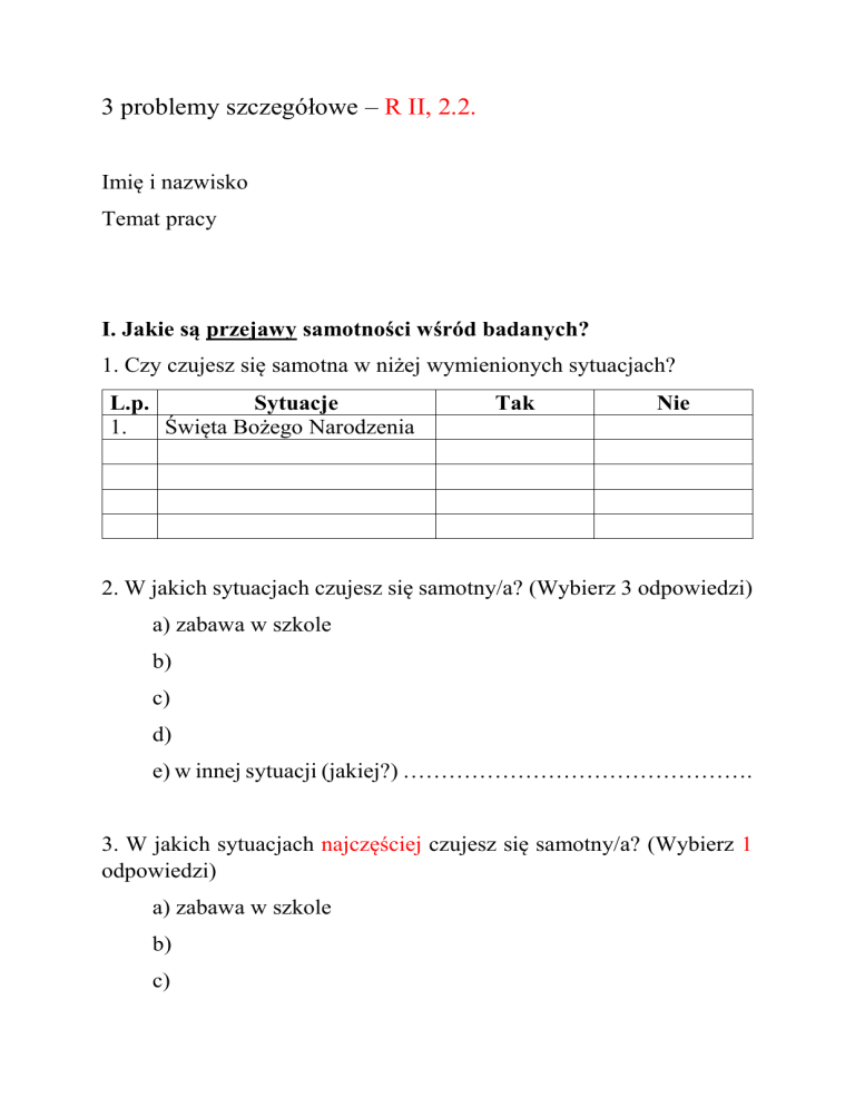 3 problemy szczegółowe – R II, 2.2. Imię i nazwisko Temat pracy I. Jakie są przejawy samotności wśród badanych? 1. Czy czujesz się samotna w niżej wymienionych sytuacjach? L.p. Sytuacje 1. Święta Bożego Narodzenia Tak Nie 2. W jakich sytuacjach czujesz się samotny/a? (Wybierz 3 odpowiedzi) a) zabawa w szkole b) c) d) e) w innej sytuacji (jakiej?) ………………………………………. 3. W jakich sytuacjach najczęściej czujesz się samotny/a? (Wybierz 1 odpowiedzi) a) zabawa w szkole b) c) d) e) w innej sytuacji (jakiej?) ………………………………………. 4. Jak często czujesz się samotny/a w niżej wymienionych sytuacjach? 1. Bardzo rzadko Rzadko Czasami Często Bardzo często L.p. Sytuacje Wigilia nnnnn mmmmmm 5. Jak często czujesz się samotny/a w niżej wymienionych sytuacjach? Oceń proszę w skali od 5 do 1, gdzie 5 oznacza „bardzo często”, a 1 oznacza „bardzo rzadko”. L.p. Sytuacje 1. 2. 3. Wigilia nnnnn mmmmmm 5 4 3 2 1 8. II. 8 III. 8