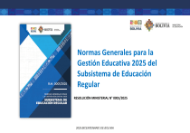 Normas Generales para la Gestión Educativa 2025 del Subsistema de Educación Regular RESOLUCIÓN MINISTERIAL N° 0001/2025 R.M. 0001/2025 ESTRUCTURA TITULO I ASPECTOS GENERALES DE GESTIÓN INSTITUCIONAL, ACADÉMICA Y ADMINISTRATIVA CAPÍTULO I DISPOSICIONES GENERALES CAPÍTULO II GESTIÓN EDUCATIVA CAPÍTULO III REGISTRO Y ATENCIÓN DE ESTUDIANTES EN EL SISTEMA EDUCATIVO PLURINACIONAL CAPÍTULO IV LINEAMIENTOS PARA EL DESARROLLO DE LA GESTIÓN EDUCATIVA TITULO II CAPÍTULO I GESTIÓN CURRICULAR DEL MODELO EDUCATIVO SOCIOCOMUNITARIO PRODUCTIVO CAPÍTULO II ACTIVIDADES ACADÉMICAS Y PEDAGÓGICAS CAPÍTULO III GESTIÓN ADMINISTRATIVA E INSTITUCIONA CAPÍTULO IV PERSONAL DEL SUBSISTEMA DE EDUCACIÓN REGULAR TITULO III INSTITUCIONES EDUCATIVAS PRIVADAS CAPÍTULO I FUNCIONAMIENTO DE UNIDADES EDUCATIVAS PRIVADAS TITULO IV POLÍTICAS SOCIALES EN EDUCACIÓN CAPÍTULO I PROTECCIÓN INTEGRAL Y PREVENCIÓN Artículo 1 R.M. 0001/2025 Objeto Regular los procedimientos de planificación, organización, ejecución, acompañamiento y evaluación de la Gestión Educativa 2025 del Subsistema de Educación Regular, en el marco del Modelo Educativo Sociocomunitario Productivo establecido en la Ley N° 070. Artículo 2 R.M. 0001/2025 Ámbito de aplicación Es de aplicación obligatoria en toda la estructura administrativa y de gestión curricular del Subsistema de Educación Regular. (UE fiscales, privadas y de convenio). Inicial en Familia Comunitaria Primaria Comunitaria Vocacional Secundaria Comunitaria Productiva Artículo 3 R.M. 0001/2025 Gestión educativa ETAPAS Periodo de inscripción 20 al 24 de enero Planificación y organización 30 y 31 de enero Desarrollo Curricular Del 03 de febrero al 02 de diciembre. 200 días Cierre de gestión y evaluación institucional Del 03 al 12 de diciembre Artículo 4 R.M. 0001/2025 Calendario gestión 2025 Contempla doscientos (200) días hábiles trabajados para el desarrollo y evaluación curricular, organizados en tres trimestres, para los niveles: Educación Inicial en Familia Comunitaria. Educación Primaria Comunitaria Vocacional. Educación Secundaria Comunitaria Productiva. DS. 28690/2006. Artículo 4 R.M. 0001/2025 CALENDARIO GESTIÓN 2025 Primer Trimestre: TRIMESTRE PRIMER TRIMESTRE 66 DÍAS HÁBILES MESES FECHAS Febrero 03 Febrero 03 al 28 Marzo 05 al 31 Abril 01 al 30 Mayo 02 al 09 DÍAS HÁBILES TRABAJADOS ACTIVIDADES RESPONSABLES Inauguración de la Gestión Educativa e Direcciones departamentales inicio de clases de educación a través de las Desarrollo 20 subdirecciones de educación Curricular regular, direcciones distritales Desarrollo 19 educativas, direcciones de Curricular unidades educativas, en Desarrollo 21 coordinación con las juntas Curricular escolares de padres y madres de familia o consejos Desarrollo 6 educativos social Curricular comunitarios Artículo 4 R.M. 0001/2025 Segundo Trimestre: TRIMESTRE SEGUNDO TRIMESTRE 68 DÍAS HÁBILES MESES FECHAS DÍAS HÁBILES TRABAJADOS Mayo 12 al 30 15 Junio 02 al 30 20 Julio 01 al 04 4 Julio Agosto 21 al 31 01 al 29 ACTIVIDADES Desarrollo Curricular Desarrollo Curricular Desarrollo Curricular RESPONSABLES Direcciones departamentales de educación a través de las subdirecciones de educación regular, direcciones distritales educativas, direcciones de unidades educativas, en coordinación con las juntas escolares de padres y madres de familia o consejos educativos social comunitarios Del 07 al 18 de julio / DESCANSO PEDAGÓGICO Desarrollo Direcciones departamentales de educación a 9 Curricular través de las subdirecciones de educación 20 Desarrollo Curricular regular, direcciones distritales educativas, direcciones de unidades educativas, en coordinación con las juntas escolares de padres y madres de familia o consejos educativos social comunitarios Artículo 4 R.M. 0001/2025 Tercer Trimestre: TRIMESTRE TERCER TRIMESTRE 66 DÍAS HÁBILES MESES FECHAS DÍAS HÁBILES TRABAJADOS Septiembre 01 al 30 22 Octubre 01 al 31 23 Noviembre 04 al 28 19 Diciembre 01 al 02 2 TOTAL DÍAS HÁBILES TRABAJADOS ACTIVIDADES RESPONSABLES Desarrollo Curricular Desarrollo Curricular Desarrollo Curricular Direcciones departamentales de educación a través de las subdirecciones de educación regular, direcciones distritales educativas, direcciones de unidades educativas, en coordinación con las juntas escolares de padres y madres de familia o consejos educativos social comunitarios Desarrollo Curricular 200 DÍAS (1 día de feriado departamental) R.M. 0001/2025 Artículo 6 – 7 Horario de invierno y descanso pedagógico: De acuerdo a características meteorológicas, climáticas y comportamiento epidemiológico de cada región. Inicia el lunes 7 de julio y tendrá una duración de dos semanas. Artículo 10 R.M. 0001/2025 Periodo de inscripciones: Del 20 al 21 de enero para estudiantes nuevos. Del 23 al 24 de enero estudiantes que cambian de unidad educativa. Edades cronológicas para la inscripción: (estudiantes nuevos) Nivel Año de escolaridad Años cumplidos al 30 de junio de la gestión 2025 Educación Inicial en Familia Comunitaria Primero 4 Segundo 5 Primero 6 Educación Primaria Comunitaria Vocacional R.M. 0001/2025 Artículo 12 Requisitos para la inscripción: Nuevos Antiguos Certificado de nacimiento y Inscripción automática. Cédula de identidad. Ratificado con la presencia física Certificado de vacunas (EIFC) de la o el estudiante en la 1ra Certificado de centros de semana (urbano) y hasta 14 de educación infantil. febrero (rural). Homologación De acuerdo a la tabla de equivalencias aprobado en el marco del Convenio Andrés Bello y MERCOSUR, para proceder a su inscripción. R.M. 0001/2025 Artículo 15 Inscripción de estudiantes que provienen del exterior La inscripción, progresión y salida de estudiantes, que provienen de unidades educativas del extranjero será de acuerdo a normativa vigente, con la finalidad de garantizar el derecho a la educación de los estudiantes R.M. 0001/2025 Artículo 17 