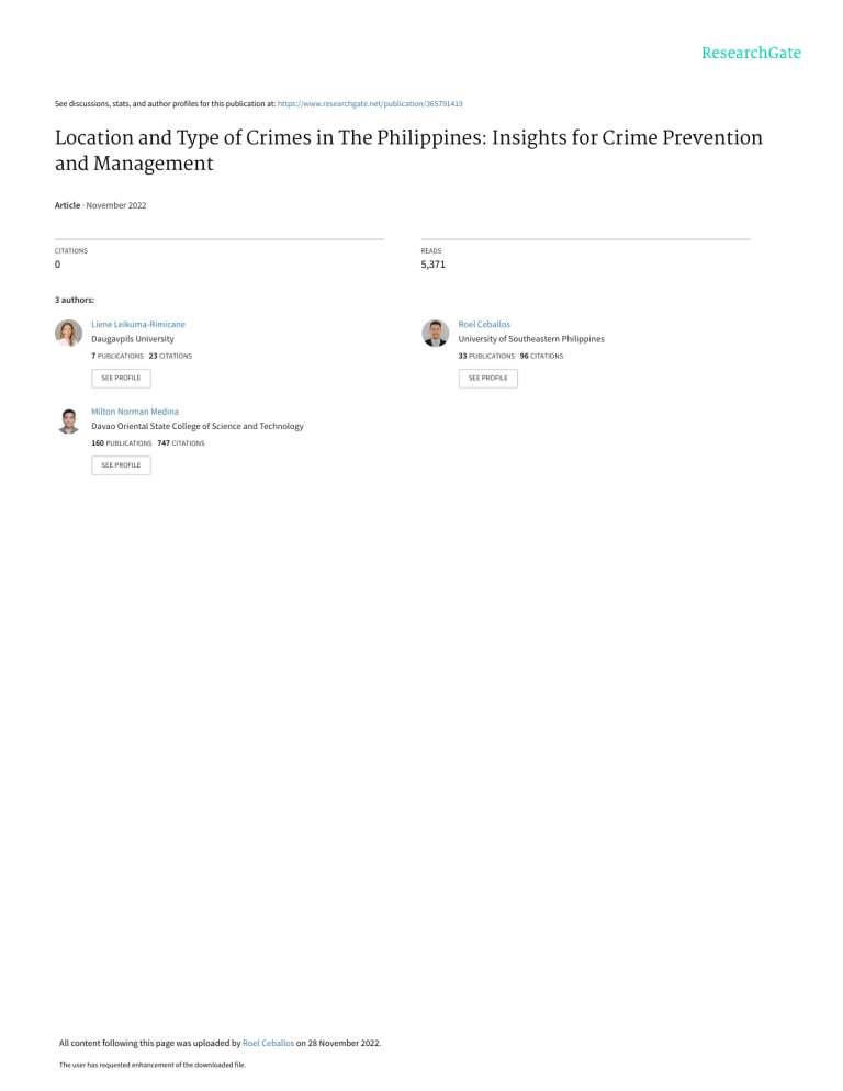 See discussions, stats, and author profiles for this publication at: https://www.researchgate.net/publication/365791419 Location and Type of Crimes in The Philippines: Insights for Crime Prevention and Management Article · November 2022 CITATIONS READS 0 5,371 3 authors: Liene Leikuma-Rimicane Roel Ceballos Daugavpils University University of Southeastern Philippines 7 PUBLICATIONS 23 CITATIONS 33 PUBLICATIONS 96 CITATIONS SEE PROFILE Milton Norman Medina Davao Oriental State College of Science and Technology 160 PUBLICATIONS 747 CITATIONS SEE PROFILE All content following this page was uploaded by Roel Ceballos on 28 November 2022. The user has requested enhancement of the downloaded file. SEE PROFILE International Journal of Criminal Justice Science Vol 17 Issue 1 January – June 2022 Copyright © 2022 International Journal of Criminal Justice Sciences (IJCJS) – Official Journal of the South Asian Society of Criminology and Victimology (SASCV) - Publisher & Editor-in-Chief – K. Jaishankar ISSN: 0973-5089 January – June 2022. Vol. 17 (1): 22–33. DOI: 10.5281/zenodo.4756087 / IJCJS is a Diamond Open Access (Authors / Readers No Pay Journal). Indexed in Scopus and Emerging Sources Citation Index (Web of Science). This is an Open Access article distributed under the terms of the Creative Commons Attribution-NonCommercial-ShareAlike 4.0 International (CC-BY-NC-SA 4.0) License, which permits unrestricted non-commercial use, distribution, and reproduction in any medium, provided the original work is properly cited. Location and Type of Crimes in The Philippines: Insights for Crime Prevention and Management Liene Leikuma-Rimicane1 Daugavpils University Roel F. Ceballos2 University of Southeastern Philippines Milton Norman D. Medina3* Davao Oriental State University Abstract The purpose of this study was to determine the association of location and types of crimes in the Philippines and understand the impact of COVID-19 lockdowns by comparing the crime incidence and associations before and during the pandemic. A document review was used as the main method of data collection using the datasets from the Philippine Statistics Authority- Annual Statistical Yearbook (PSA-ASY). The dataset contained the volume of index crimes in the Philippines from 2016 to 2020. The index crimes were broken down into two major categories: crimes against persons and crimes against property. Incidence of crime-by-crime type was available for different administrative regions in the Philippines. Chi-square test and correlation plot of chi-square residual were used to determine the associations between the locations and types of index crimes. A correlation plot of the chisquare residual was used to investigate the patterns of associations. Results suggest that the continuing effort of the Philippine government to fight against criminality has resulted in a steady decline in the incidence of index crimes in the Philippines. The pandemic too contributed to the decline of crime incidence in the country. These results imply that police surveillance activities in highly populated areas and specific interventions to address sexual violence must be in place during community lockdowns. The Philippine National Police should heighten its campaign in violence against women and increase its workforce visibility especially in remote and densely populated areas. The results of this study can be used as input to local government units for developing programs and plans on crime prevention. For future researches, it is recommended to conduct a precinct level analysis for a closer look at crime surveillance. Keywords: crime type, COVID-19, index crimes, locations, Philippines 1 Faculty of Education and Management, Daugavpils University, Parades Str. 1, Daugavpils, LV-5401, Latvia. Email: liene.rimicane@du.lv, ORCID: 0000-0002-4677-4795 2 Mathematics and Statistics Department, University of Southeastern Philippines. Email: roel.ceballos@usep.edu.ph, ORCID: 0000-0001-8267-6482 3* Institute of Agriculture and Life Sciences, Davao Oriental State University, Dahican, Mati City 8200 Philippines; Email: miltonnormanmedina@gmail.com, ORCID: 0000-0001-6858-8048 22 © 2022 International Journal of Criminal Justice Sciences. Under a Creative Commons Attribution-NonCommercial-ShareAlike 4.0 International (CC BY-NC-SA 4.0) Leikuma-Rimicane et al. - Location and Type of Crimes in The Philippines: Insights for Crime Prevention and Management Introduction Increasing crime solution efficiency in any nation requires understanding of the crime trends and their associations to specific locations, which will enhance the crime prevention and management of the police and other enforcement agencies. Crime prevention and management are at the forefront of the agenda of the Philippine government under the Duterte administration. One of the administration's goals is to improve the lives of Filipinos by aggressively reducing corruption and crimes (Timberman, 2019). To cite a few of its strategies, the government has implemented the anti-narcotics campaign or most known as the 'War-on-Drugs,' and the continuous fight against criminality, resulting in thousands of drug-peddlers all over the country (Gita-Carlos, 2019). One step taken by Philippine government towards crime prevention and increase the police visibility was passing of the law to modify the base salary of military and uniformed personnel. This step was also taken to motivate the existing personnel and encourage Filipinos to pursue careers in the Armed Forces of the Philippines. The salary adjustments resulted in a 72.18% increase for all ranks of uniformed personnel (Department of Budget and Management, 2018). As a result, police visibility has increased in different regions as the Philippine National Police (PNP) has also increased the number of police and police stations all over the country. The Philippine National Police have also reported an increase in their overall crime solution efficien