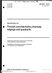 BS 340 : 19’79 UDC 625.888 :666.97 Specification for (I)’ Precast concrete kerbs, channels, edgings and quadrants Spécification des bordures, des caniveaux, des bords et des quadrants en béton préfabriqué O Spezifikation für Bordsteine, Rinnsteine, Randsteine und Quadranten aus Fertigteilbeton British Standards Institution --`,,`,,``,`,,`,`,,`,```,`,,```-`-`,,`,,`,`,,`--- Copyright British Standards Institution Provided by IHS under license with BSI - Uncontrolled Copy No reproduction or networking permitted without license from IHS Licensee=The Hong Kong Inst of Architects/5970015001 Not for Resale, 12/15/2008 00:35:08 MST - BSI BS*390 7 9 BS 340 : 1979 Contents .Foreword Cooperating organizations Lb24bb9 0005704 5 Page Page Inside front cover Back cover Appendices A. Methods of measuring B. Test for transverse strength C. Test for absorption of water D. Ordering kerbs, channels etc, Specification 1. Scope 2. References 3. Cement 4. Aggregates 5. Other materials 6. Finish and colour 7. Casting and curing 8. Dimensions and tolerances 9. Test requirements 1O. Manufacturer's certificate 11. Facilities for sampling 12. Samples for testing 13. Independent tests 14, Test results 15. Ordering 1 1 1 1 1 1 1 2 2 2 3 3 3 3 3 . 7 7 8 9 Table 1. Water absorption limits 2 Figures 1 to 9. Sections of standard kerbs and channels 1O t o 13. Sections of standard edgings 14. Standard quadrants Nomenclature and length of radius kerbs 15. and channels Dropper kerbs for use with figure 7 and 16. figure 2(a) profiles Notched straightedge and gauge block 17. Arrangement of loading for transverse 18. strength t e s t 4 5 5 5 6 7 8 Foreword This British Standard has been revised under the authority of the Road Engineering Standards Committee. I t was first published in 1928 and subsequently revised in 1936, 1950 and 1963. In accordance with the change to the metric system in the construction industry, values in this standard are expressed in metric terms. For further information on units reference should be made to BS 3763 and PD 5686. A number of changes to the arrangement and headings of clauses have been made in this revision and a new appendix indicating methods of measuring the products is incorporated. These changes align the contents of this British Standard with those of BS 368, which specifies requirements for precast concrete flags. A further appendix has also been added giving recommendations for the ordering of products to this British Standard. The clauses dealing with materials take into account revised and new British Standards. The provision allowing the use of high alumina cement has been omitted, but this standard now specifies the requirements for the use of pulverizedfuel ash. As a result of research work on the method of performing the test for absorption of water, the previous t e s t a t 10 min has been deleted and replaced by a 30 min absorption test, To give more uniform results, this test is carried out on specimens sawn from the products instead of cut, as previously. Due to the change in the test procedure the absorption limit has been changed and different values are given for different ages a t test. revision have been limited to three (figures 2(a), 7(a) and 16), not through any lack of desire to incorporate alternatives or even omit some profiles, but because statistics indicate that the range given in this standard s t i l l represents over 90 % of production in the United Kingdom. Dropper kerbs for figure 7 prqfile and crossing kerbs have been included (as figures 16 and 2(a) respectively) since, although relatively small in total production, they are considered of sufficient importance to merit inclusion. The metric dimensions are conversions to the nearest 5 mm of the imperial sizes of the previous edition, By revising the average dimension tolerance in 8.2.1 from F 2 mm to 4 mm (but keeping the individual value a t F 2 mm), products manufactured in imperially designed moulds will continue to comply with this specification, whilst allowing the replacement of life expired moulds with ones fabricated to more reasonable metric dimensions. * This revision does not preclude the use of air entrainment, but it specifies no special requirements for air-entrained products, Although there is evidence that air-entrainment improves the frost resistance of vibrated concrete kerbs, it may reduce transverse strength, The committee s t i l l does not favour either reducing the existing standard of t e s t for transverse strength for non airentrained kerbs, or introducing an alternative figure for air-entrained concrete. It s t i l l considers it preferable, for the time being, to leave the requirements for air-entrainedkerbs as a subject of arrangement between the purchaser and the manufacturer, Kerbs of good quality may have slight surface blemishes which are not detrimental to performance, --`,,`,,``,`,,`,`,,`,```,`,,```-`-`,,`,,`,`,,`--- Additions to the range of cross sections included in this Copyright British Standards Institution Provided by IHS under license with BSI - Uncontrolled Copy No reproduction or networking permitted without license from IHS Licensee=The Hong Kong Inst of Architects/5970015001 Not for Resale, 12/15/2008 00:35:08 MST British Standard Specification for Precast concrete kerbs, channels, edgings and quadrants cement. The sulphate content shall be calculated from the known sulphate contents of the cement, aggregates (where applicable) and pulverized-fuelash, as determined by tests carried out in accordance with the requirements of BS 12,BS 1047 and BS 3892 respectively. 5.2 Pigments. Any pigments used in the colouring of the products shall comply with the requirements of BS 1014. Specif ication 1. Scope This British Standard specifies requirements for precast concrete kerbs, channels, edgings and quadrants, all referred t o as 'products' in this standard, in a range of sections, lengths and radii, for use in the construction of carriageways and footways.