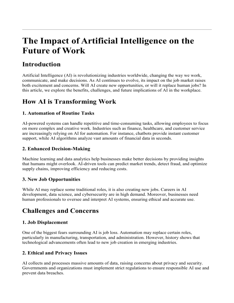 The Impact of Artificial Intelligence on the Future of Work Introduction Artificial Intelligence (AI) is revolutionizing industries worldwide, changing the way we work, communicate, and make decisions. As AI continues to evolve, its impact on the job market raises both excitement and concerns. Will AI create new opportunities, or will it replace human jobs? In this article, we explore the benefits, challenges, and future implications of AI in the workplace. How AI is Transforming Work 1. Automation of Routine Tasks AI-powered systems can handle repetitive and time-consuming tasks, allowing employees to focus on more complex and creative work. Industries such as finance, healthcare, and customer service are increasingly relying on AI for automation. For instance, chatbots provide instant customer support, while AI algorithms analyze vast amounts of financial data in seconds. 2. Enhanced Decision-Making Machine learning and data analytics help businesses make better decisions by providing insights that humans might overlook. AI-driven tools can predict market trends, detect fraud, and optimize supply chains, improving efficiency and reducing costs. 3. New Job Opportunities While AI may replace some traditional roles, it is also creating new jobs. Careers in AI development, data science, and cybersecurity are in high demand. Moreover, businesses need human professionals to oversee and interpret AI systems, ensuring ethical and accurate use. Challenges and Concerns 1. Job Displacement One of the biggest fears surrounding AI is job loss. Automation may replace certain roles, particularly in manufacturing, transportation, and administration. However, history shows that technological advancements often lead to new job creation in emerging industries. 2. Ethical and Privacy Issues AI collects and processes massive amounts of data, raising concerns about privacy and security. Governments and organizations must implement strict regulations to ensure responsible AI use and prevent data breaches. 3. The Need for Reskilling As AI reshapes industries, workers must adapt by learning new skills. Companies and governments should invest in education and training programs to help employees transition into AI-driven workplaces. The Future of AI in the Workplace AI is not here to replace humans but to enhance productivity and innovation. The key to a successful future lies in collaboration between humans and AI, leveraging technology to improve efficiency while maintaining ethical standards. Organizations that embrace AI while prioritizing workforce development will thrive in the digital age. By fostering a culture of lifelong learning, we can ensure that AI serves as a tool for progress rather than a threat to employment. Conclusion Artificial Intelligence is transforming the way we work, offering both opportunities and challenges. While concerns about job displacement and ethics remain, AI has the potential to drive innovation and economic growth. The key to success is adaptability—workers, businesses, and policymakers must work together to shape a future where AI and human intelligence coexist harmoniously.