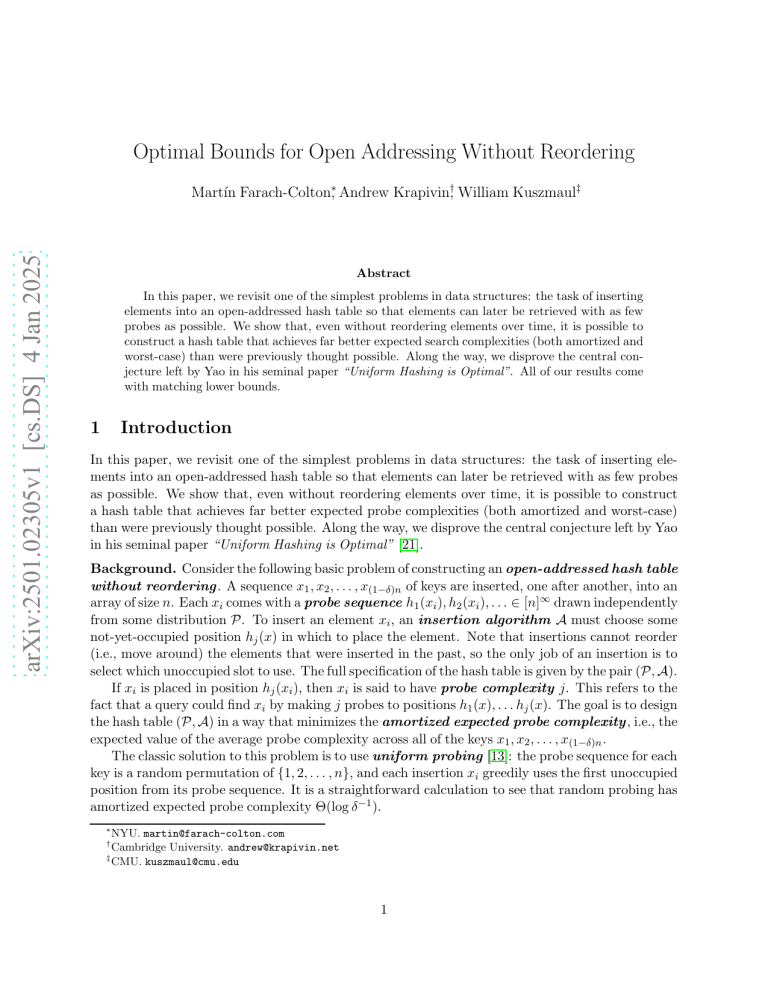 the insertions that are performed when the hash table is very full. Uniform probing achieves a worstcase expected probe complexity of O(δ−1 ). It has remained an open question, however, whether this