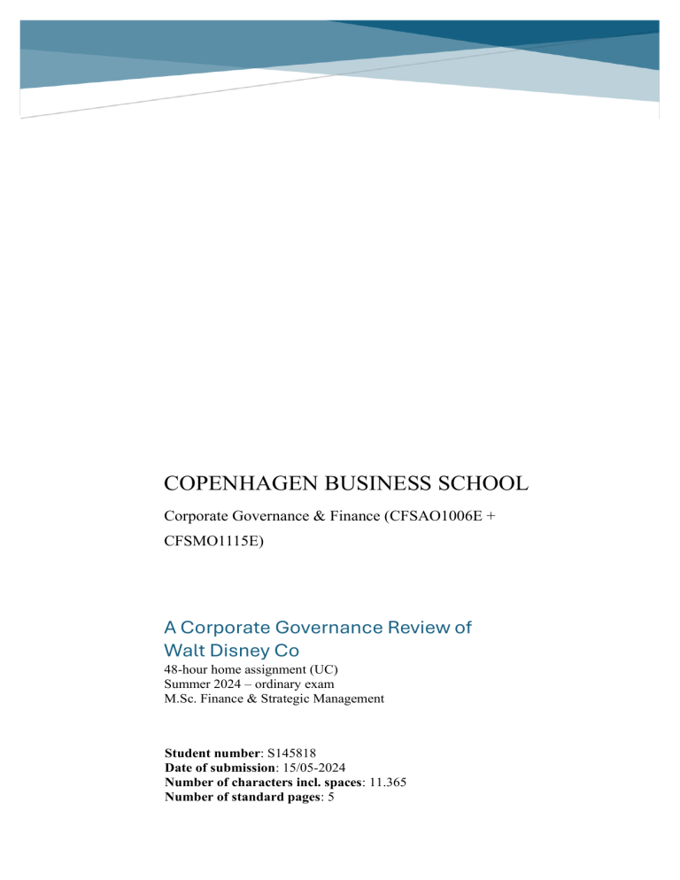 COPENHAGEN BUSINESS SCHOOL Corporate Governance & Finance (CFSAO1006E + CFSMO1115E) A Corporate Governance Review of Walt Disney Co 48-hour home assignment (UC) Summer 2024 – ordinary exam M.Sc. Finance & Strategic Management Student number: S145818 Date of submission: 15/05-2024 Number of characters incl. spaces: 11.365 Number of standard pages: 5 S145818 Corporate Governance & Finance 15/05-2024 Company analysis The Walt Disney Company (henceforth Disney) is a diversified global entertainment company, operating in three major segments: Entertainment, Sport, and Experiences (Yahoo! Finance, 2024a). With a focus on unparalleled storytelling, Disney creates value through linear cable TV, alongside managing theme parks, streaming services, merchandise, and intellectual property licensing (Yahoo! Finance, 2024a). Positioned as an industry leader, Disney focuses on sustaining growth by diversifying into new realms, notably streaming (The Walt Disney Company, 2024a). Despite encountering market stagnation, Disney pursues long-term profitability through aggressive costcutting and bolstering direct-to-consumer revenue (The Walt Disney Company, 2024a). Competing with giants like Netflix, as well as major studios, e.g. Warner Bros. and Comcast, and theme park operators, Disney faces significant challenges, particularly in streaming profitability and operational efficiency (Brown, 2023; Guttmann, 2023). While maintaining a strong capital structure, Disney's television business confronts revenue stagnation and declining profits due to industry shifts (Brumley, 2023). Company performance Comparatively, Disney's stock performance against market indexes (S&P 500, Dow Jones Industrial Average, NASDAQ Composite) indicates consistent underperformance (Appendix 1.1). Its stock price movements have become stagnant, indicating a lack of significant growth. Comparing Disney's stock price to industry peers such as Netflix, Warner Bros., and Comcast shows that while all follow a similar trajectory, Netflix outperforms the others, suggesting that Disney faces stiff competition within the streaming industry (Appendix 1.2). Despite increasing revenue, Disney's operating income is slowly deteriorating (Appendix 1.3; Appendix 1.4). Additionally, Return on Investment (ROI) has remained relatively steady but recently shows a downward trajectory, indicating decreasing profitability due to escalating expenses (Appendix 1.6). The decline in Earnings per Share (EPS), in comparison to industry peers, raises concerns about Disney's earnings potential and governance mechanisms, signaling subpar performance against expectations (Appendix 1.7). However, in terms of ESG metrics, Disney's ratings depict average performance compared to peers, with notable focus on social initiatives such as employee education and Science-Based Target Initiative (STBi) commitment (Appendix 1.8; The Walt Disney Company, 2024b). 1 S145818 Corporate Governance & Finance 15/05-2024 Corporate Governance mechanisms Corporate governance comprises a collection of mechanisms designed to address agency issues (Thomsen & Conyon, 2019). Ownership structure The ownership of Disney is mainly institutional (Appendix 2.0). Institutional investors typically follow passive investment strategies and adhere to regulatory demands for voting, often guided by proxy advisers; they prioritize shareholder value creation, and rarely partake in shareholder activism (Thomsen & Conyon, 2019). When identifying the largest owners of Disney, it is prominent that there is no controlling stakeholder (Appendix 2.0). According to La Porta at al. (1999) the 10% level has been broadly used as a cut point to test the difference between dispersed and concentrated ownership structures because it provides a significant stake. Furthermore, market-based systems are characterized by low ownership concentration, which is also the case of Disney (Thomsen & Conyon, 2019; Appendix 2.0). Board composition Disney's corporate governance structure primarily resembles a one-tier system, with a 12-member board elected by shareholders (The Walt Disney Company, 2024a). The board comprises mainly US nationalities, averaging 61 years old, with approximately 42% being women and possessing diverse backgrounds ranging from engineering to law (Appendix 2.1). While Disney asserts that 11 board members are independent, the UK Governance Code would deem three of the directors dependent (Thomsen & Conyon, 2019); the fact that Everson and Lagomasino serve on the Coca Cola board implies cross-directorships or significant connections with other directors, and Gorman’s substantial ownership of Disney shares imply that a personal financial interest in the company may influence his decision-making as a board member to a larger extent (Lin, 2024; The Coca-Cola Company, n.d.). Board independence is argued to be a central driver of CEO turnover (Thomsen & Conyon, 2019). In the case of Disney, where CEO tenures have been unusually long, lasting from 2005 to 2020 and resuming in 2022 after the replacement of Chapek, it is plausible that a lack of board independence may have contributed to these prolonged tenures. (The Walt Disney Company, 2024c). In the board of Disney, there is no duality, i.e. the CEO is not the chairman of the board (The Walt Disney Company, 2024c). Incentive structures The Compensation Committee strongly advocates for a pay-for-performance model (The Walt Disney Company, 2024a). In the fiscal year 2023, 96% of Iger's targeted total annual compensation was 2 S145818 Corporate Governance & Finance 15/05-2024 variable based on company and stock price performance, while non-executive management's portion was 85% risk based (Appendix 2.3). Incentive structures aim to align shareholder and managerial interest as they address both of the moral hazard and the adverse selection variety (Thomsen & Conyon, 2019). The annual compensation comprises of a fiscal performance target where actual performance payout i