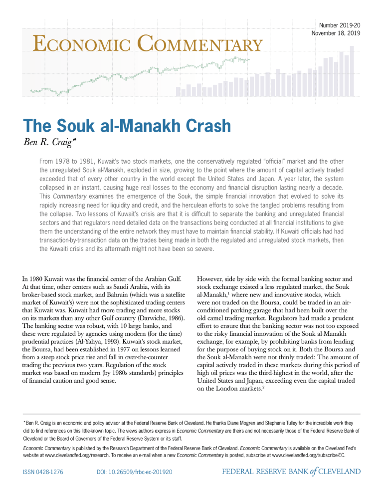 Number 2019-20 November 18, 2019 The Souk al-Manakh Crash Ben R. Craig* From 1978 to 1981, Kuwait’s two stock markets, one the conservatively regulated “official” market and the other the unregulated Souk al-Manakh, exploded in size, growing to the point where the amount of capital actively traded exceeded that of every other country in the world except the United States and Japan. A year later, the system collapsed in an instant, causing huge real losses to the economy and financial disruption lasting nearly a decade. This Commentary examines the emergence of the Souk, the simple financial innovation that evolved to solve its rapidly increasing need for liquidity and credit, and the herculean efforts to solve the tangled problems resulting from the collapse. Two lessons of Kuwait’s crisis are that it is difficult to separate the banking and unregulated financial sectors and that regulators need detailed data on the transactions being conducted at all financial institutions to give them the understanding of the entire network they must have to maintain financial stability. If Kuwaiti officials had had transaction-by-transaction data on the trades being made in both the regulated and unregulated stock markets, then the Kuwaiti crisis and its aftermath might not have been so severe. In 1980 Kuwait was the financial center of the Arabian Gulf. At that time, other centers such as Saudi Arabia, with its broker-based stock market, and Bahrain (which was a satellite market of Kuwait’s) were not the sophisticated trading centers that Kuwait was. Kuwait had more trading and more stocks on its markets than any other Gulf country (Darwiche, 1986). The banking sector was robust, with 10 large banks, and these were regulated by agencies using modern (for the time) prudential practices (Al-Yahya, 1993). Kuwait’s stock market, the Boursa, had been established in 1977 on lessons learned from a steep stock price rise and fall in over-the-counter trading the previous two years. Regulation of the stock market was based on modern (by 1980s standards) principles of financial caution and good sense. However, side by side with the formal banking sector and stock exchange existed a less regulated market, the Souk al-Manakh,1 where new and innovative stocks, which were not traded on the Boursa, could be traded in an airconditioned parking garage that had been built over the old camel trading market. Regulators had made a prudent effort to ensure that the banking sector was not too exposed to the risky financial innovation of the Souk al-Manakh exchange, for example, by prohibiting banks from lending for the purpose of buying stock on it. Both the Boursa and the Souk al-Manakh were not thinly traded: The amount of capital actively traded in these markets during this period of high oil prices was the third-highest in the world, after the United States and Japan, exceeding even the capital traded on the London markets.2 *Ben R. Craig is an economic and policy advisor at the Federal Reserve Bank of Cleveland. He thanks Diane Mogren and Stephanie Tulley for the incredible work they did to find references on this little-known topic. The views authors express in Economic Commentary are theirs and not necessarily those of the Federal Reserve Bank of Cleveland or the Board of Governors of the Federal Reserve System or its staff. Economic Commentary is published by the Research Department of the Federal Reserve Bank of Cleveland. Economic Commentary is available on the Cleveland Fed’s website at www.clevelandfed.org/research. To receive an e-mail when a new Economic Commentary is posted, subscribe at www.clevelandfed.org/subscribe-EC. ISSN 0428-1276 DOI: 10.26509/frbc-ec-201920 Yet in August 1982 the entire financial structure collapsed. The collapse was so severe that nearly every major participant in the financial sector took a hit and so quick that most participants weren’t sure if they were solvent or what they owned if they were. In September 1982, the financial authority ordered all debts incurred on trades in the Souk al-Manakh to be turned over to it so regulators could sort the debts out; in doing so, they determined the amount of worthless obligations totaled $93 billion (in 1982 US dollars), an amount equivalent to $90,000 (US) for every Kuwaiti—woman, man, or child. By comparison, the annual per capita American income at that time was about $14,000. The disarray of the collapse went on for many months, and some of the disputes that arose over the distribution of whatever could be recovered from the losses were still in process when Kuwait was invaded by Iraq eight years later. In the end, all but one of Kuwait’s banks were technically insolvent (United Nations, 1989). The reputation of the Boursa was so ruined by the loss in value of its stocks that the government chose to resurrect the exchange in a brand new building and with a new name several years later, and the innovative Souk al-Manakh was completely shut down. The entire Gulf region went into recession.3 Using the Kuwaiti experience as an example, I show how collapses can unfold with terrifying rapidity, with consequences that last for decades in modern economies with sophisticated financial structures. I argue that to manage and help prevent such catastrophes, financial data must be collected at a transaction-by-transaction level of detail from all financial institutions, in both the traditional financial sector and the shadow sectors—that is, sectors that operate with little or no regulation though they perform some of the functions of those that are regulated. Such data collection would have helped prevent the Kuwaiti crisis by exposing the enormity of the potential financial problems of the unregulated sector and its connection to both the banking sector and the stock market. It would have also eased the nation’s recovery from its stock market meltdown, in that it would have facilitated the fair distribution of the remaining